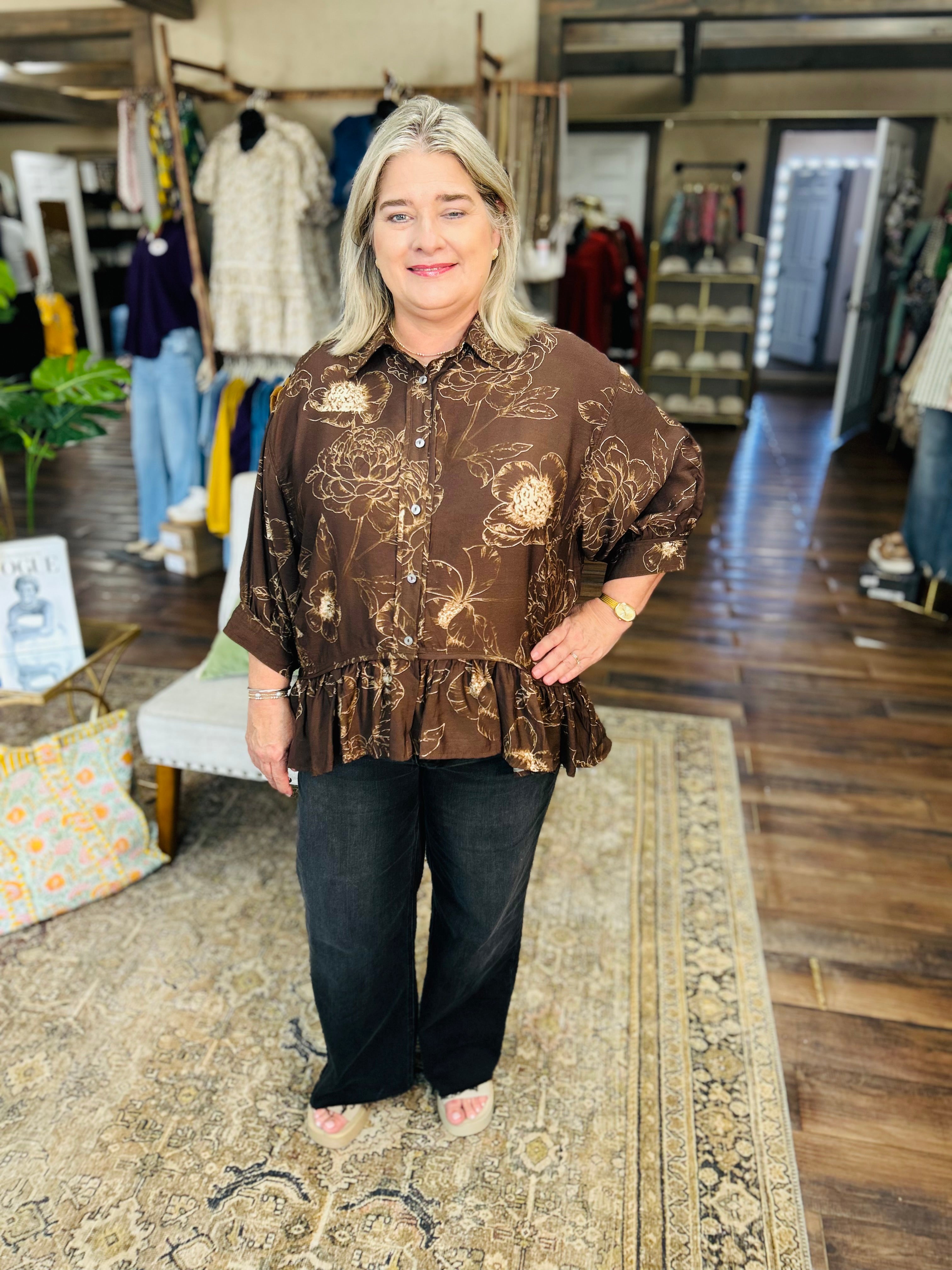 The Golden Grove Plus is a collared button-down top that brings a playful twist with its gold floral print. Perfect for adding a touch of flair to your everyday wardrobe, this top effortlessly combines classic style with a lively, floral pattern that’s sure to brighten your day.