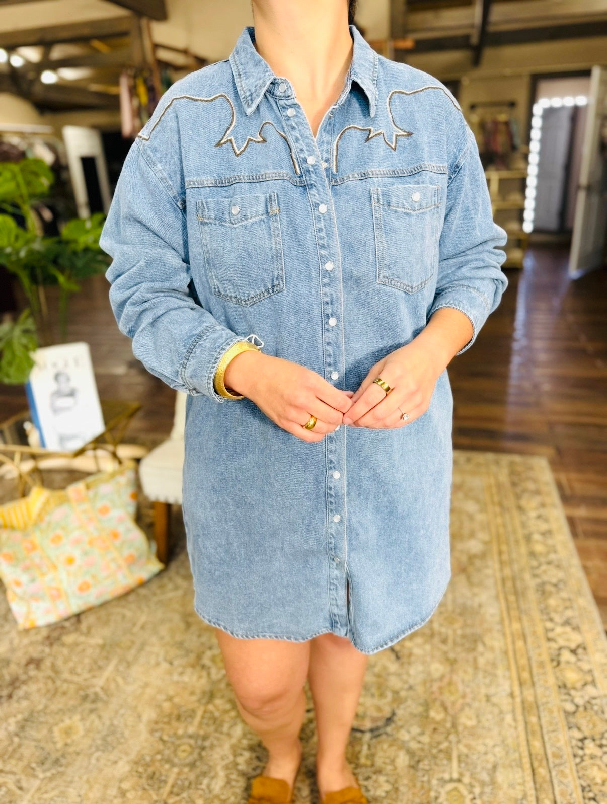 Bring a touch of vintage charm to your wardrobe with the Ranchland Rodeo denim mini dress. Featuring a soft mineral wash and a beautifully embroidered yoke, this playful dress blends rugged style with delicate detail. Perfect for sunny days or casual nights, it’s easy to wear and impossible to ignore.