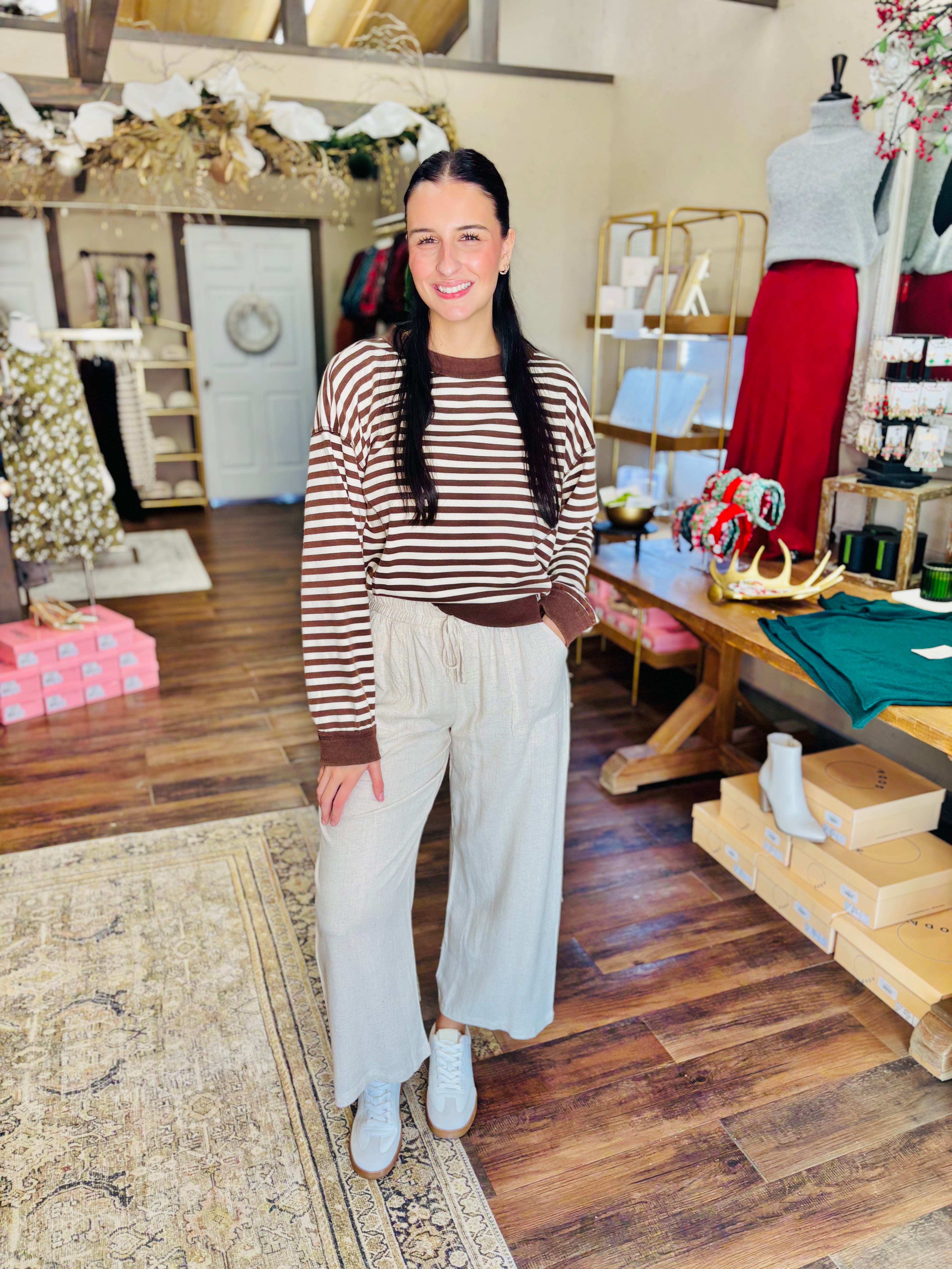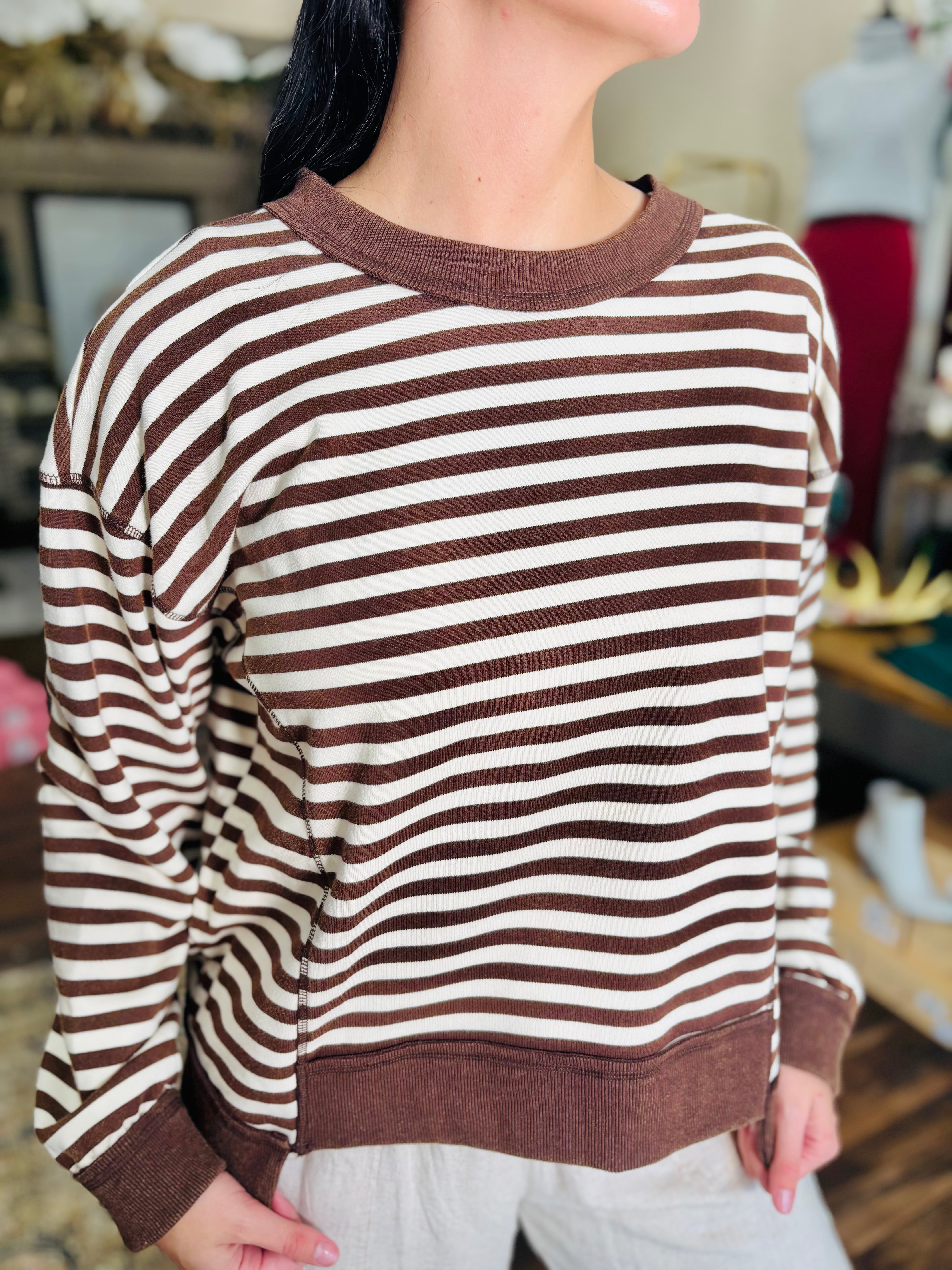 This charming brown and cream striped top is perfect for layering or wearing solo. The classic stripe pattern brings a timeless preppy vibe to any outfit. The soft, comfortable fabric makes it ideal for casual days when you want to look effortlessly put-together. Mix and match with your favorite bottoms for endless styling possibilities that feel fresh and fun.