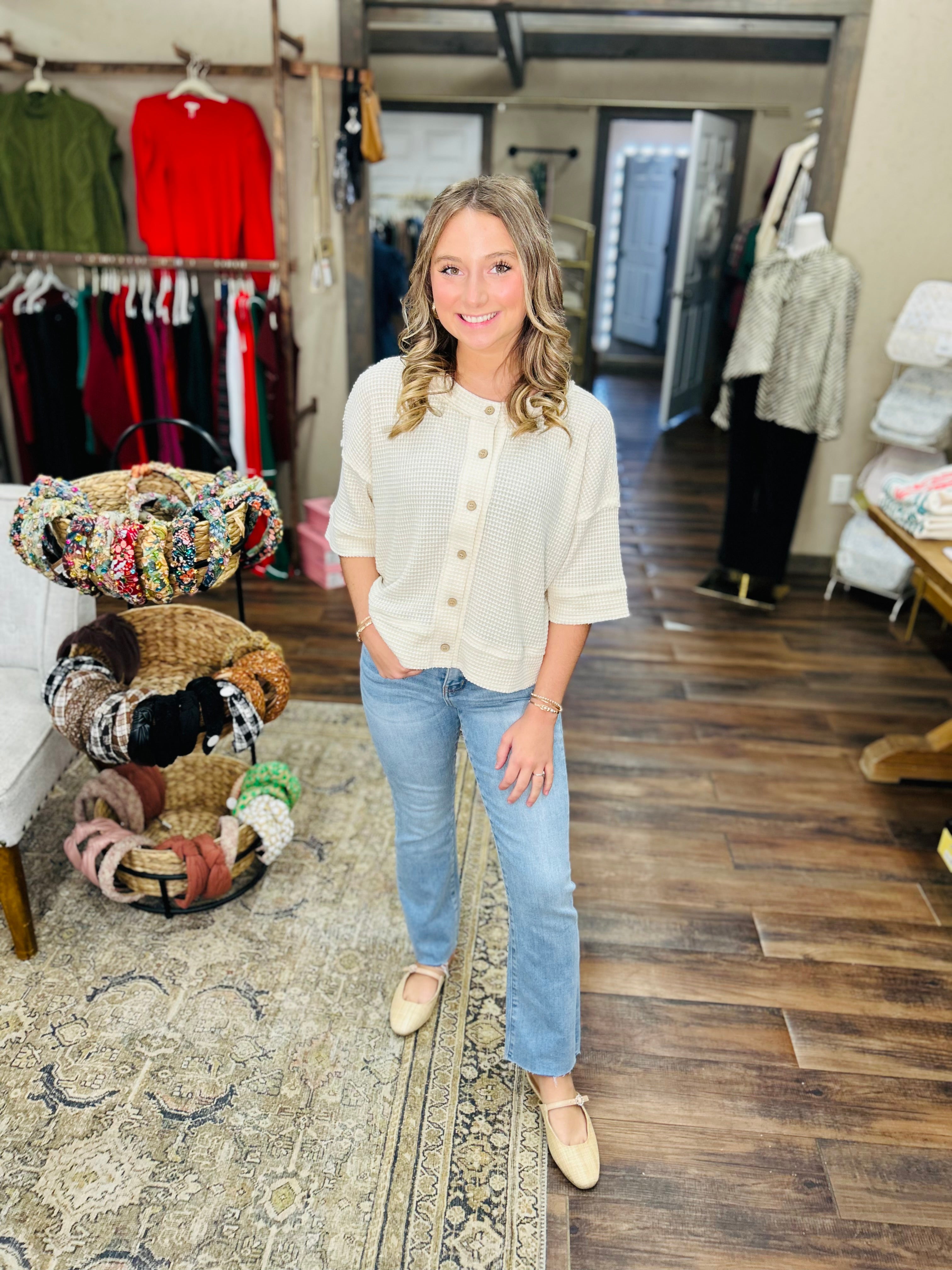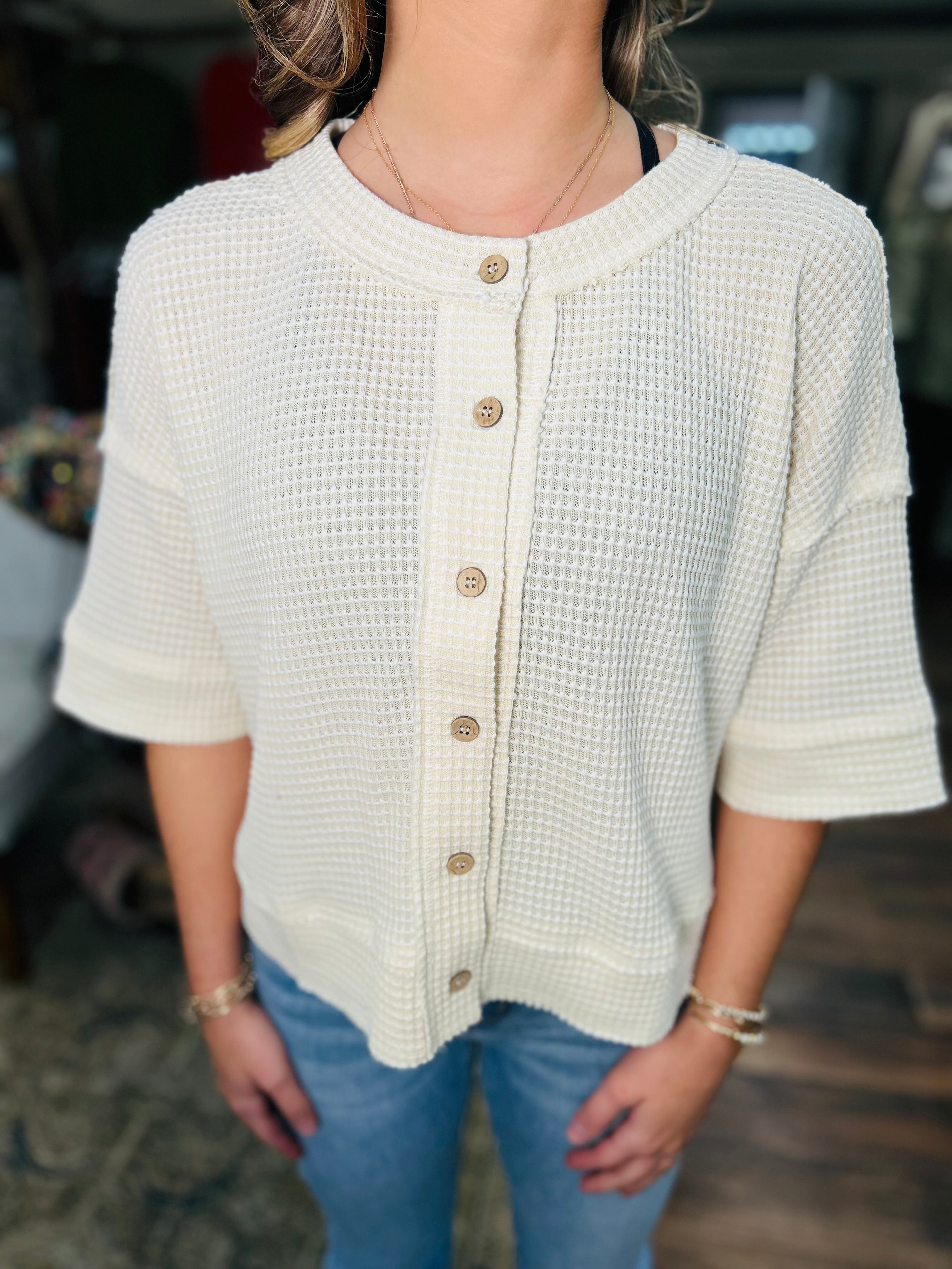 Elevate your casual wardrobe with this charming waffle knit cardigan—the perfect layer for breezy days and laid-back vibes. Crafted from soft, textured waffle knit fabric, it features a classic wood button closure and short sleeves that transition seamlessly from season to season. Whether you're heading to brunch or running errands, this versatile piece pairs effortlessly with everything in your closet. Cozy comfort meets timeless style in one irresistible cardigan.