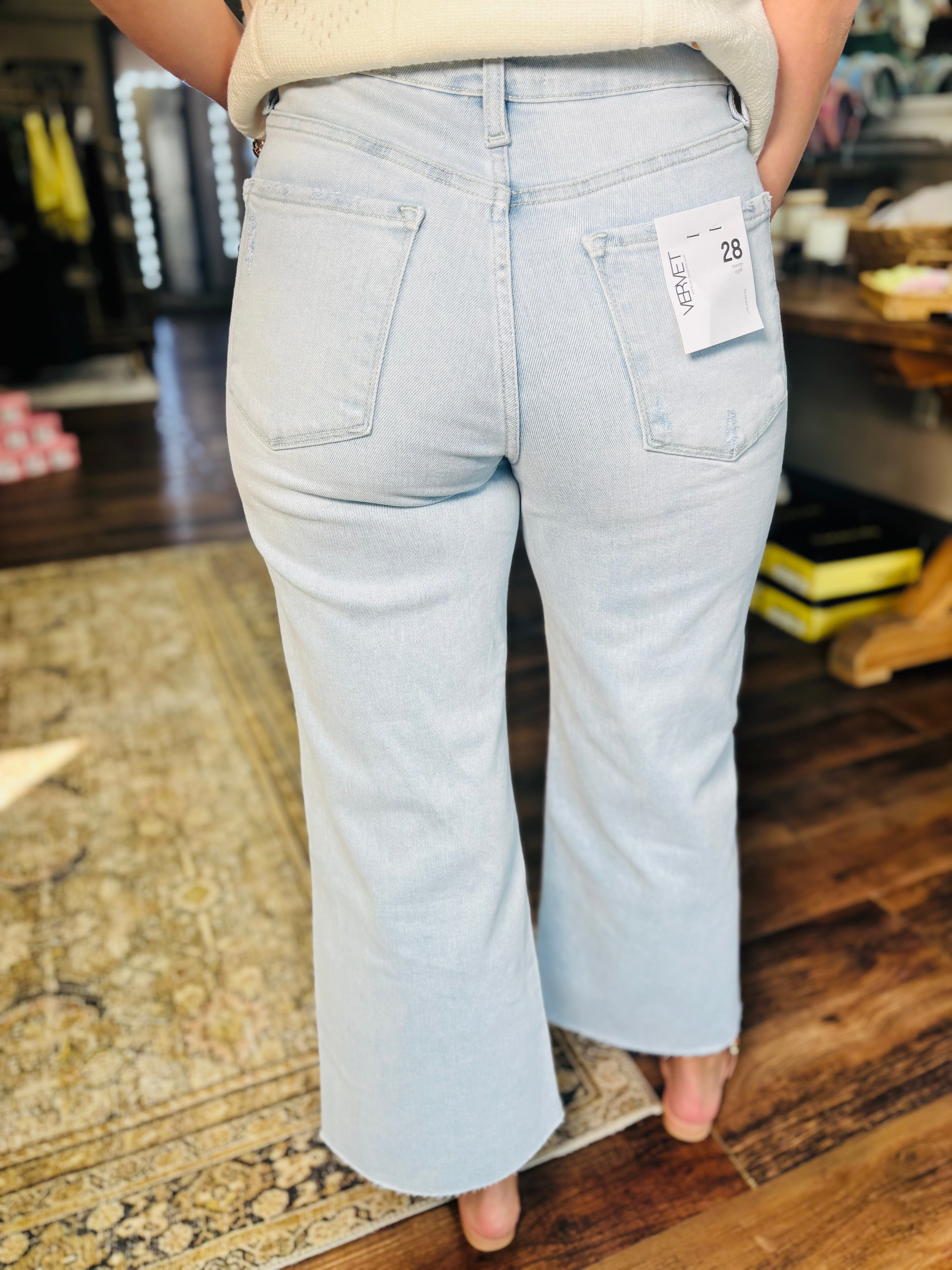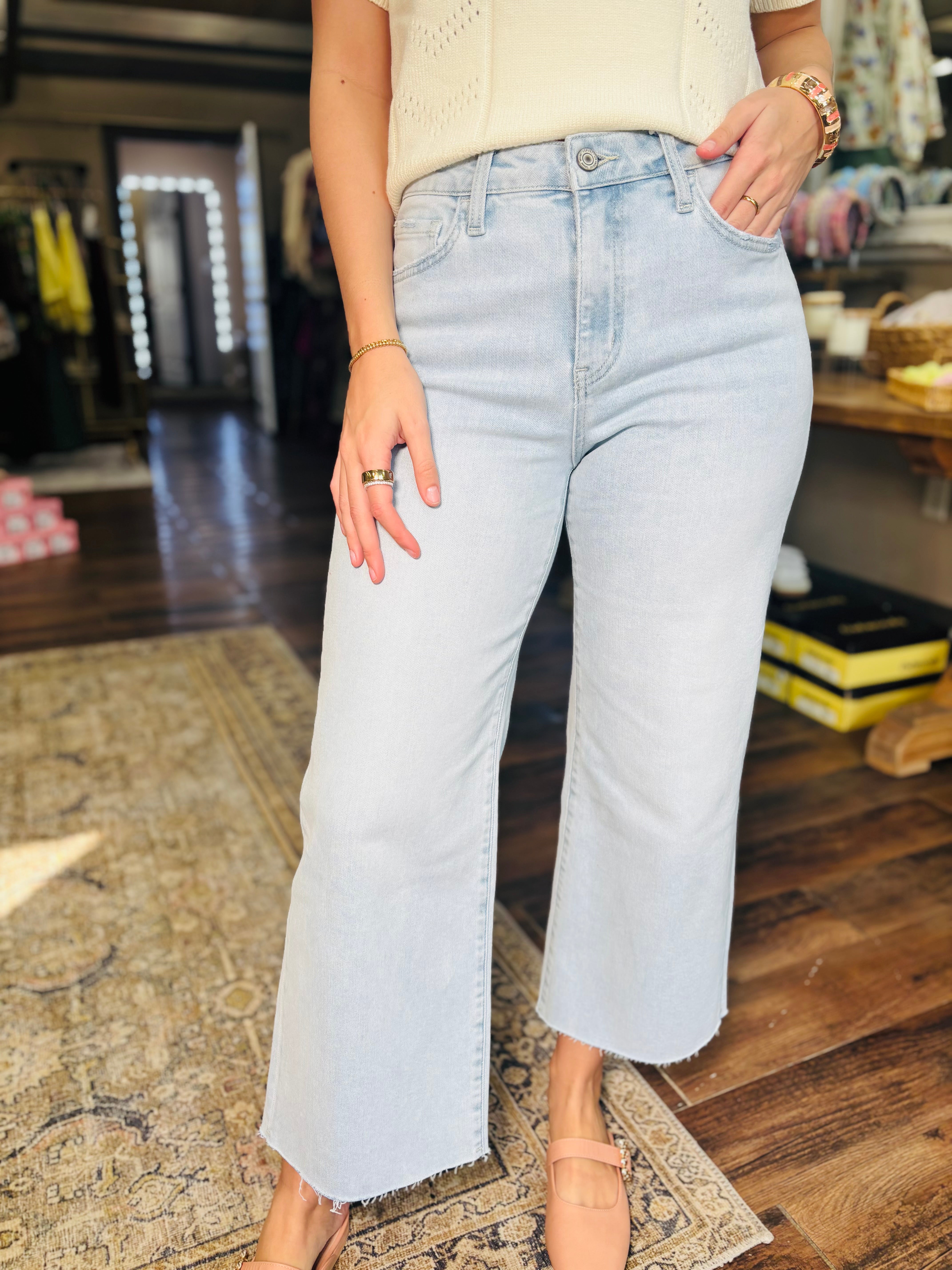 These Olivia Jeans feature a high-rise waist and wide-leg silhouette crafted from light denim, offering a modern yet timeless look. Designed for comfort and style, they provide a flattering fit that elongates the legs while maintaining ease of movement. Ideal for both casual and polished outfits, these jeans combine classic denim durability with contemporary fashion sensibility.
