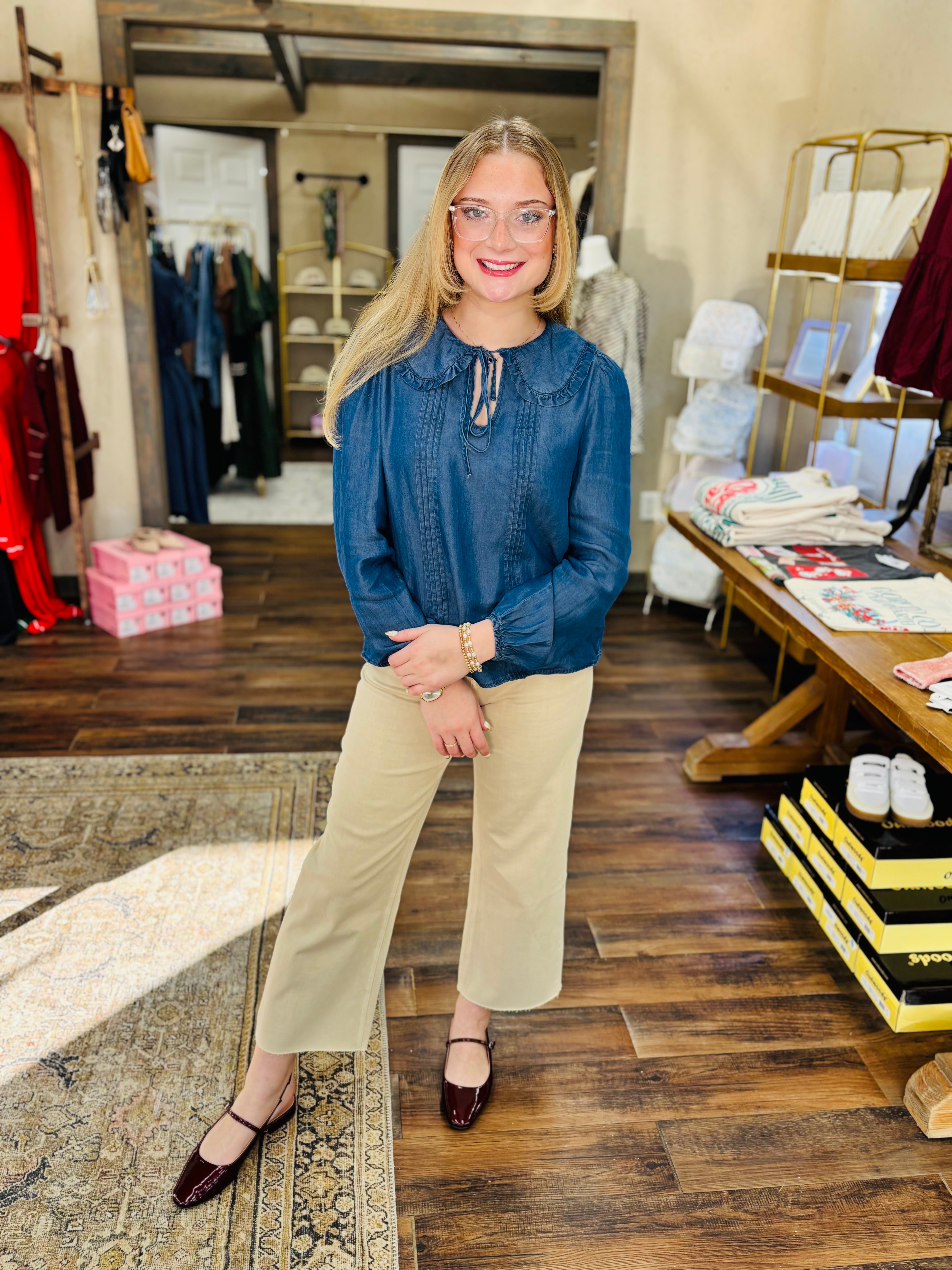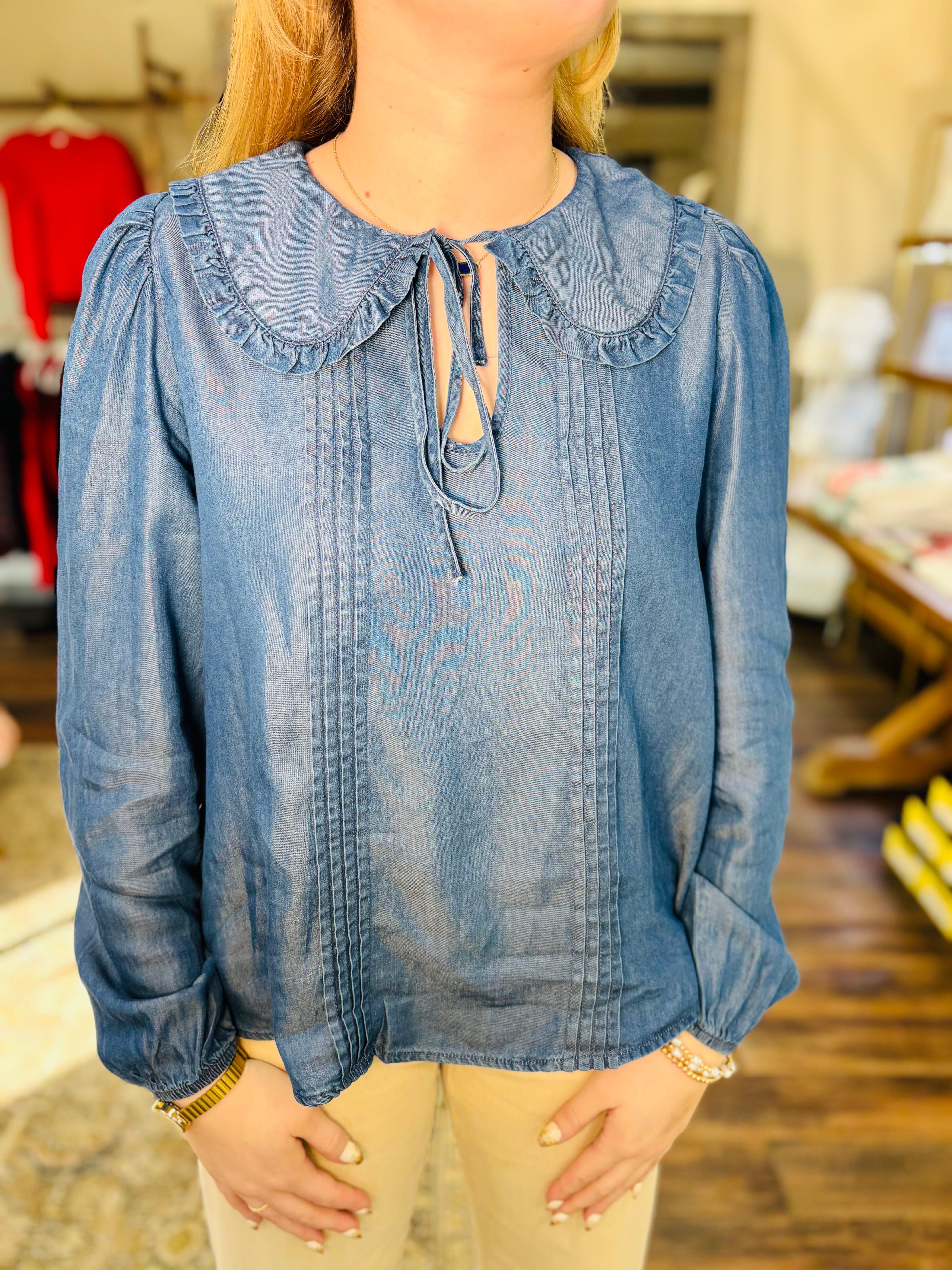 Elevate your everyday style with this downtown-chic denim top featuring a crisp collar and sophisticated pintuck detailing. The long sleeves offer versatile layering potential, while the structured denim fabric keeps you looking polished from morning meetings to evening outings. A modern twist on a classic silhouette—perfect for those who love timeless pieces with a contemporary edge. Dress it up with tailored trousers or down with your favorite jeans for effortless, all-day wear.