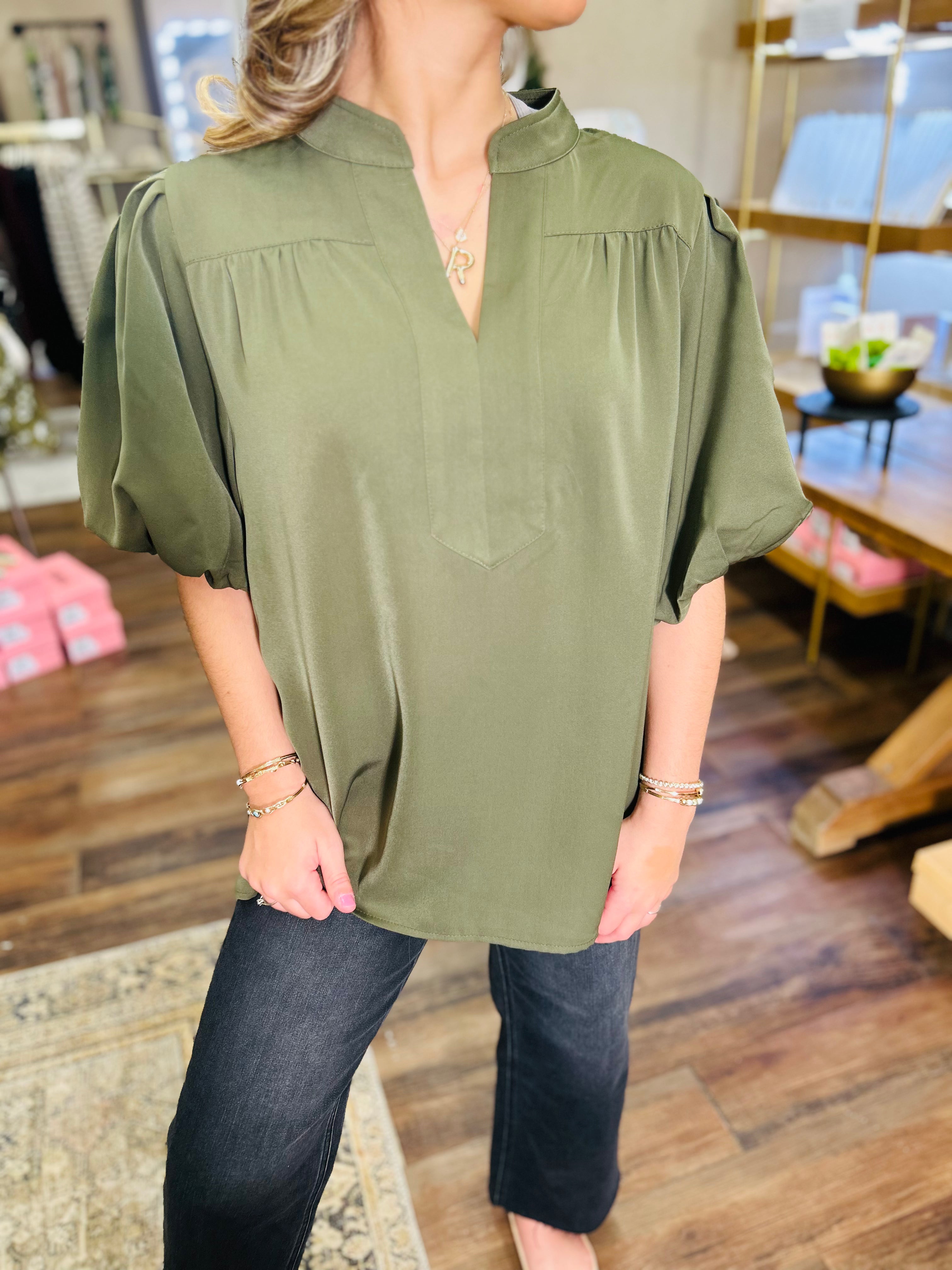Step into effortless charm with the EMBRACING EVERGREEN top. Its elevated olive green hue pairs perfectly with playful puff sleeves and a flattering V-neck, adding a touch of whimsy to your everyday look. Lightweight and comfortable, this top brings a fresh twist to your wardrobe essentials.