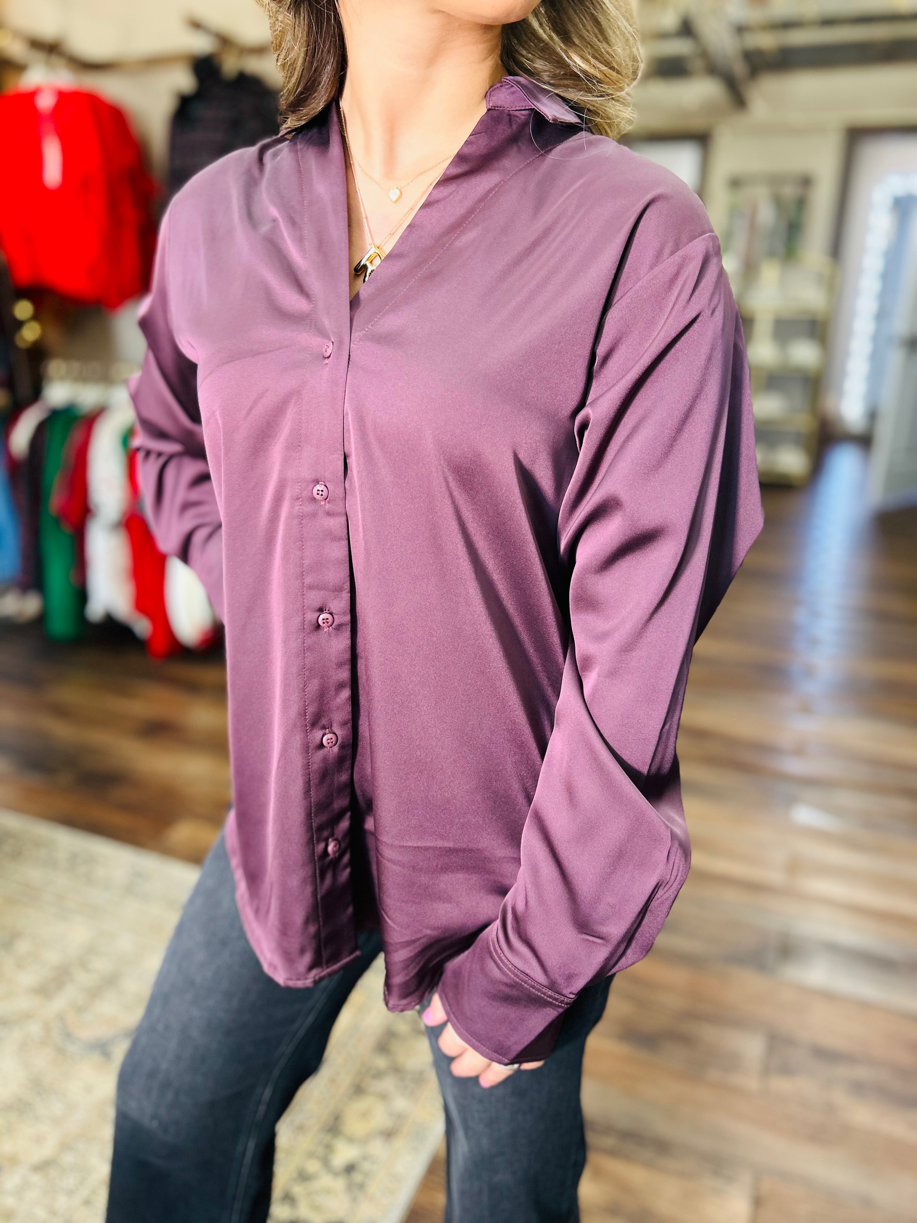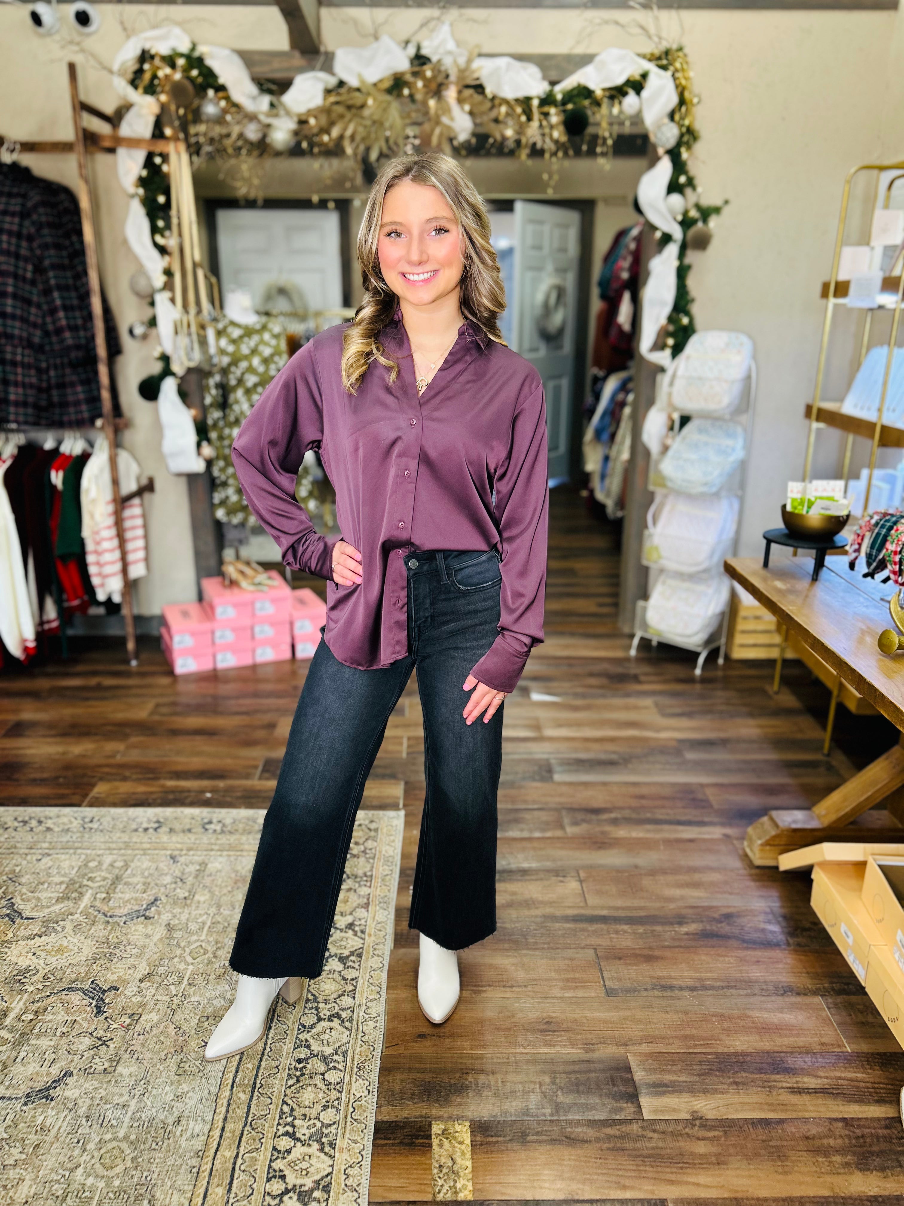 Elevate your everyday style with the Midnight Mood blouse—where silky satin meets playful charm. This long sleeve button-down offers a sleek, smooth feel that catches the light beautifully, adding a touch of elegance to your look. Perfect for teasingly casual days or dressing up after dark, its timeless design ensures you feel effortlessly chic and ready for any adventure. Slip it on and let your style steal the spotlight.