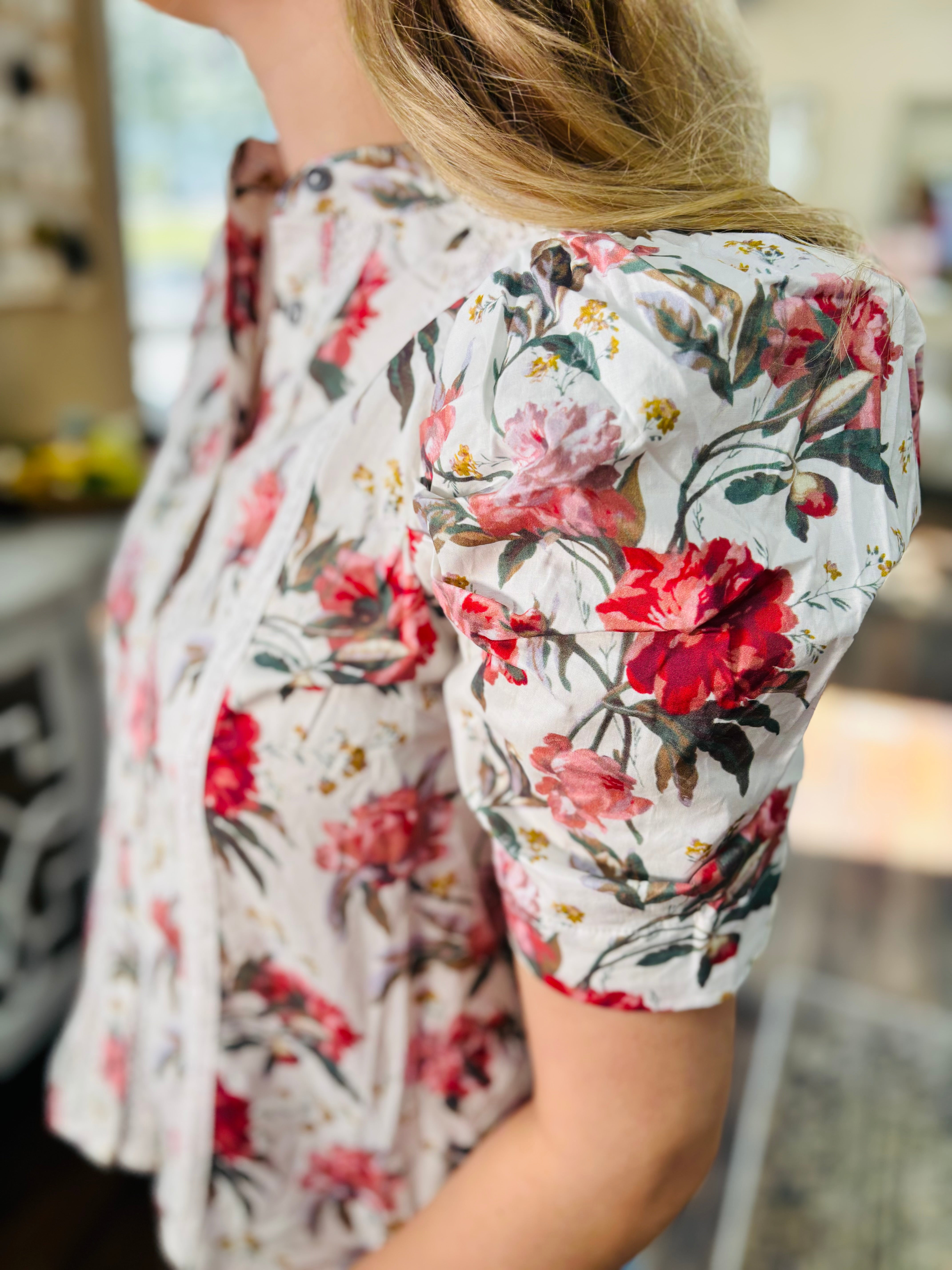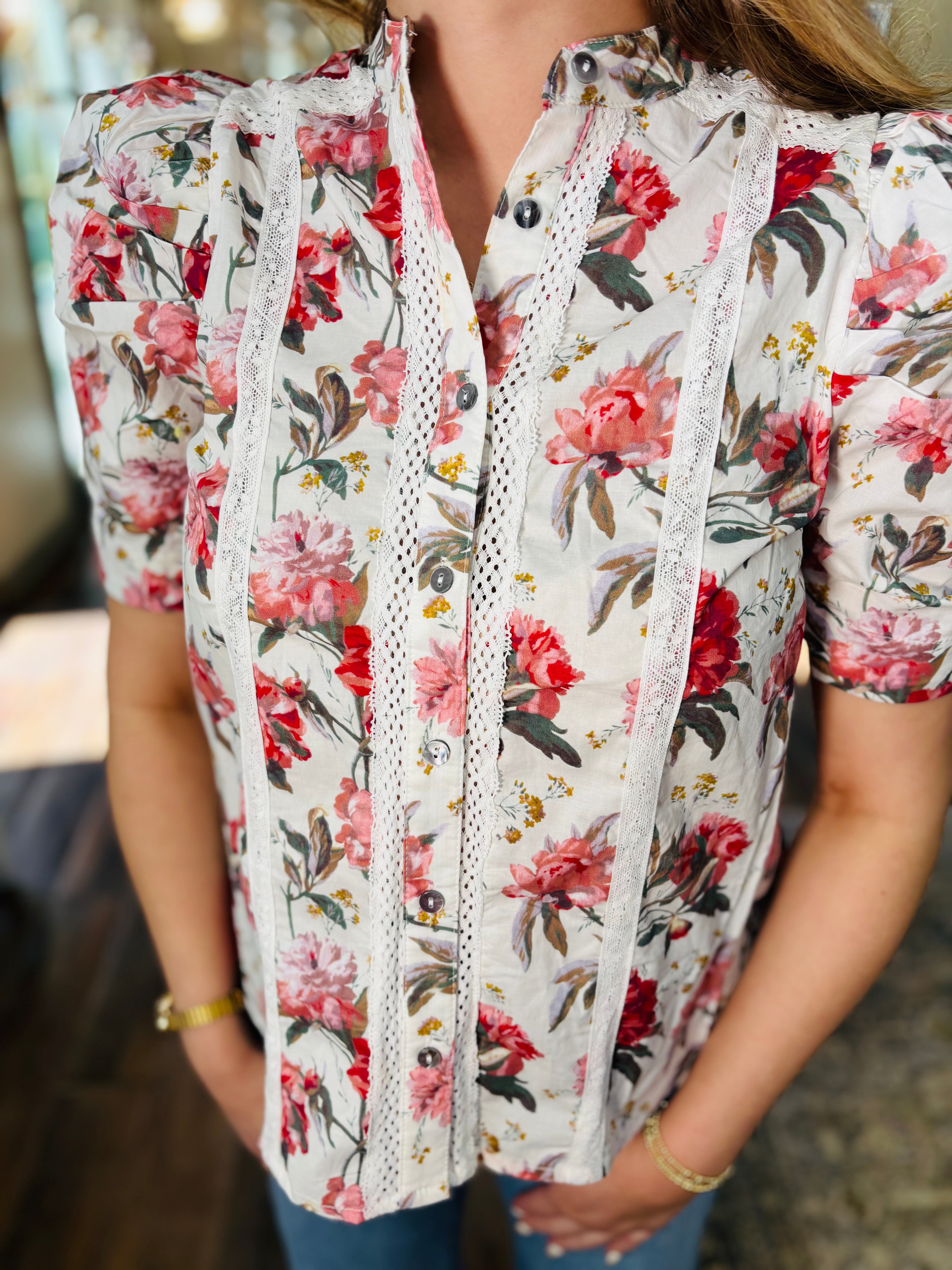 Bloom in style with this charming white top adorned with delicate pink flowers and romantic lace trim. Perfect for adding a touch of whimsy to your everyday wardrobe, this piece effortlessly blends feminine details with modern flair. The soft floral print brings springtime vibes year-round, while the intricate lace accents elevate your look with subtle elegance. Whether you're dressing up for brunch or keeping it casual, this versatile top is your go-to for looking effortlessly put-together.