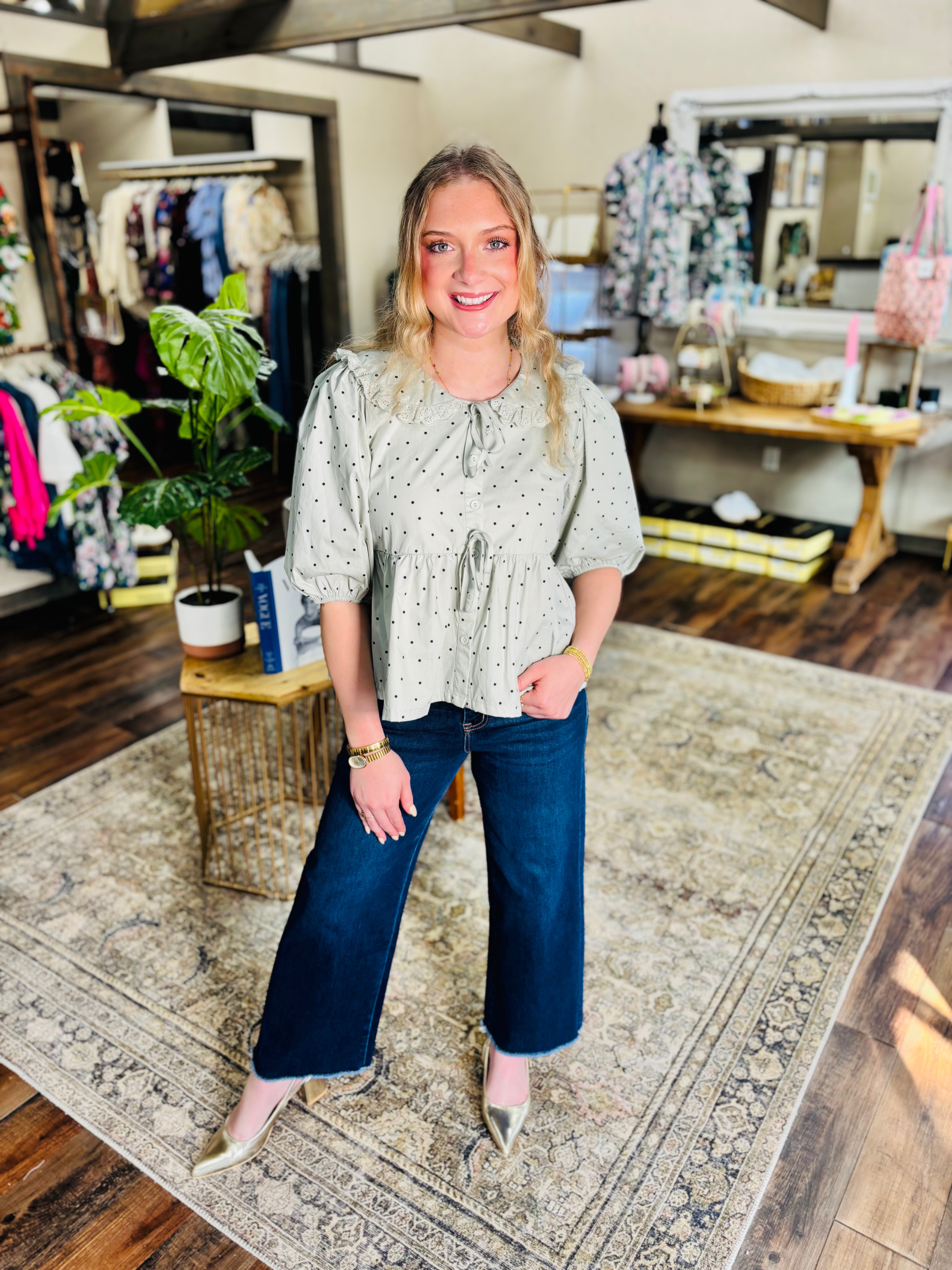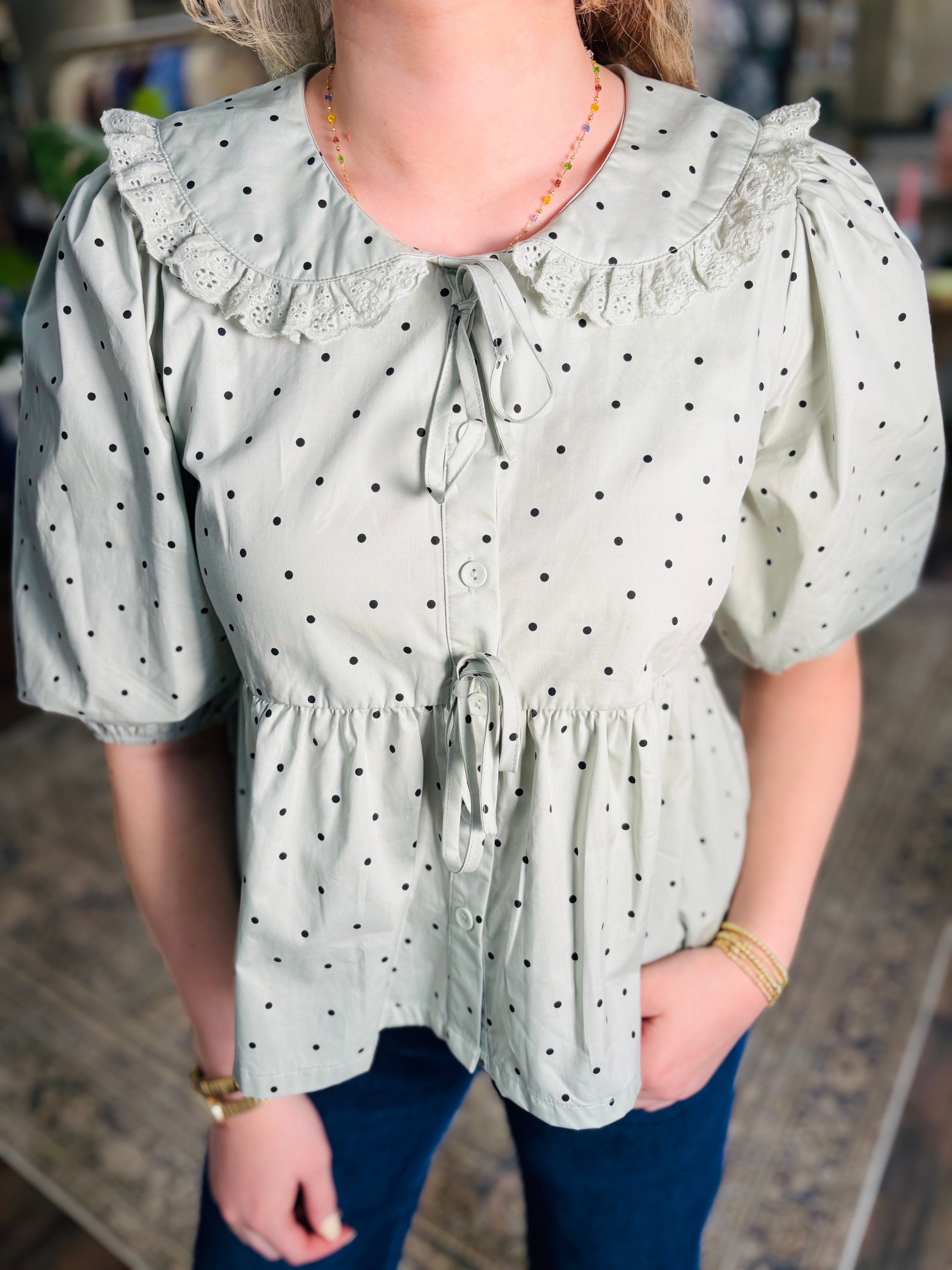 Elevate your everyday style with our charming Polka Dot Poise blouse—a delightful twist on classic sophistication. This half-sleeve wonder features a timeless polka dot woven pattern in soft light slate, paired with a vintage-inspired doll collar and a cheeky front bow tie that adds instant personality. Perfect for brunch dates, office days, or whenever you want to sprinkle a little whimsy into your wardrobe. Comfortable, versatile, and undeniably fun—because looking put-together shouldn't mean sacrificing playfulness.