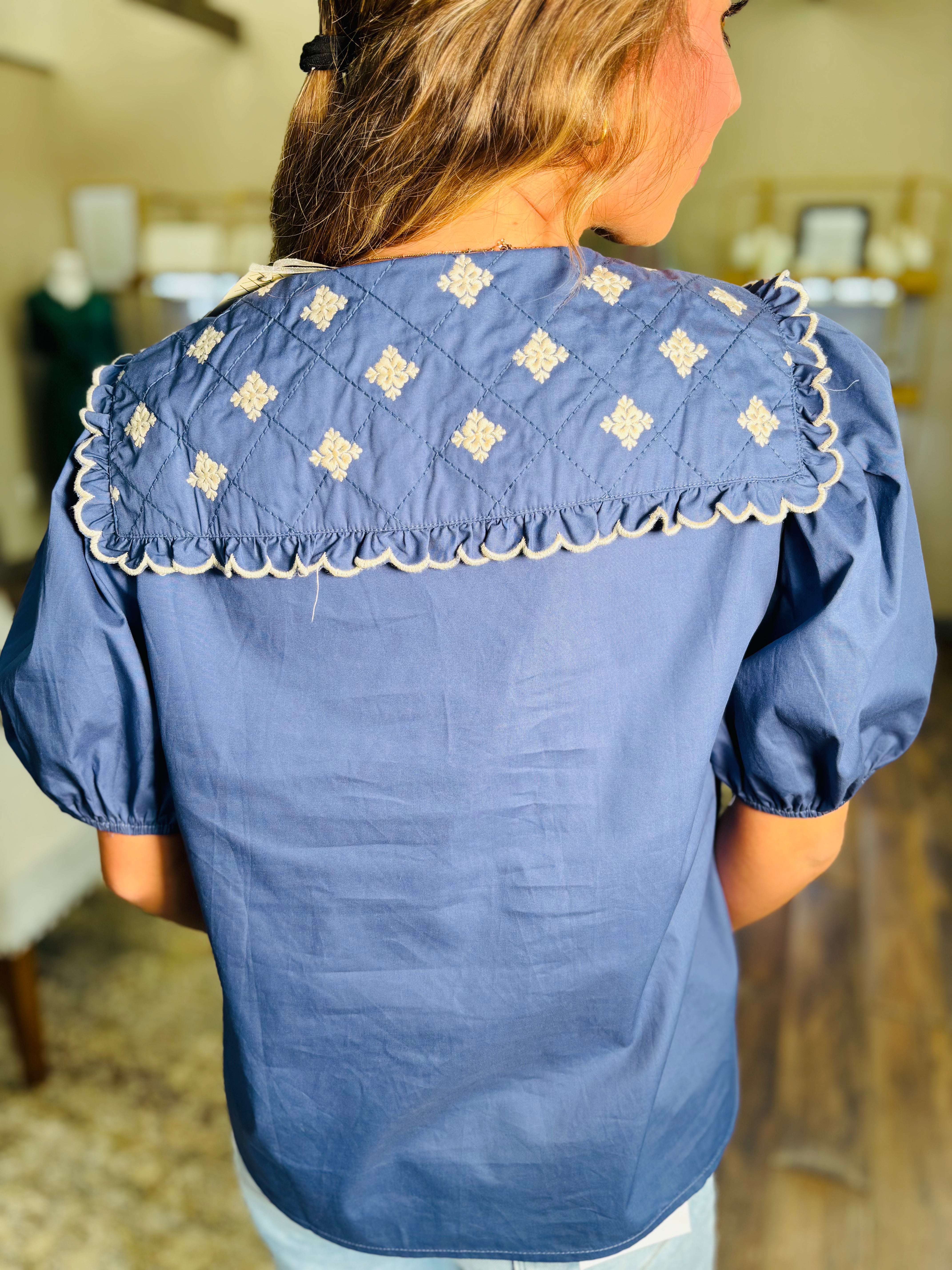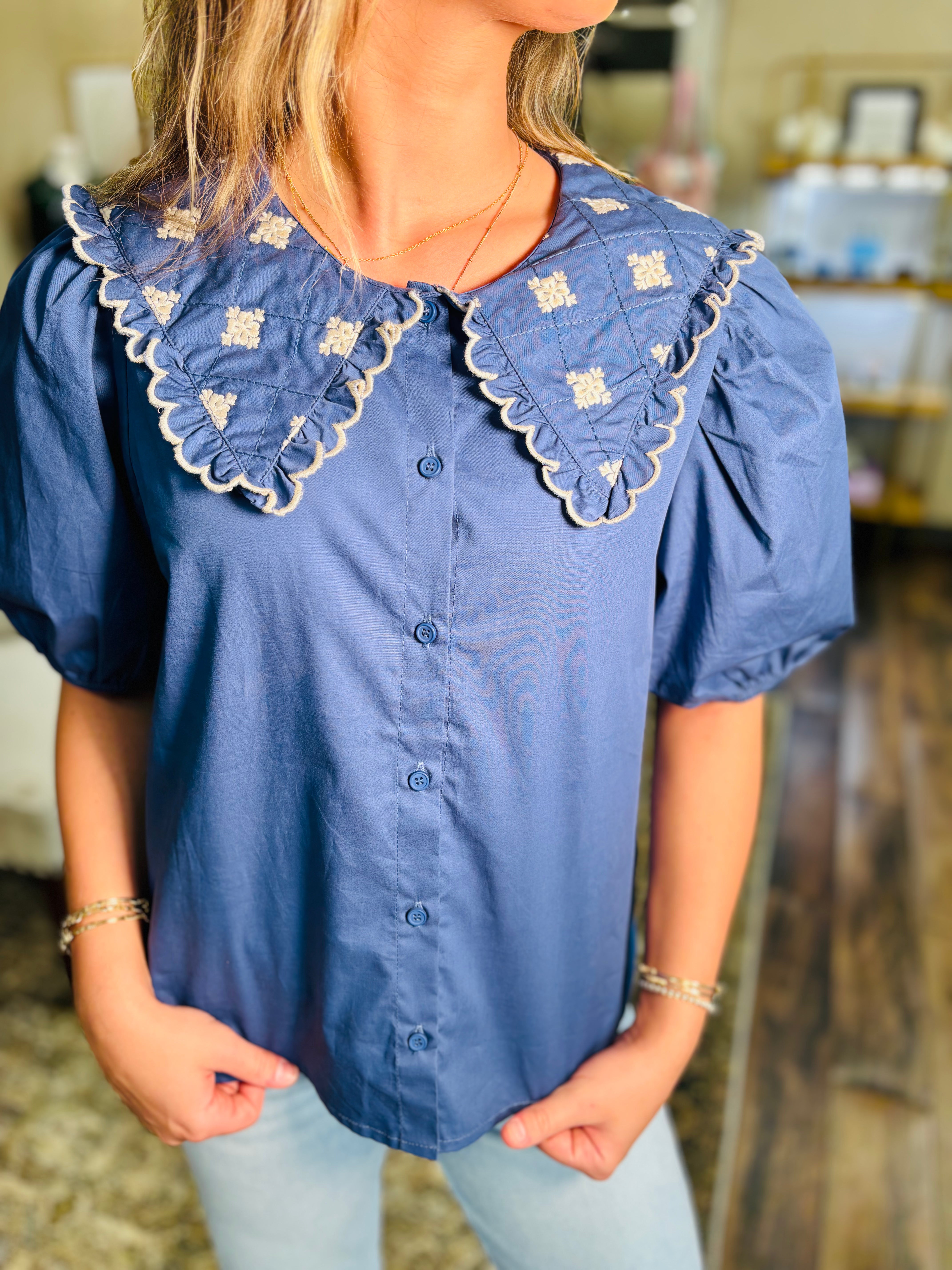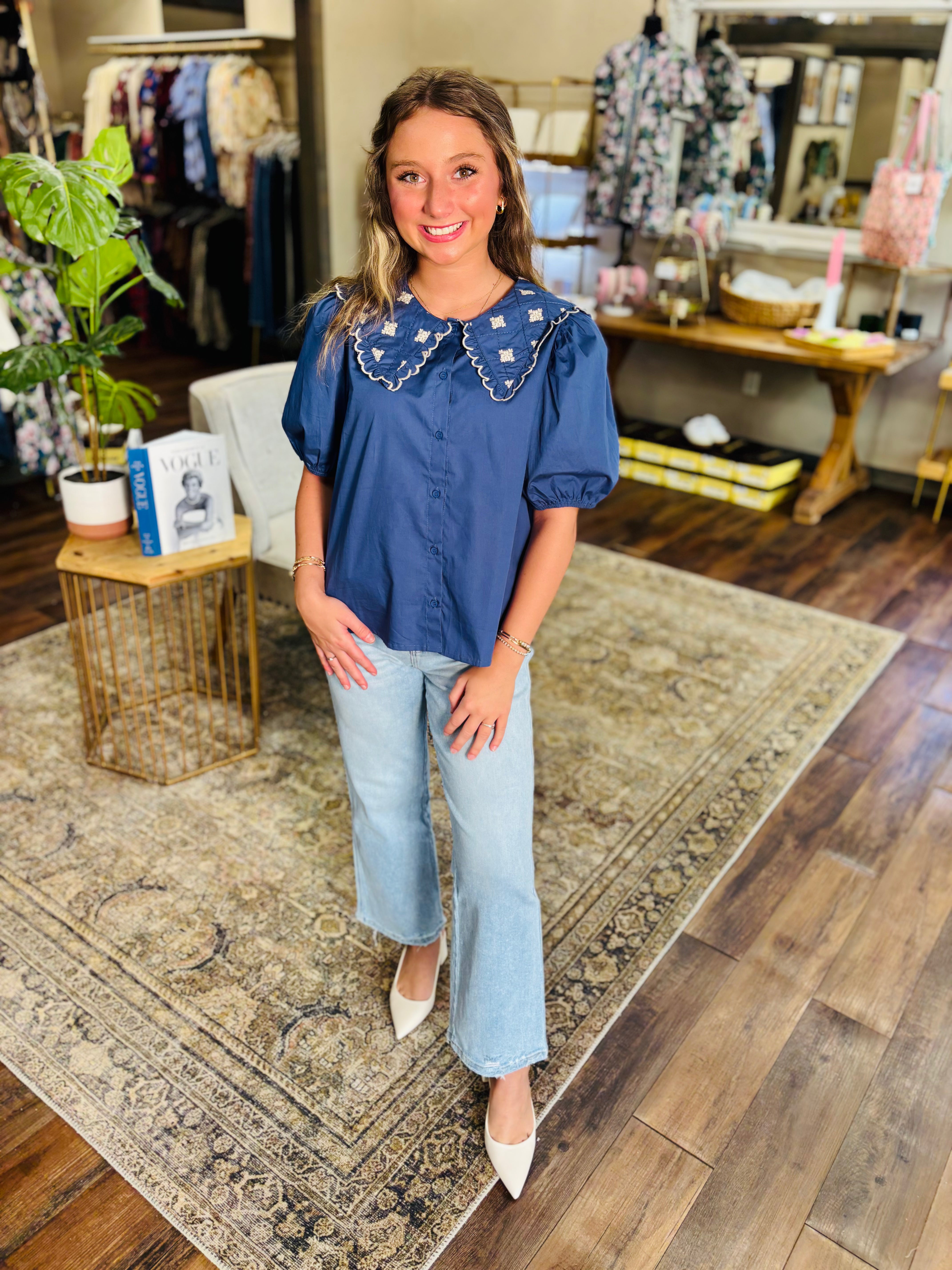 Ahoy, fashion lover! This charming navy poplin blouse brings vintage-inspired whimsy to your wardrobe with its signature Peter Pan collar adorned with delicate embroidery. The puff sleeves add a touch of romantic flair, while the classic button-down design keeps things effortlessly wearable. Perfect for channeling retro elegance with a modern twist—whether you're dressing up for brunch or adding personality to your everyday look. A timeless piece that celebrates playful sophistication.