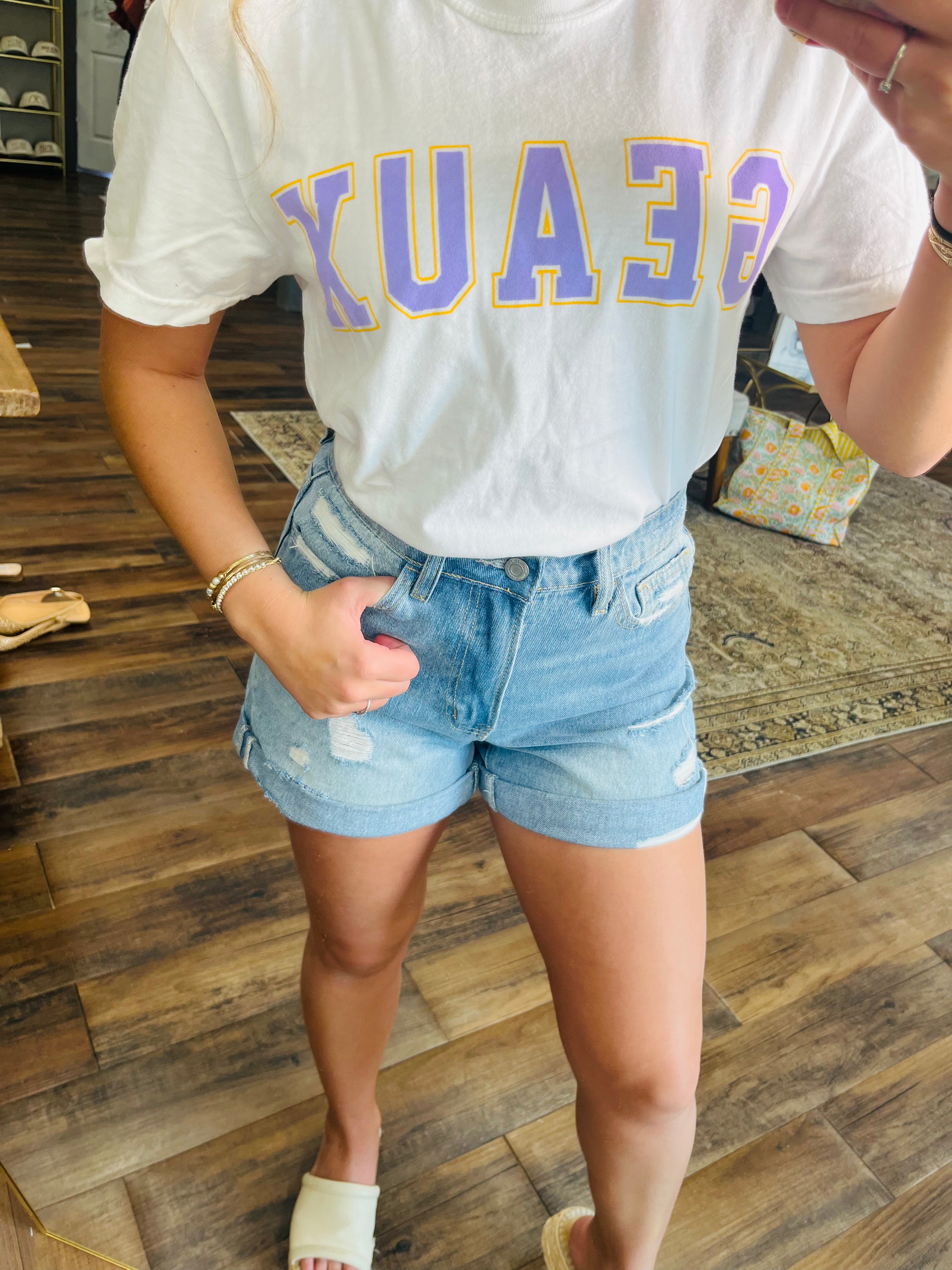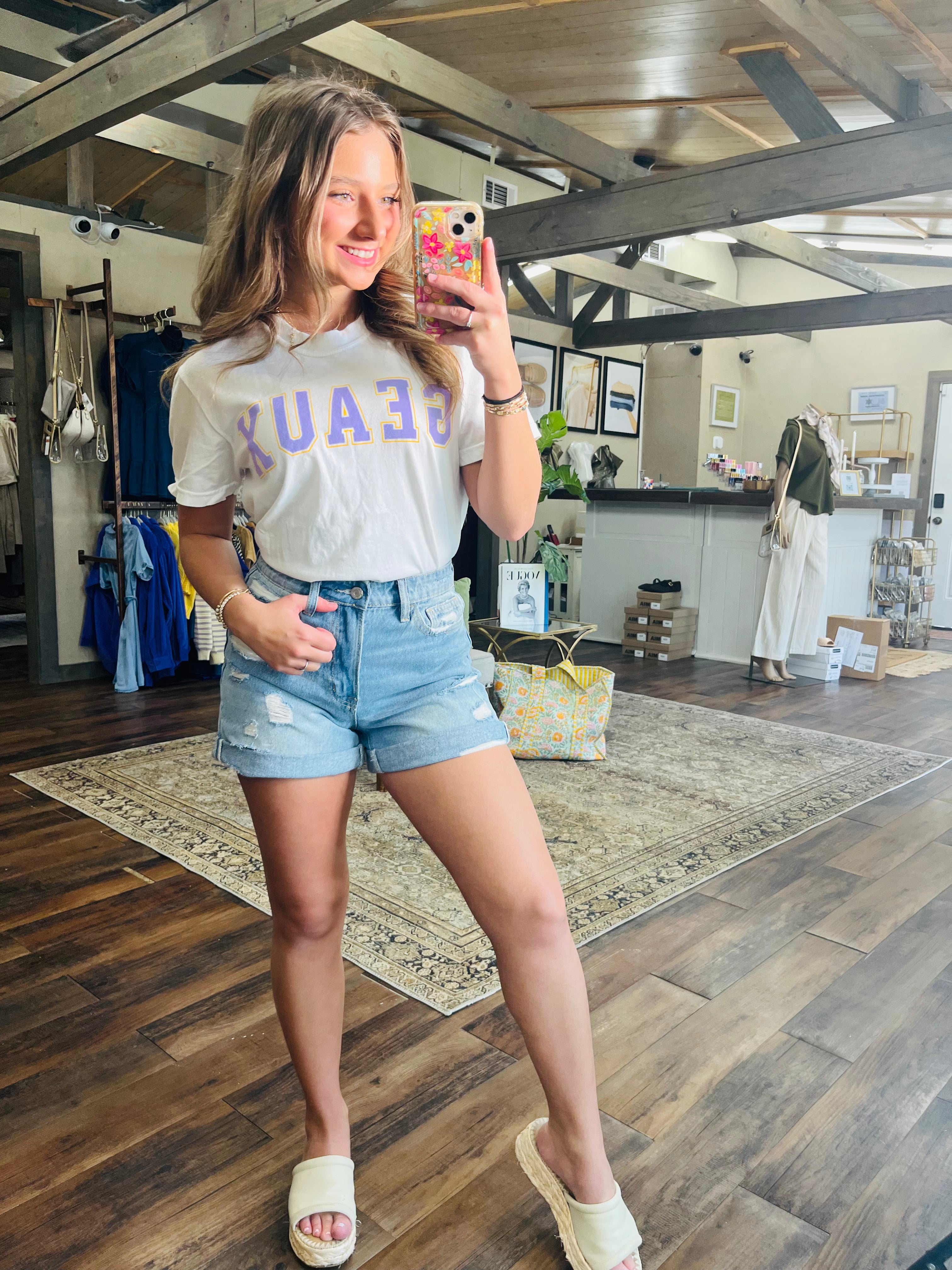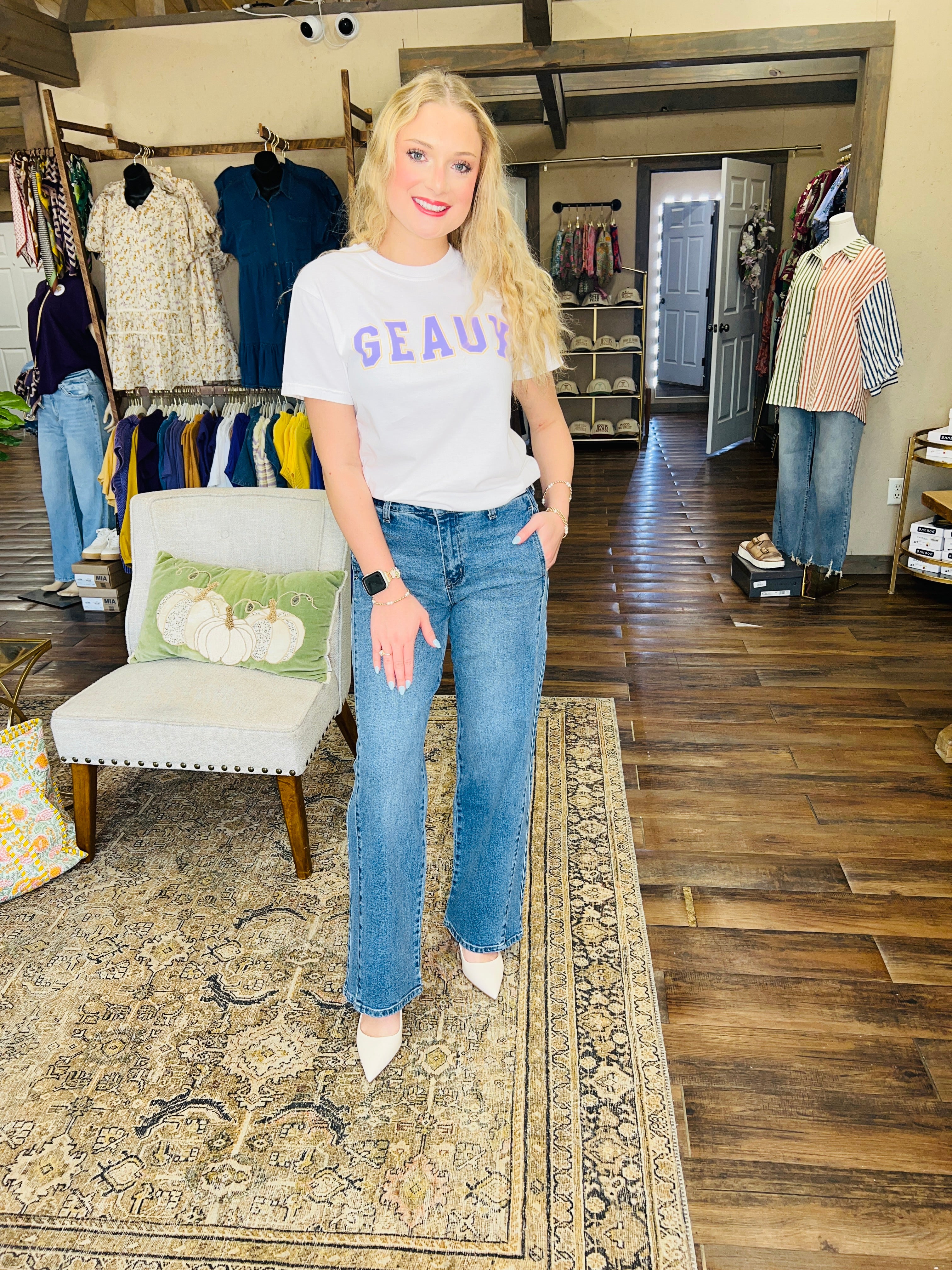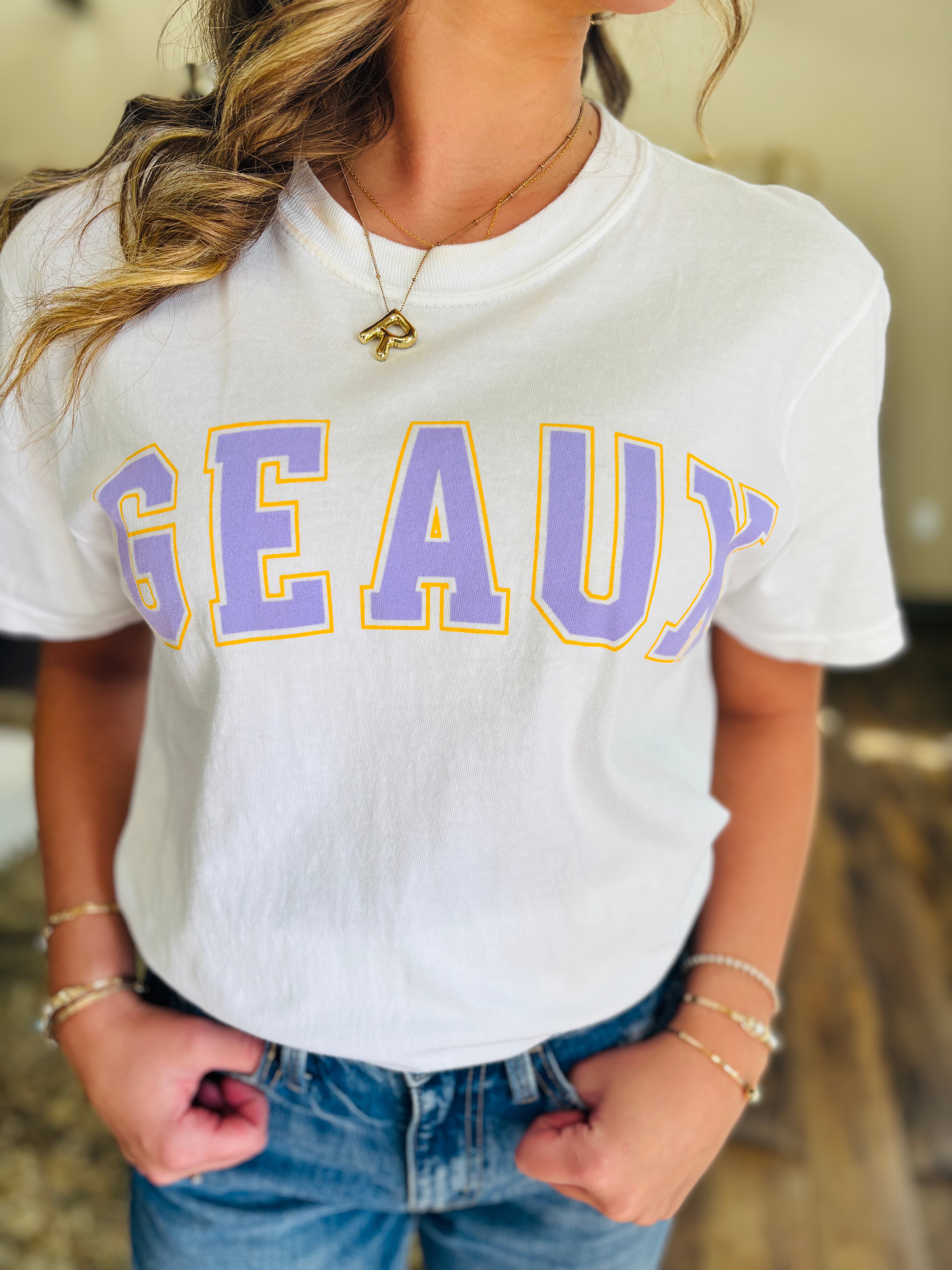Show your team spirit in the GEAUX GAMEDAY TEE! This comfy, versatile tee in white, purple, and yellow features bold Tigers and LSU vibes. Perfect to dress up or down, it’s your go-to for game day or casual fun. Ready, set, cheer!