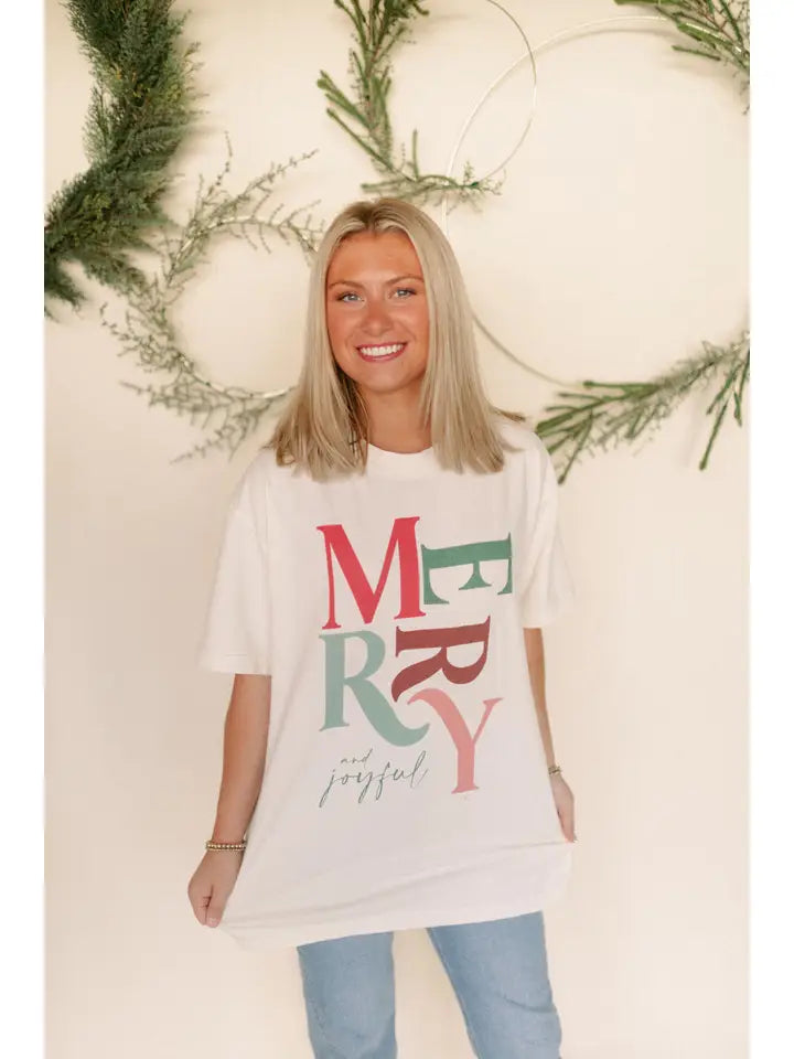 Featuring bold "Merry + Joyful" lettering, this playful design brings festive energy to your everyday wardrobe. Perfect for holiday gatherings, casual celebrations, or anyone ready to embrace the joy of the season.