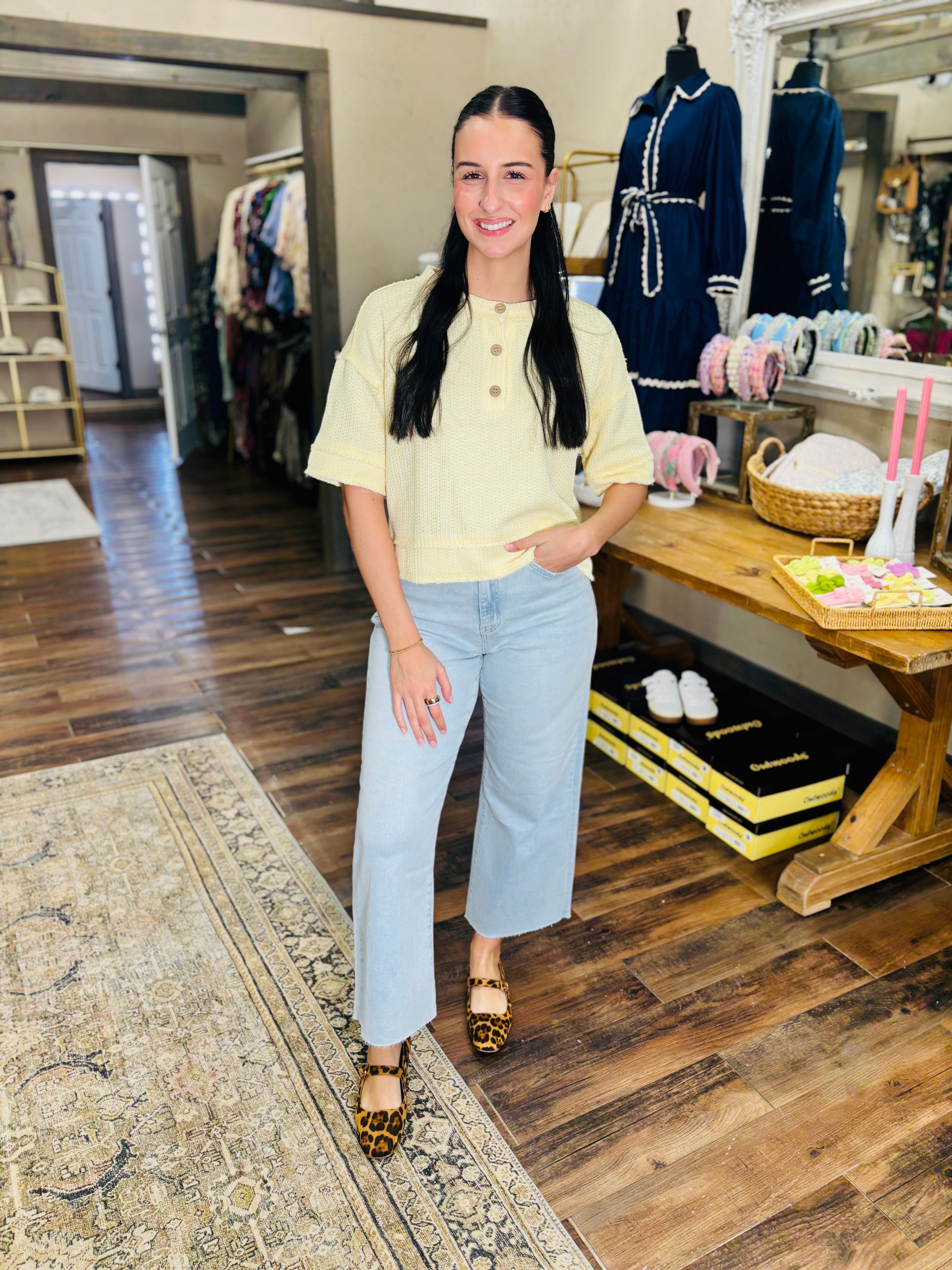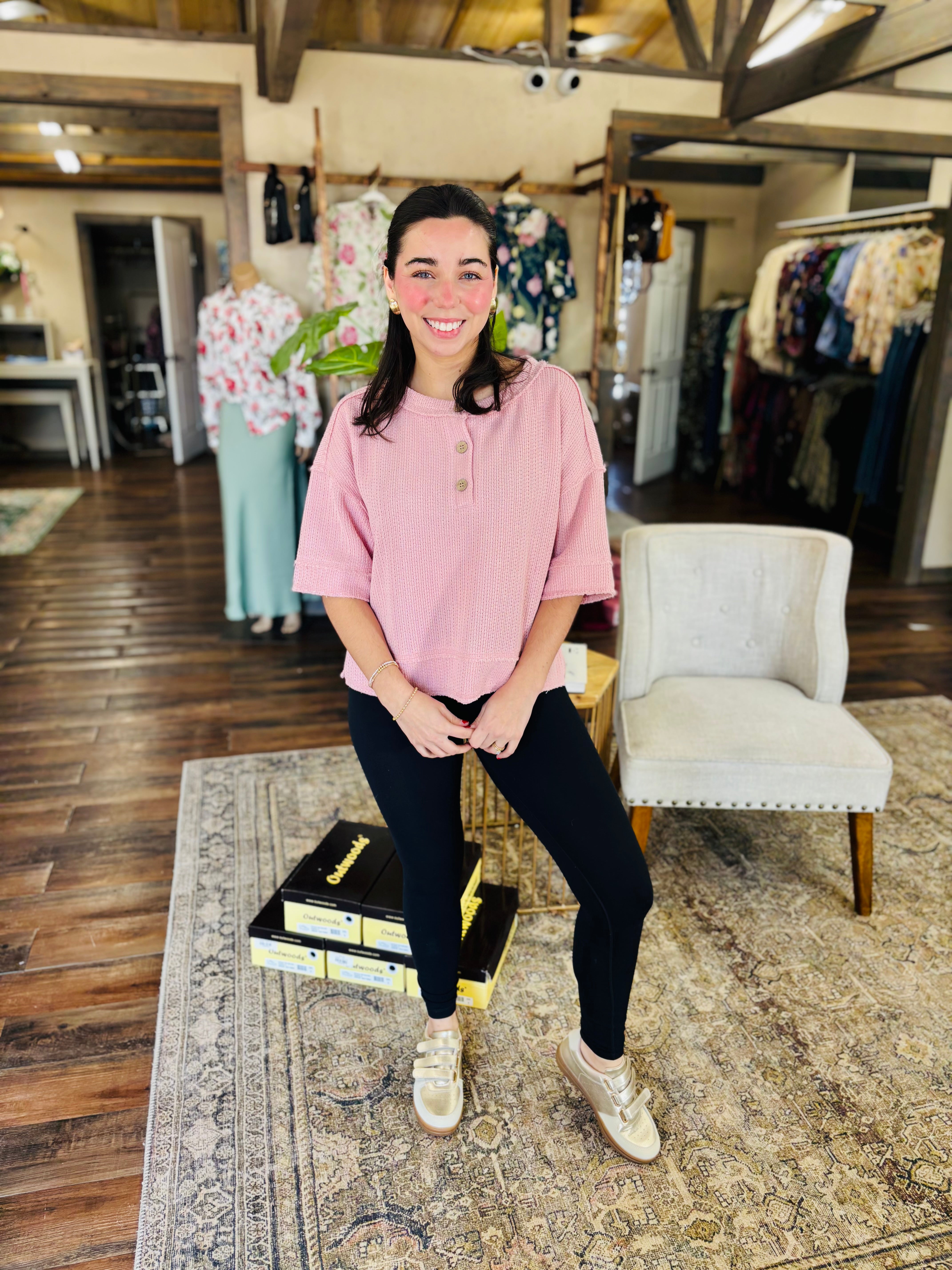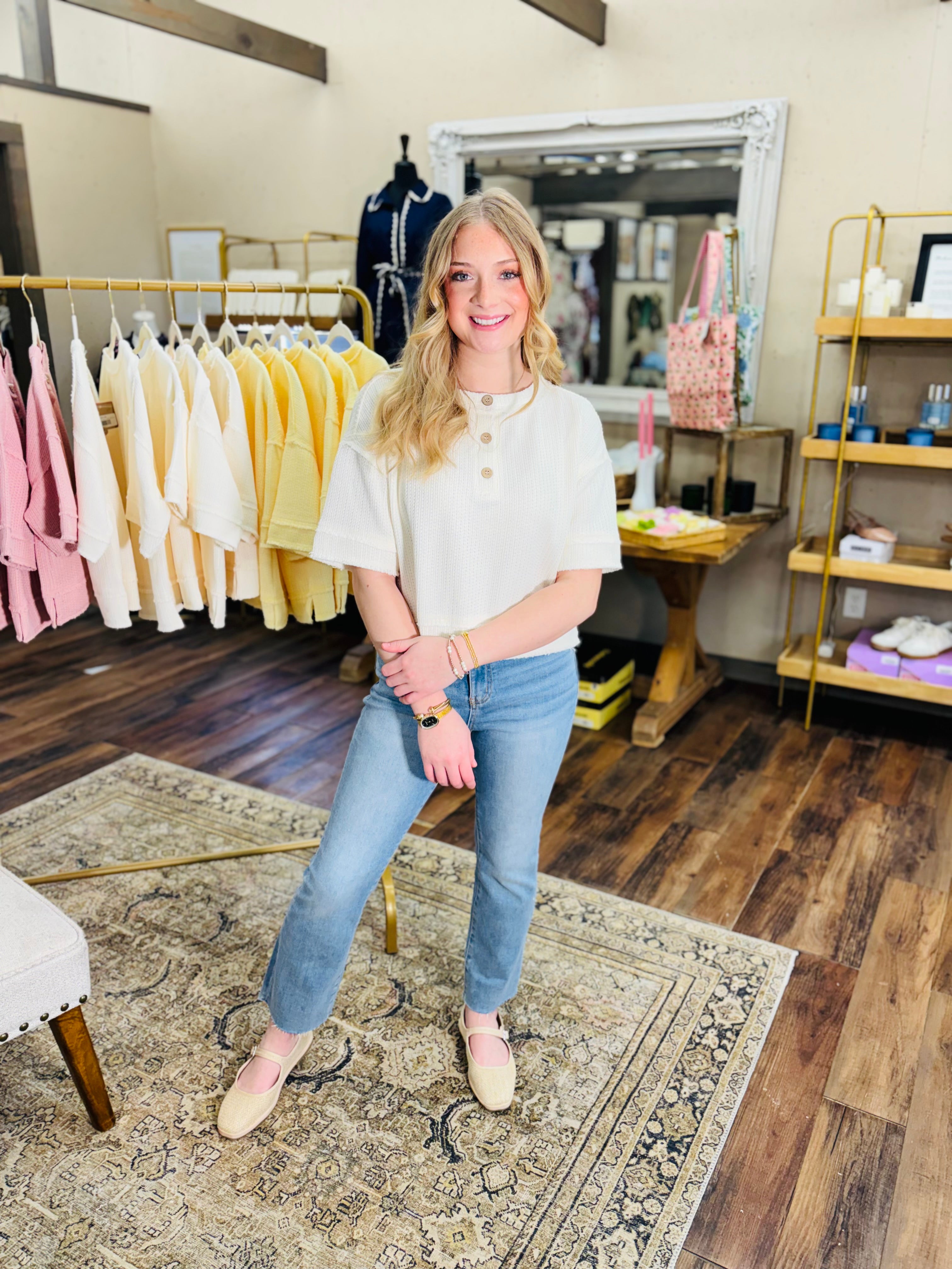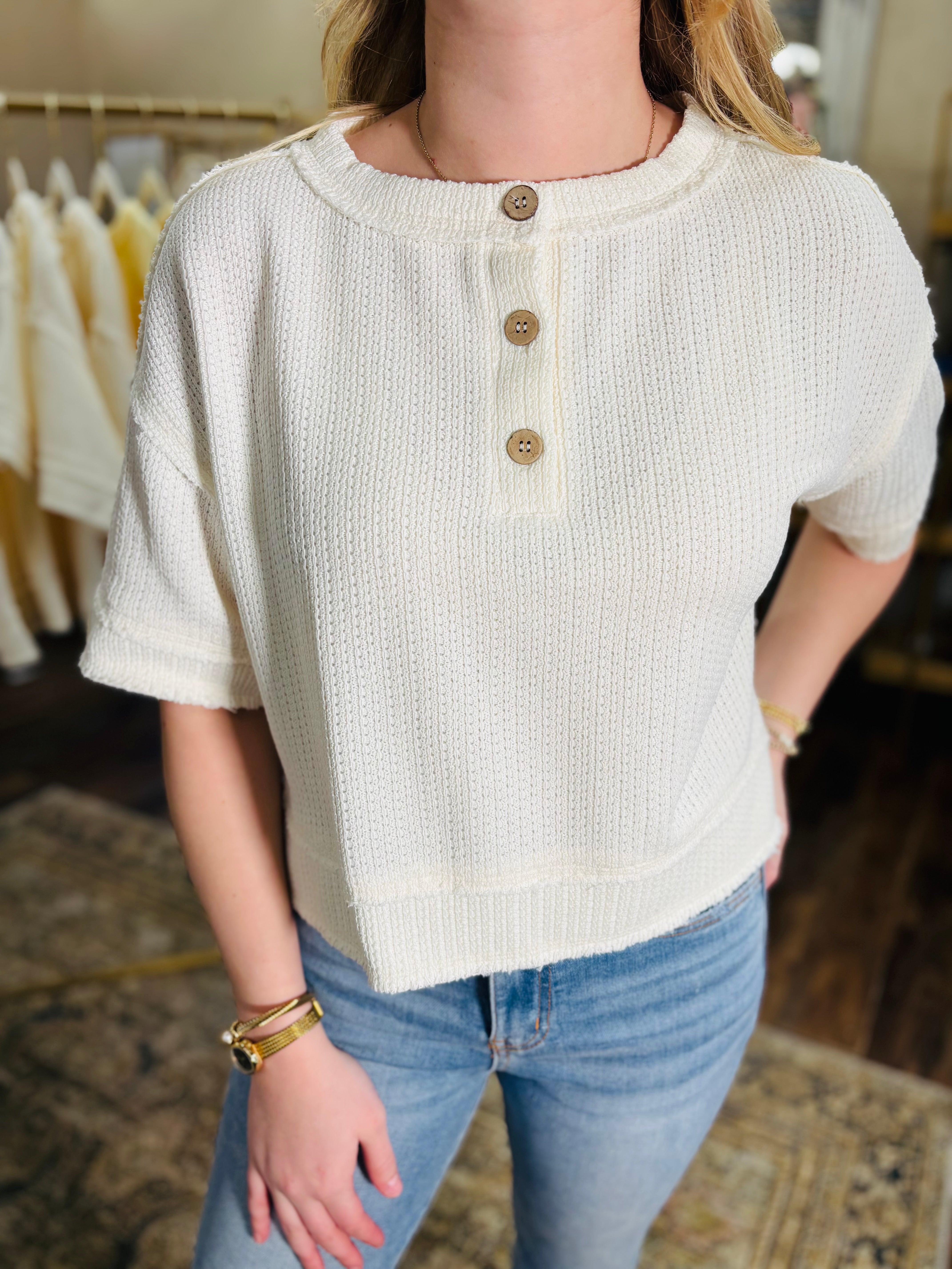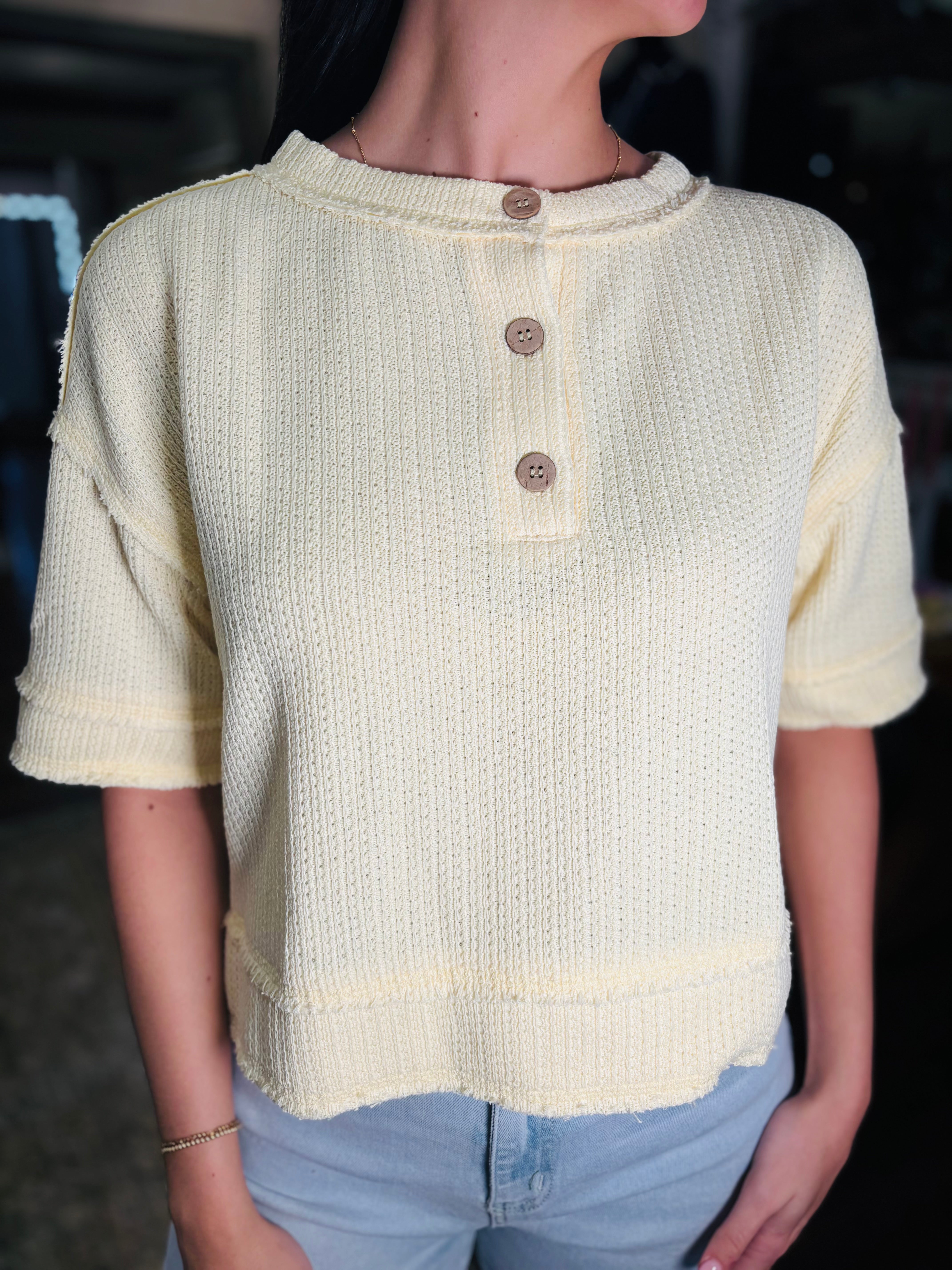 Meet your new go-to layering piece—the PASTEL BREEZE TOP. This short sleeve waffle knit top features a relaxed raw edge finish that gives it an effortlessly cool vibe. Available in dreamy cream, soft pink, and cheerful light yellow, you can mix and match to match your mood. The textured waffle knit keeps things interesting while staying breathable and comfortable for all-day wear. Whether you're pairing it with your favorite jeans or throwing it over a dress, this playful henley is ready for whatever comes your way!