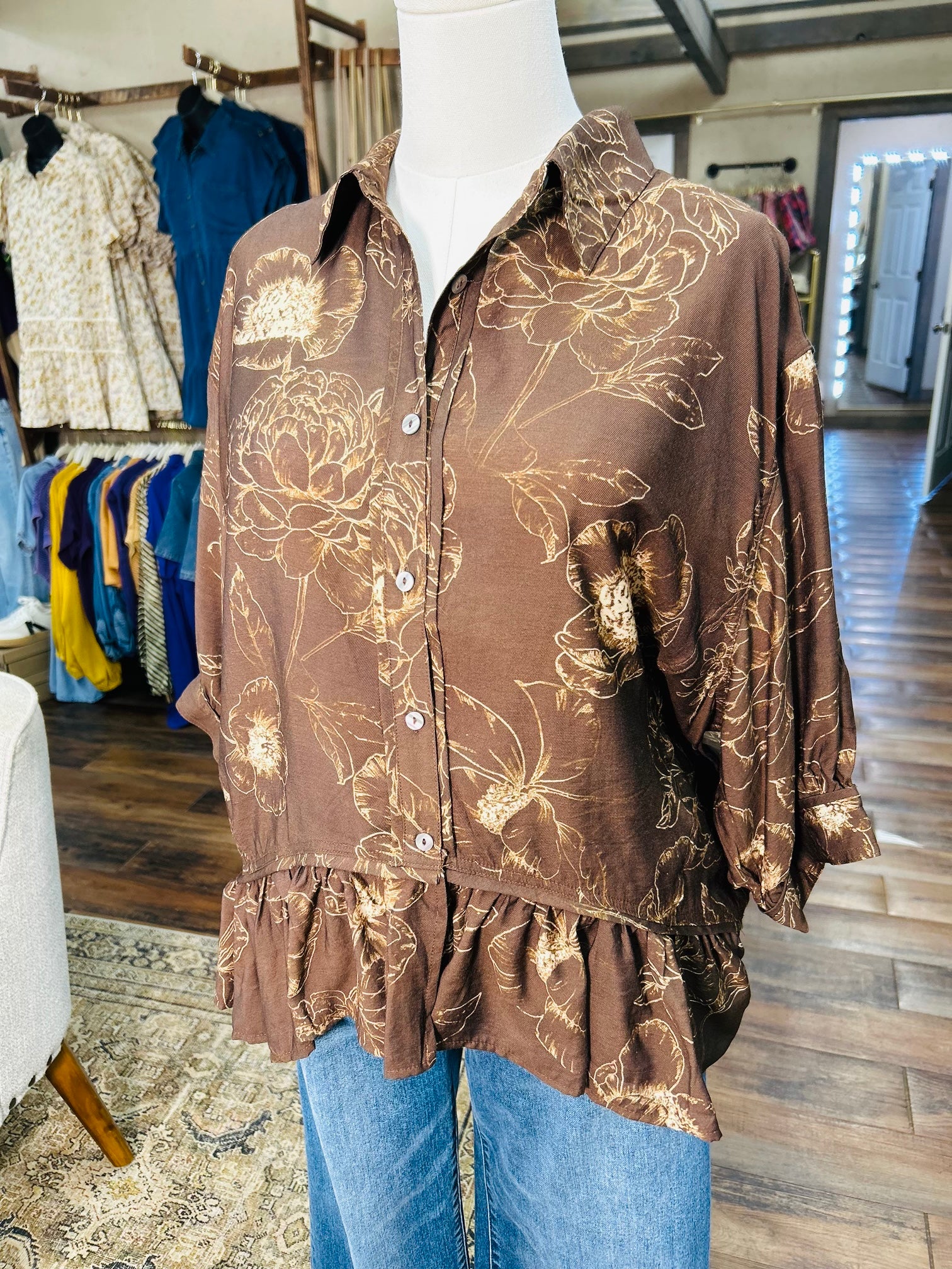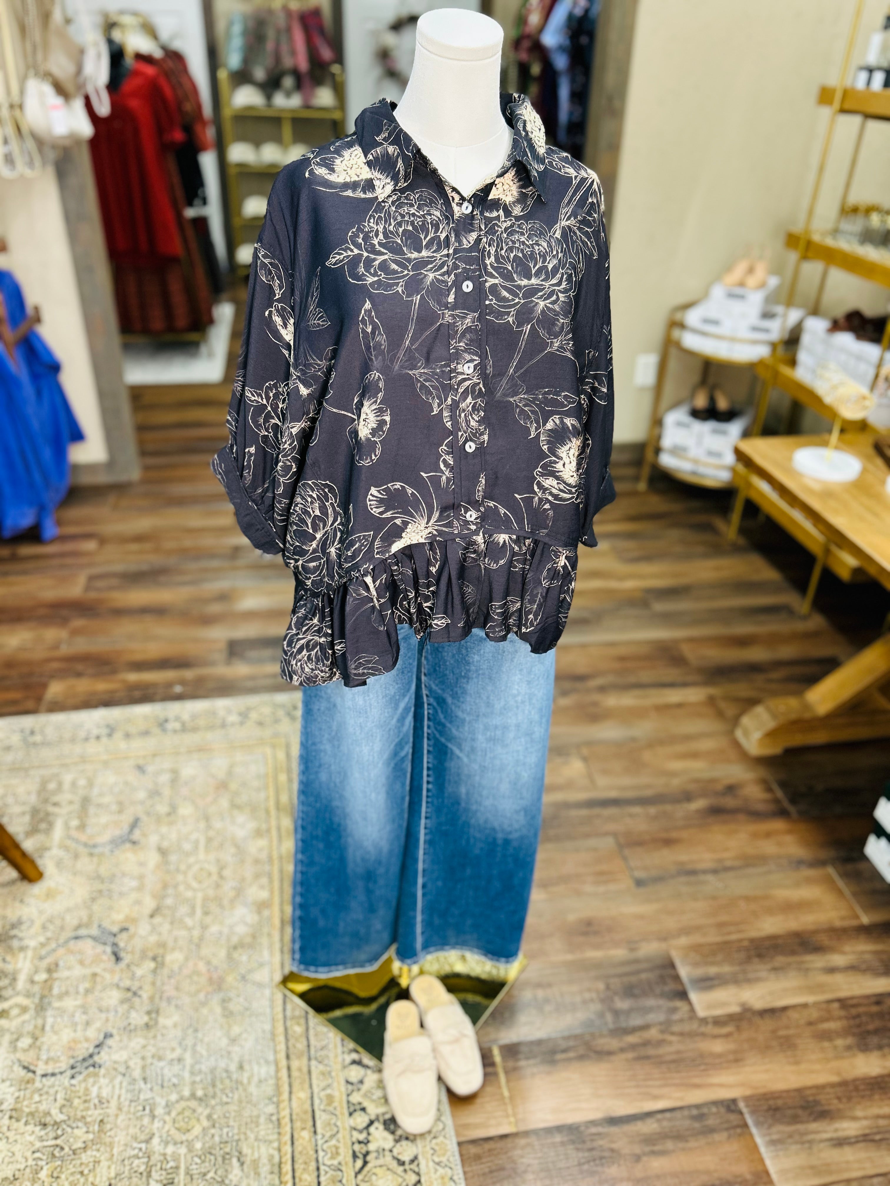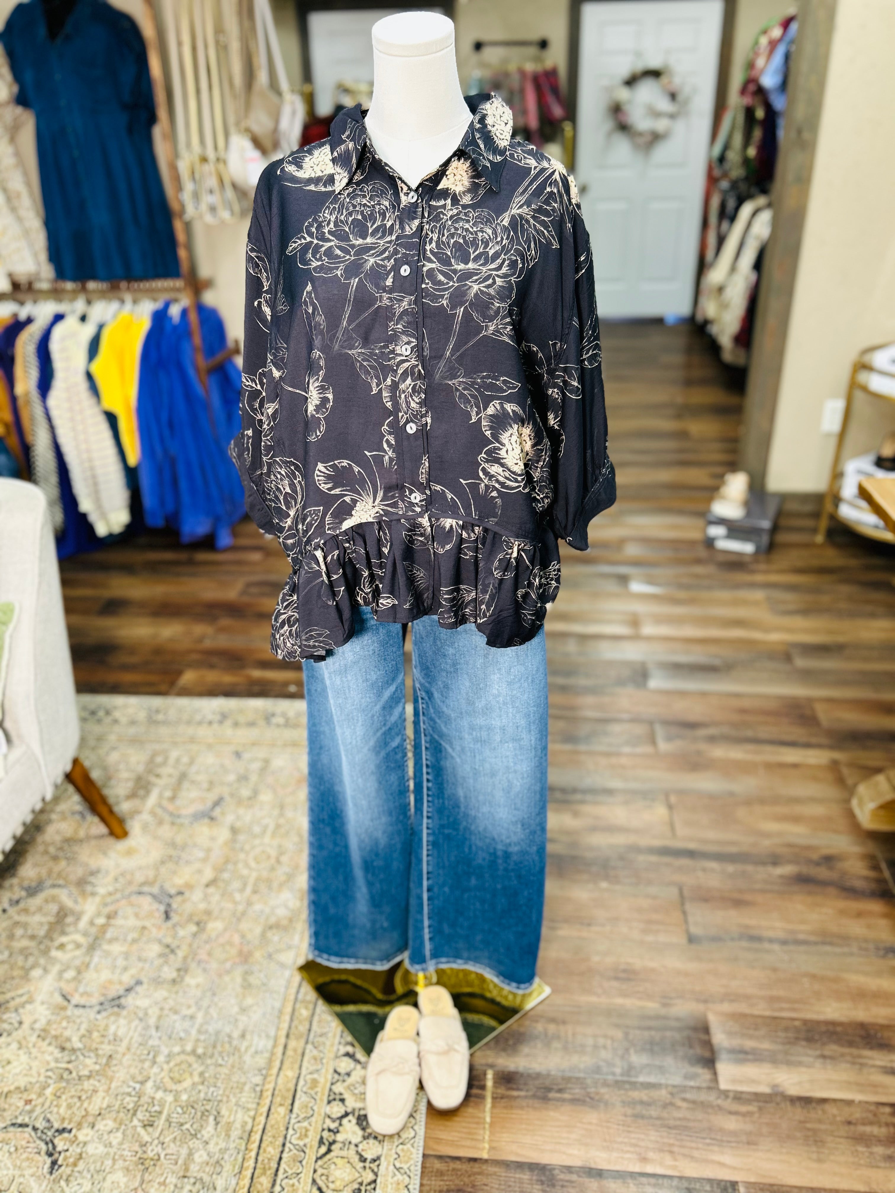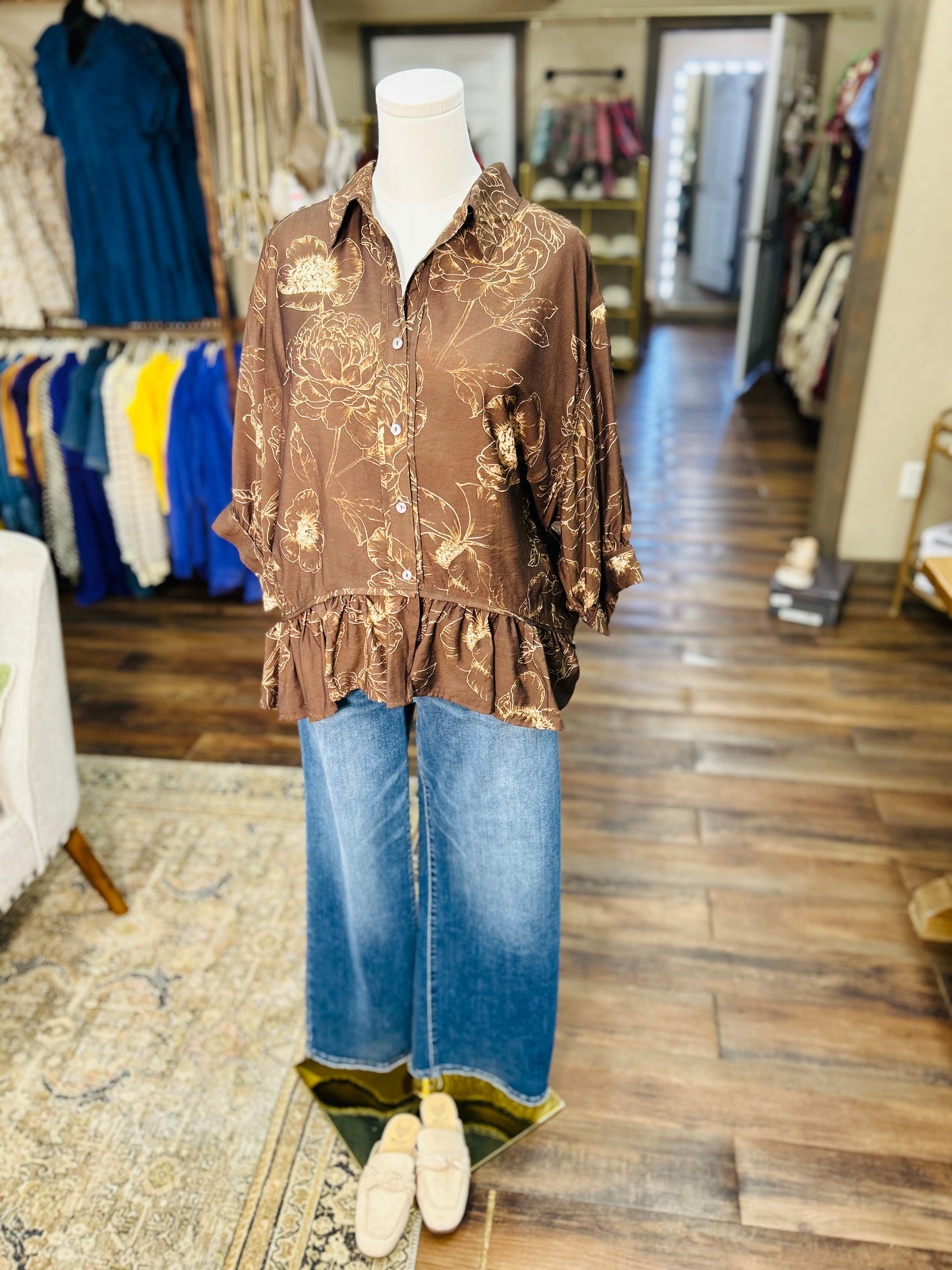 The Golden Grove Plus is a collared button-down top that brings a playful twist with its gold floral print. Perfect for adding a touch of flair to your everyday wardrobe, this top effortlessly combines classic style with a lively, floral pattern that’s sure to brighten your day.