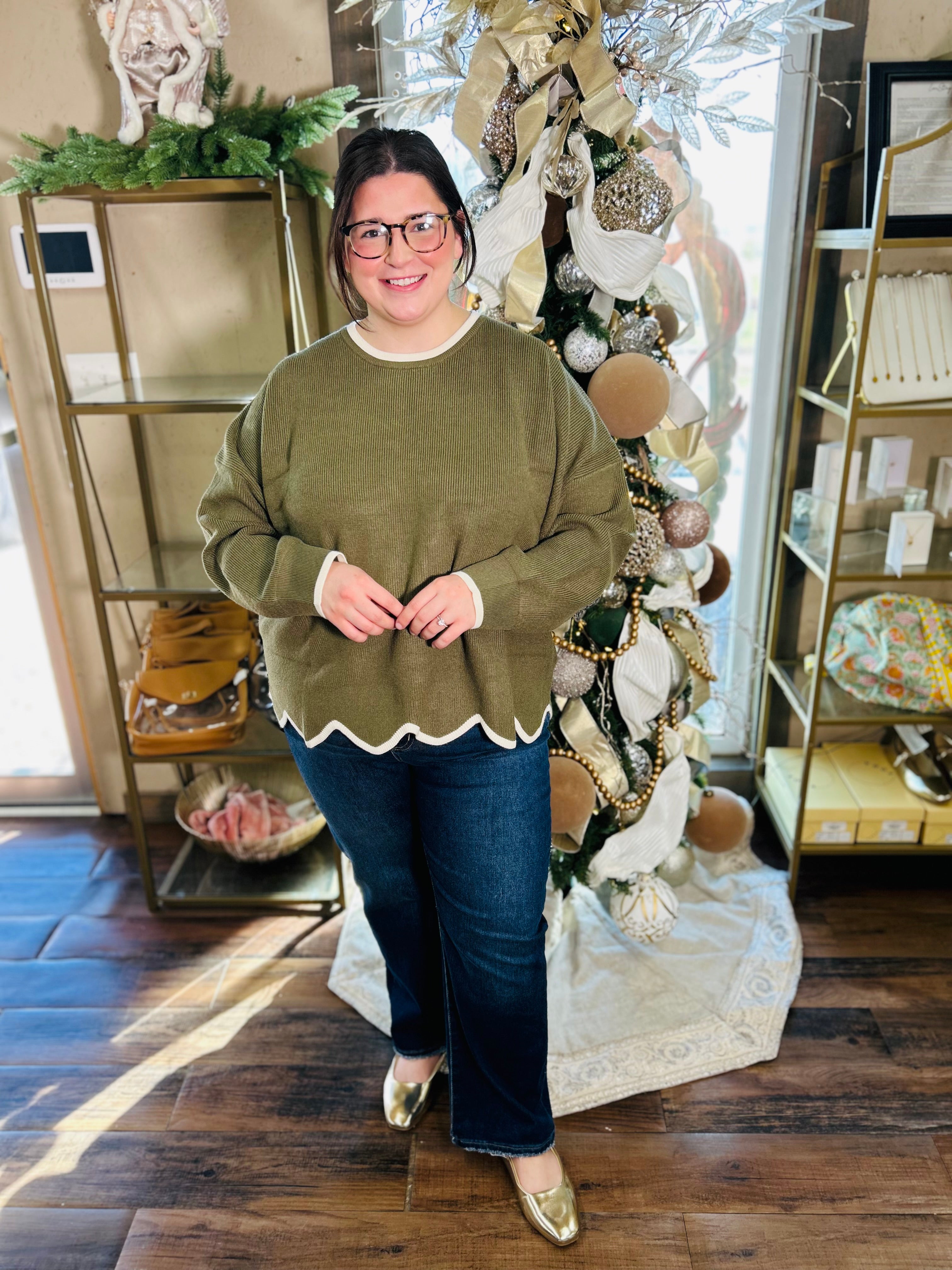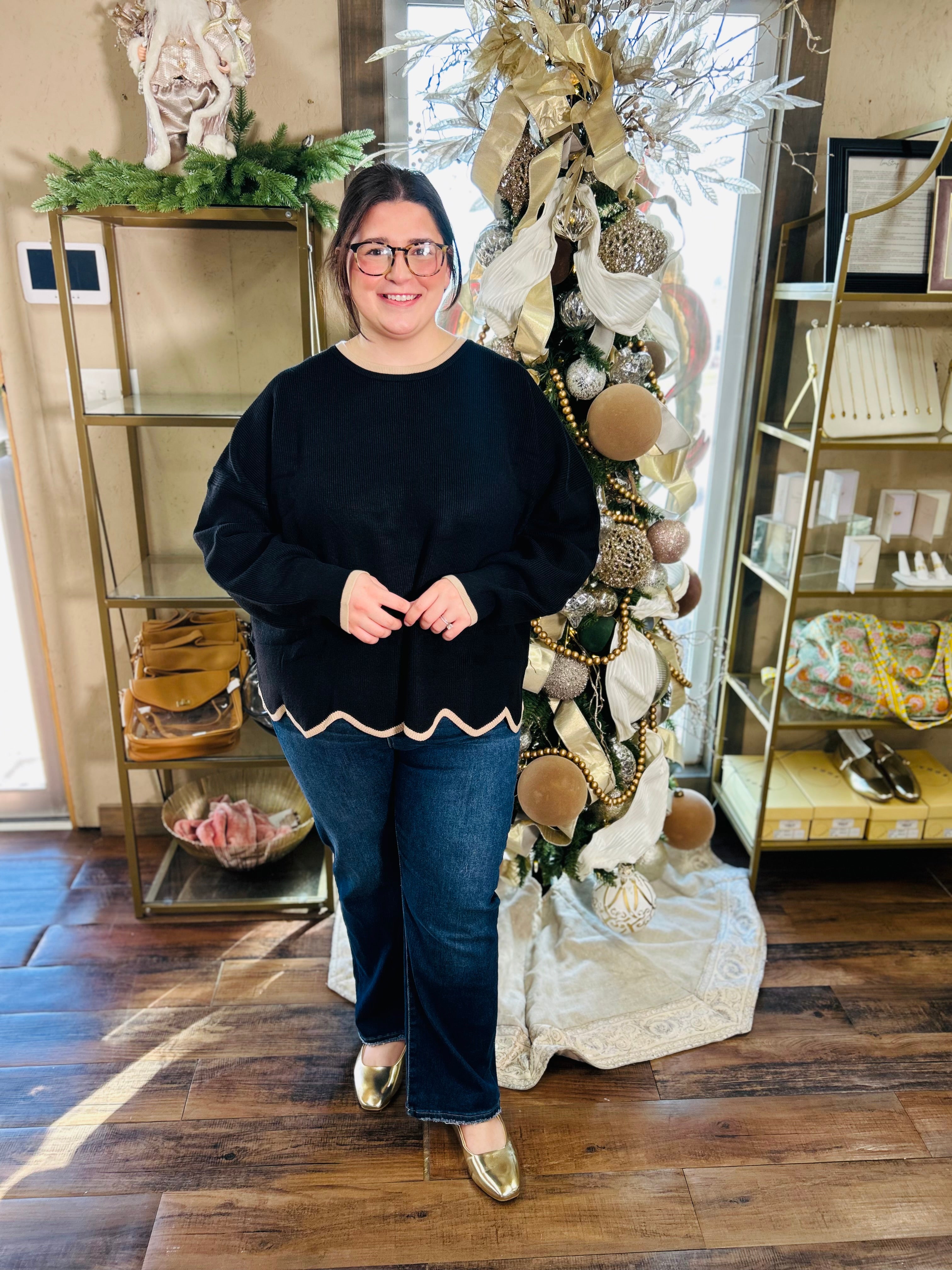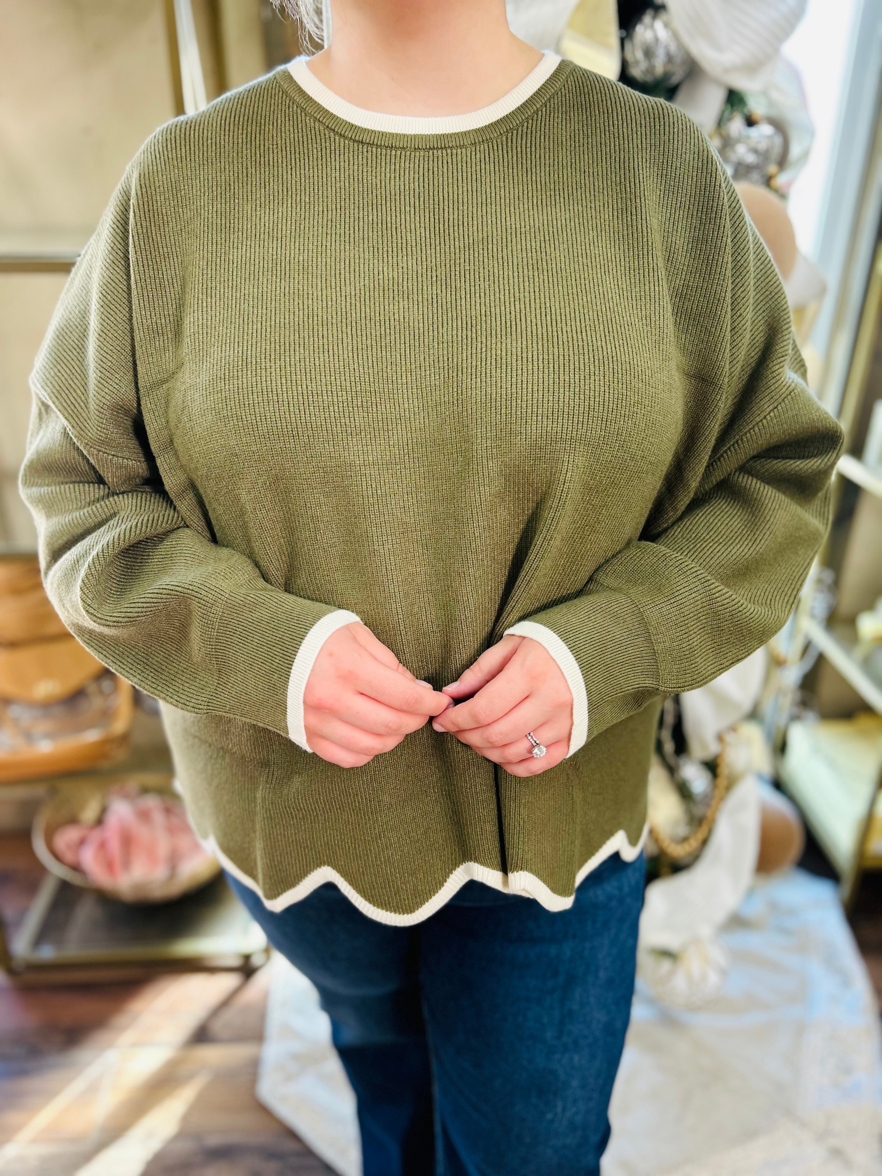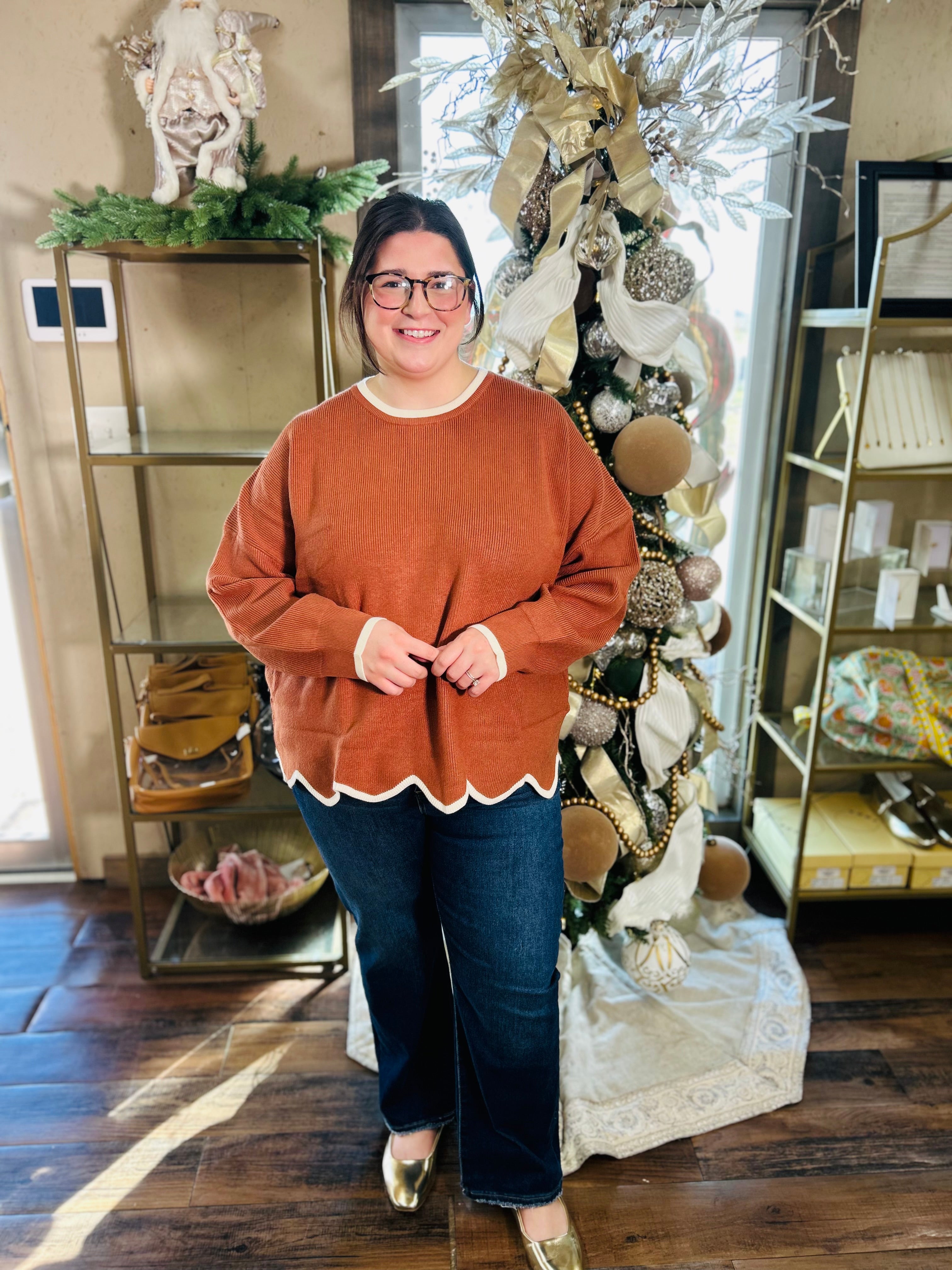 Cozy up in the "Harvest Hem", where classic comfort meets a fun twist. This sweater features charming contrast details and a wavy trim that add a playful pop to your everyday look. Perfect for layering or wearing solo, it keeps you snug while turning heads with its unique design. Embrace warm vibes with a little extra flair!