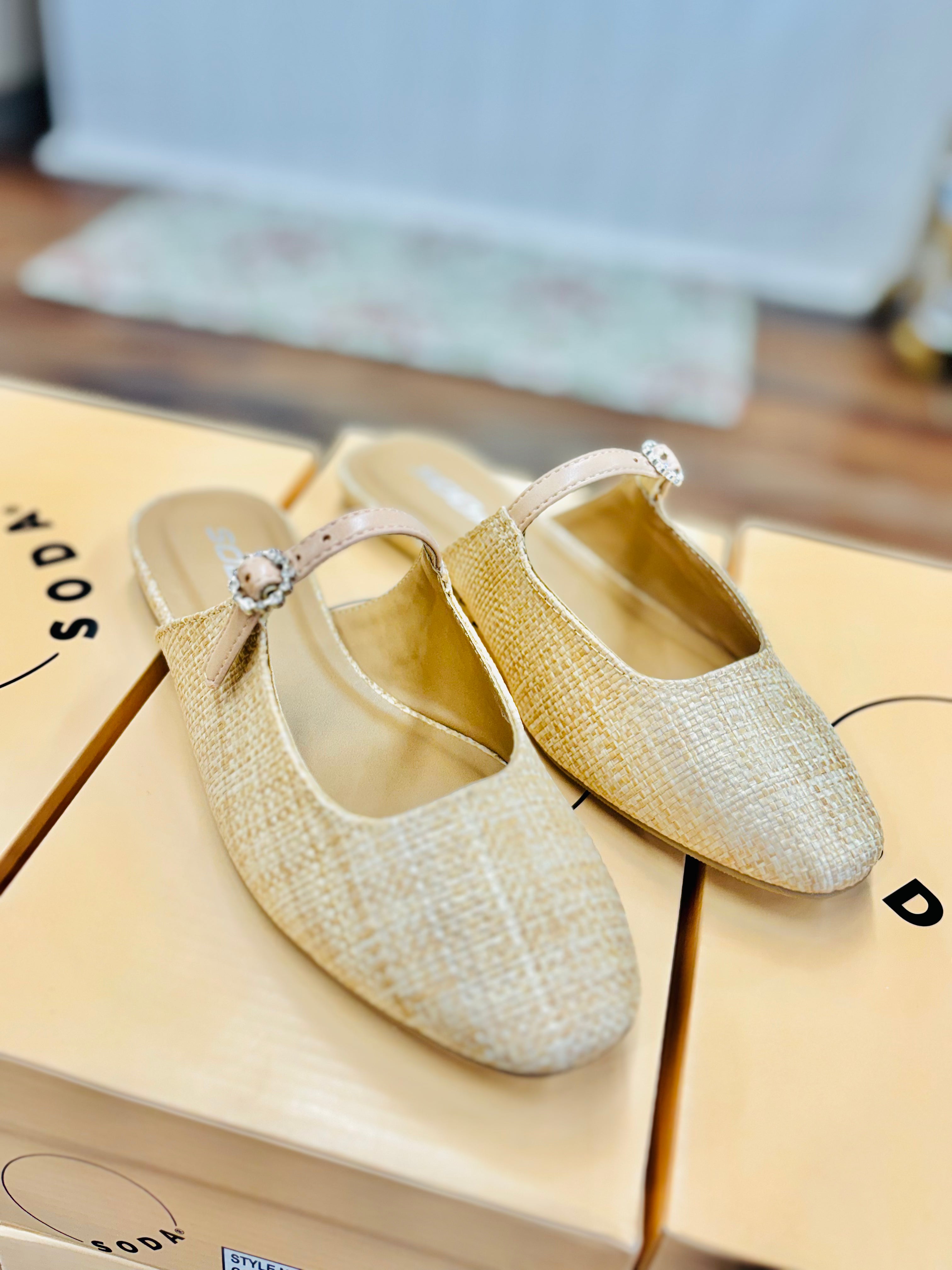 Slip into effortless elegance with the Fleur Flats—a backless wonder that keeps your feet comfy all day long. The soft, neutral woven texture pairs perfectly with a delicate floral rhinestone buckle that catches the light with every step. The slingback strap ensures a secure fit without the fuss, making these beauties ideal for everything from casual outings to dressed-up occasions. Beige perfection meets playful sparkle.