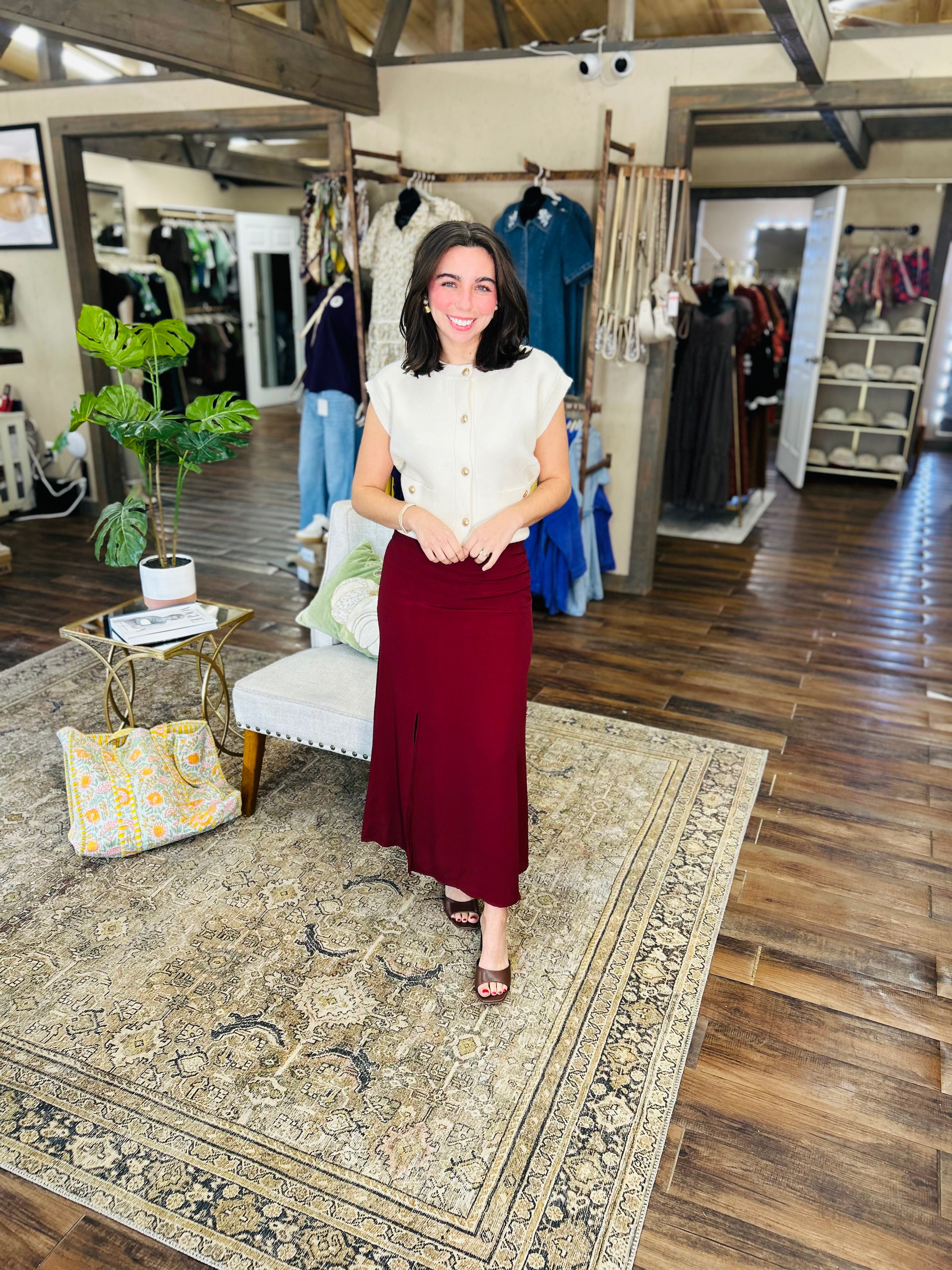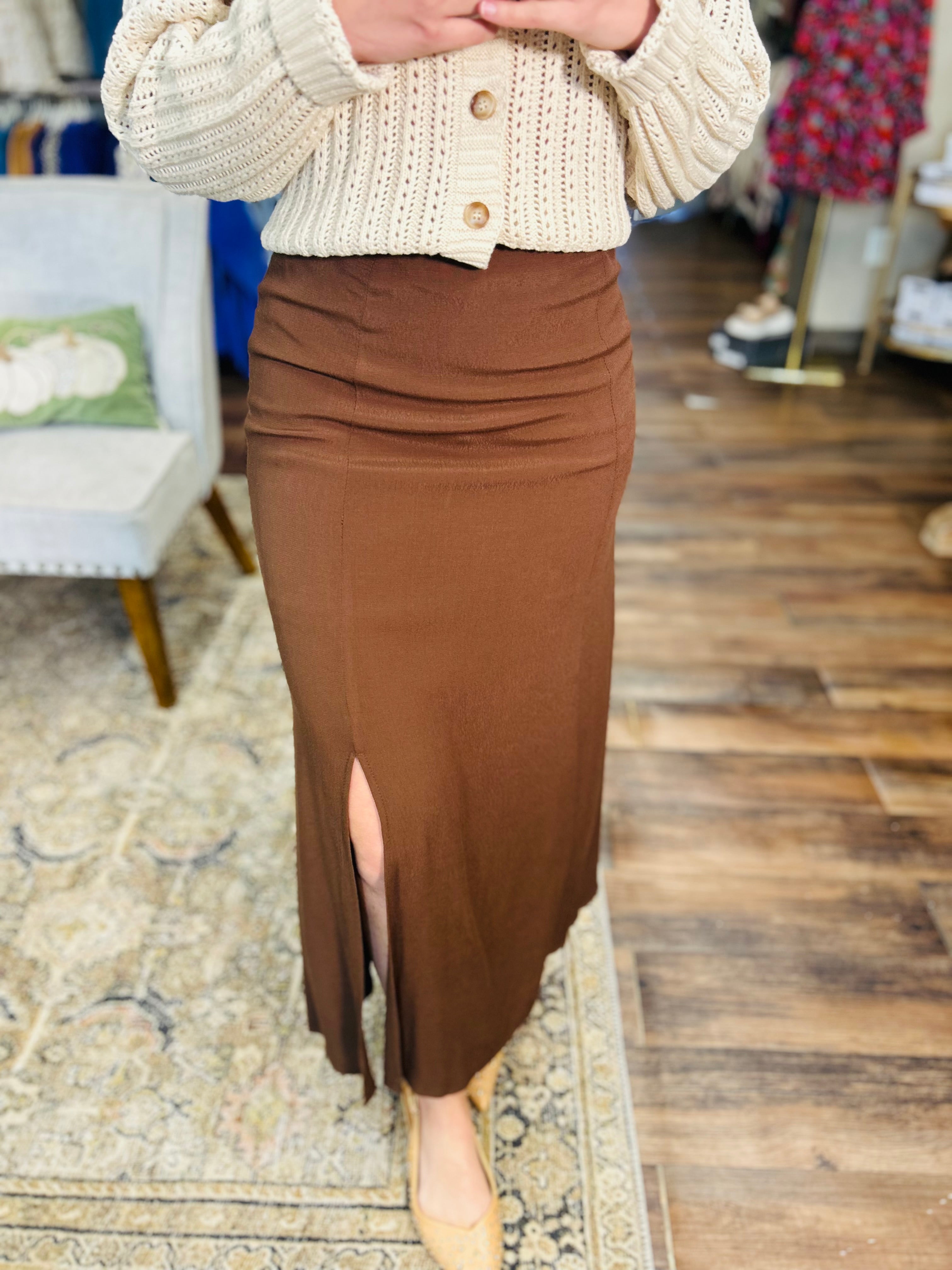 Get ready to FALL in love with this midi skirt! The perfect addition to your closet, it's a staple for any fall wardrobe. With a midi length, it's both stylish and versatile. Get yours now and FALL in love with your new go-to outfit!