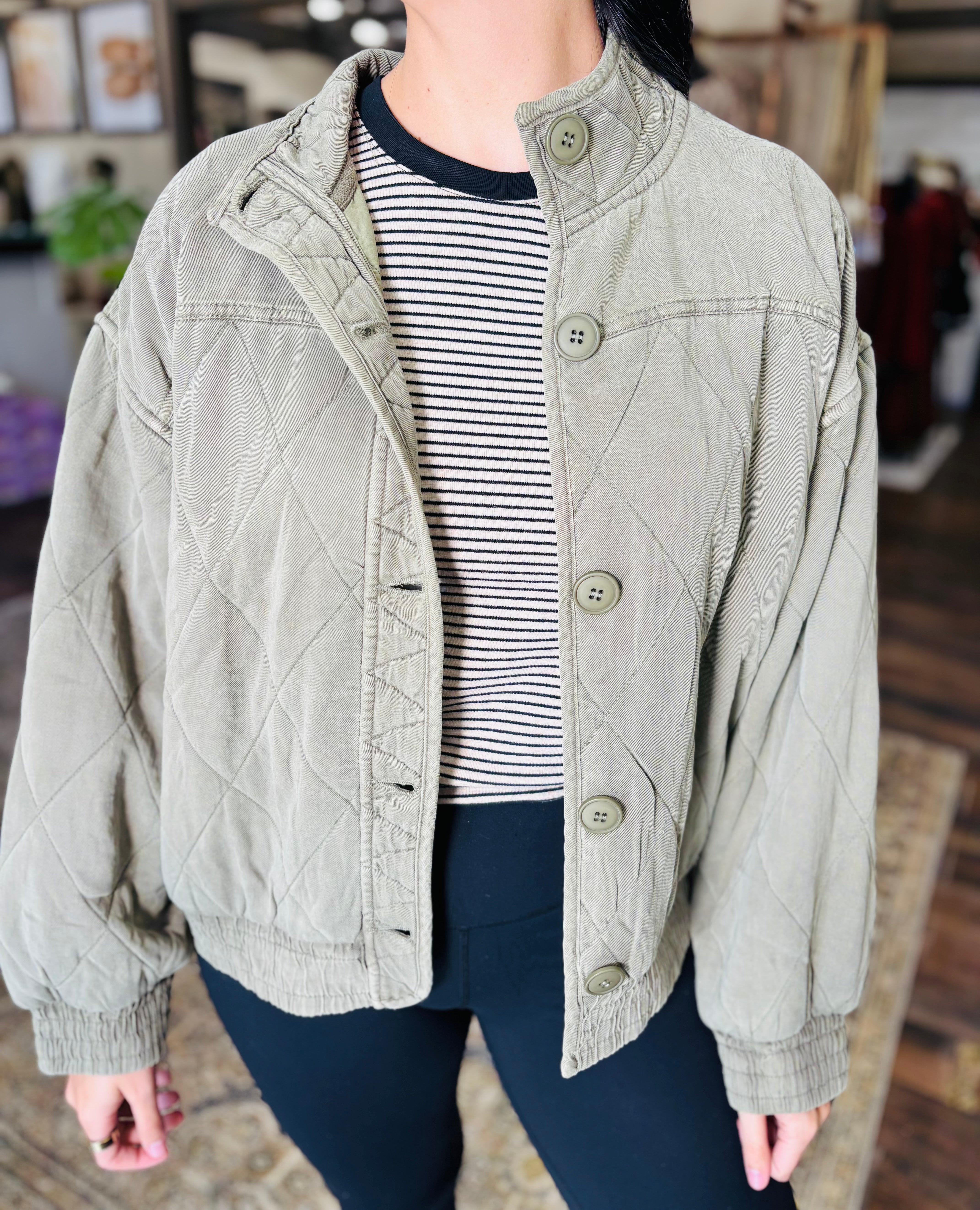 Stay warm and trendy with the Quilted Cozy, a washed quilted button-down jacket that’s as soft as your favorite blanket. Its playful design and comfy fit make it perfect for layering on crisp days, while the button-down front adds a charming touch. Whether you’re out exploring or lounging around, this jacket keeps you snug with style.