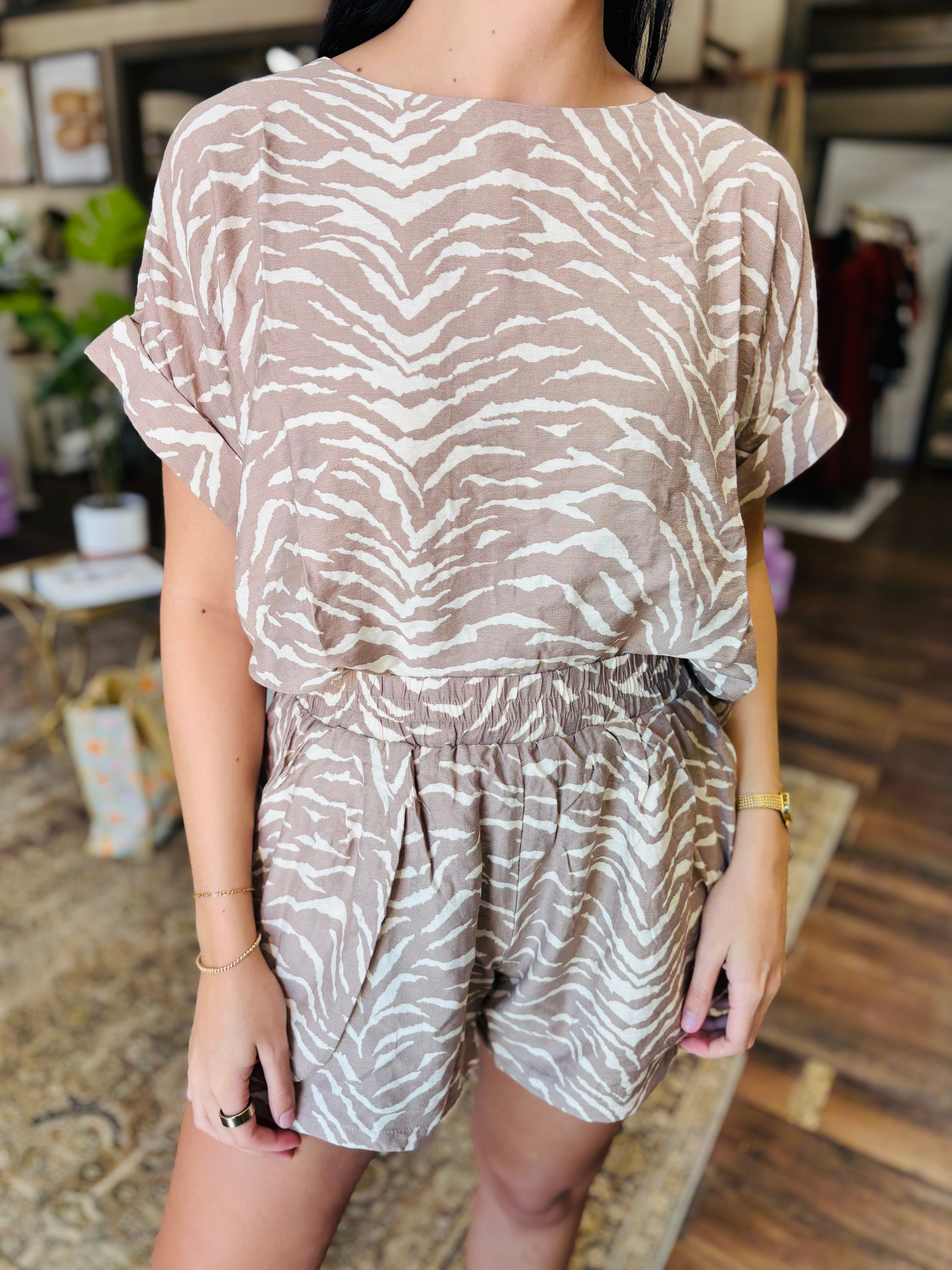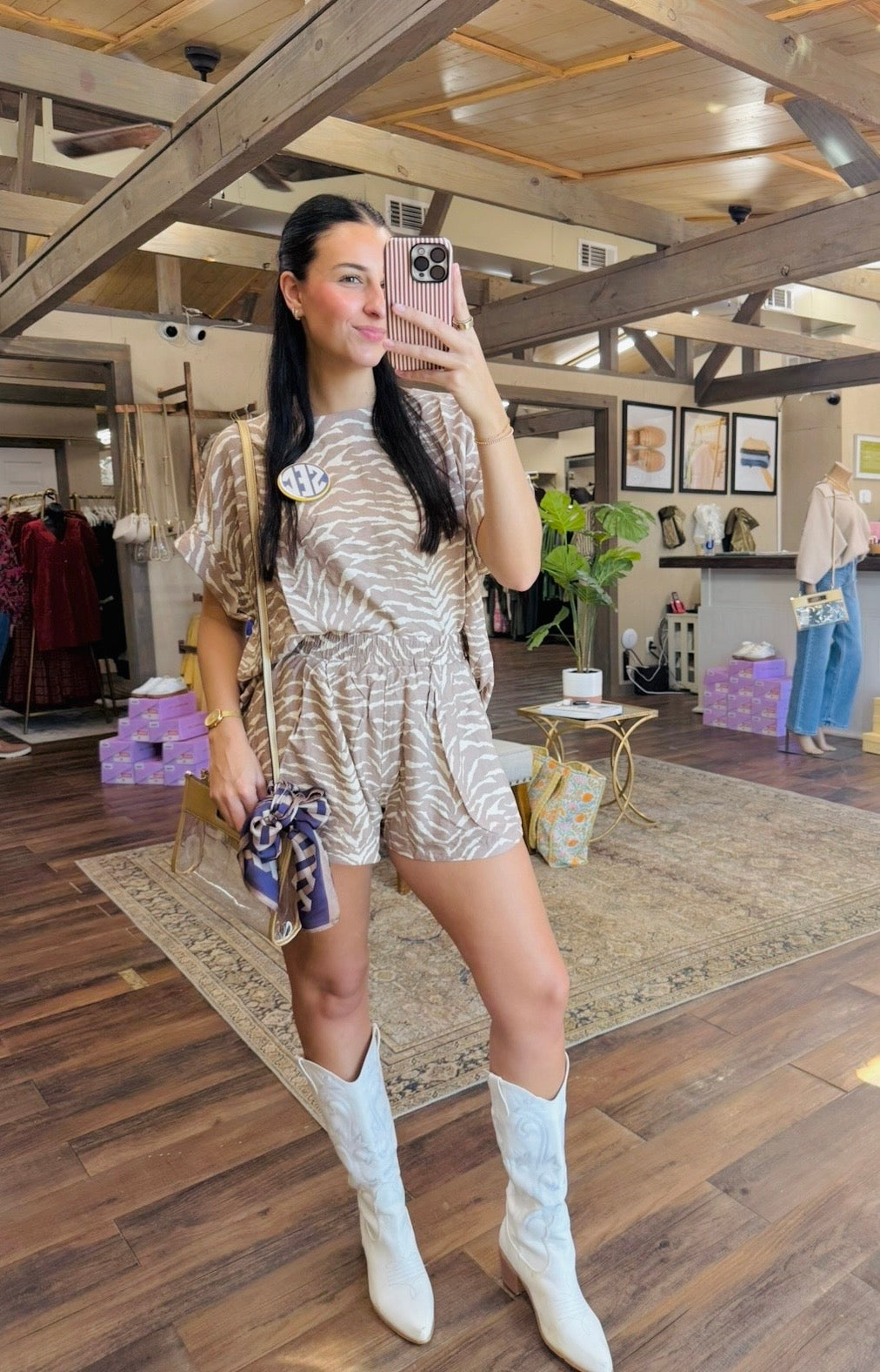 Step into fall with the playful Sahara Stripes set! Featuring a short-sleeve creme and brown top paired with tiger-striped shorts, this combo effortlessly transitions your look from sunny days to cozy vibes. Perfect for layering or wearing solo, it brings a fun, wild touch to your autumn style.