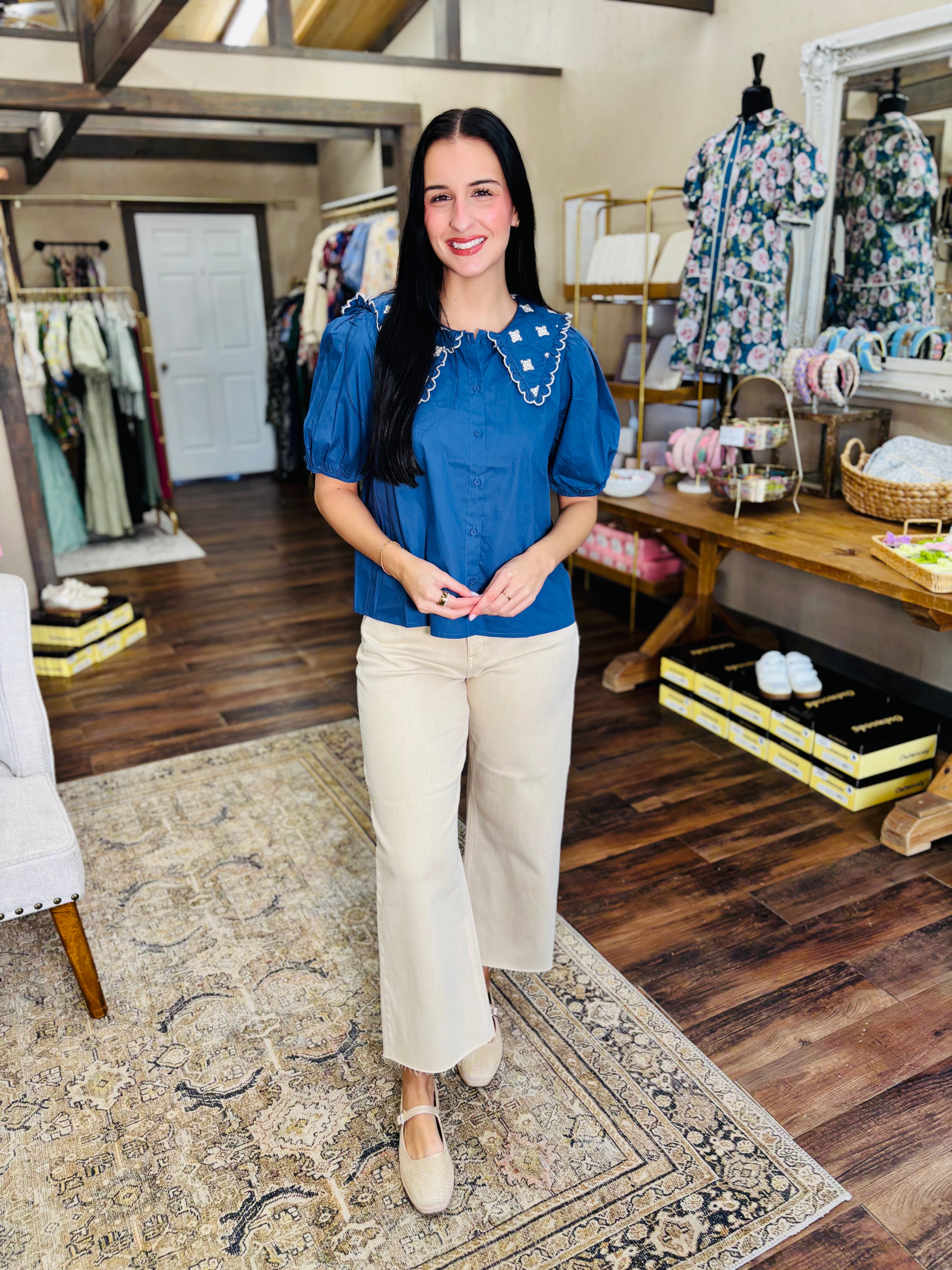 Ahoy, fashion lover! This charming navy poplin blouse brings vintage-inspired whimsy to your wardrobe with its signature Peter Pan collar adorned with delicate embroidery. The puff sleeves add a touch of romantic flair, while the classic button-down design keeps things effortlessly wearable. Perfect for channeling retro elegance with a modern twist—whether you're dressing up for brunch or adding personality to your everyday look. A timeless piece that celebrates playful sophistication.