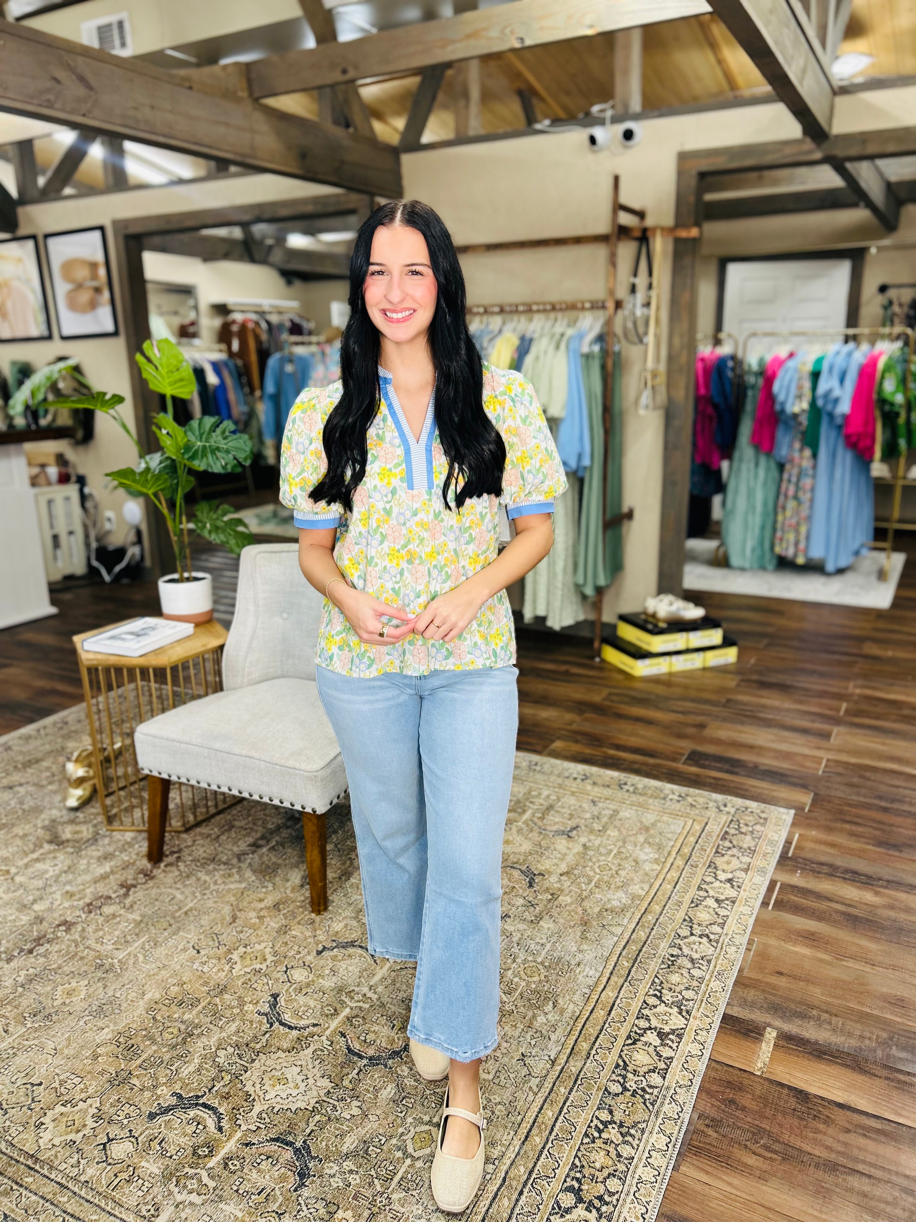 Brighten your wardrobe with this cheerful short-sleeve blouse featuring vibrant yellow and blue floral prints. Perfect for spring days and casual outings, this piece brings effortless style and a pop of color to any look. The playful botanical design captures the essence of sunny weather and fresh beginnings, making it an instant favorite for mixing and matching with your favorite bottoms.