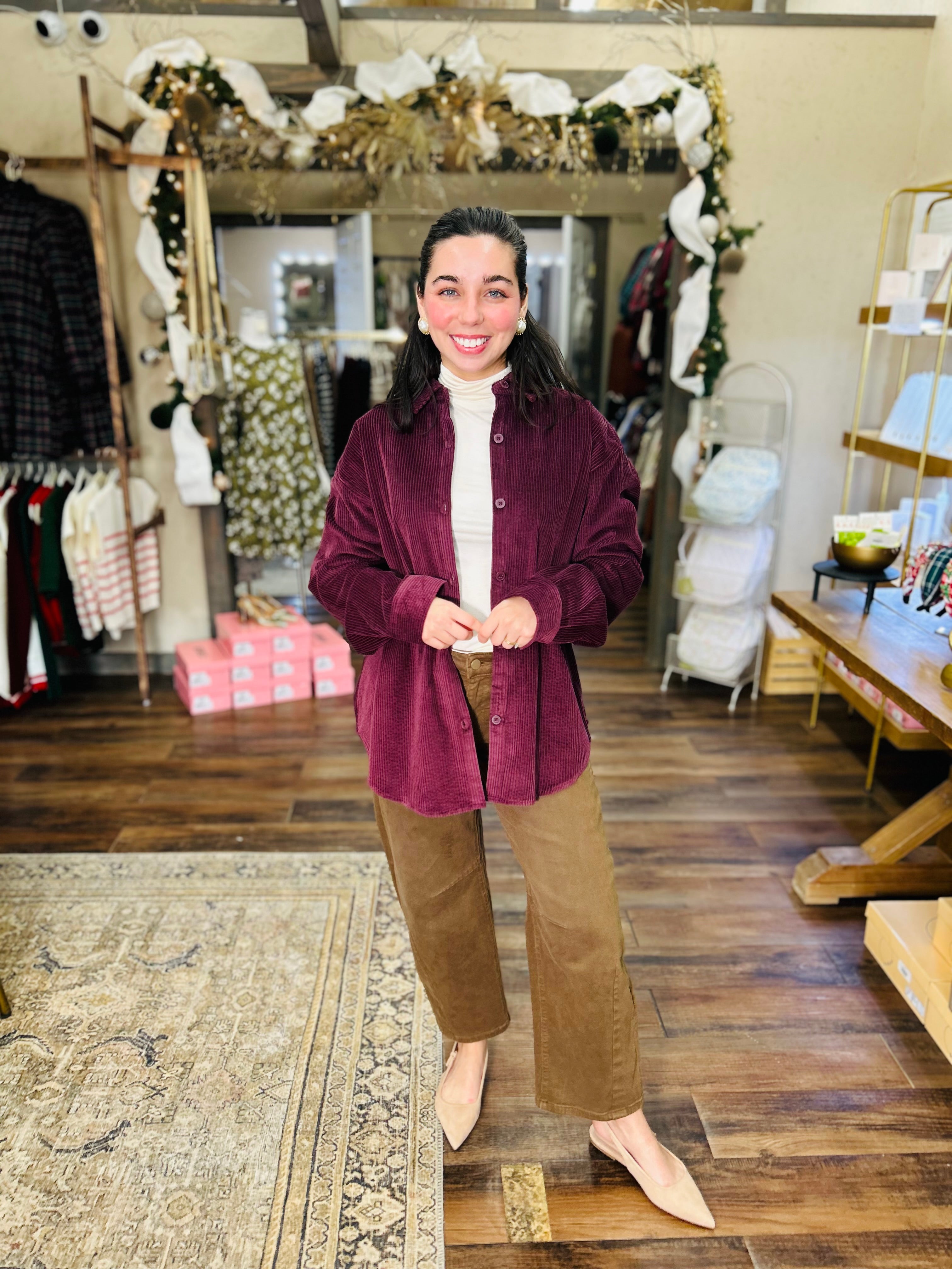 Presenting a stunning display of casual elegance, the "Corduroy Dreams" features a classic button-down front and a soft, relaxed silhouette ensuring comfort. The structured collar and tailored cuffs emphasize a polished look, perfect for versatile styling. Wear it open over a chic tee or buttoned up for a refined profile, ideal for both crisp autumn days and laid-back office settings.