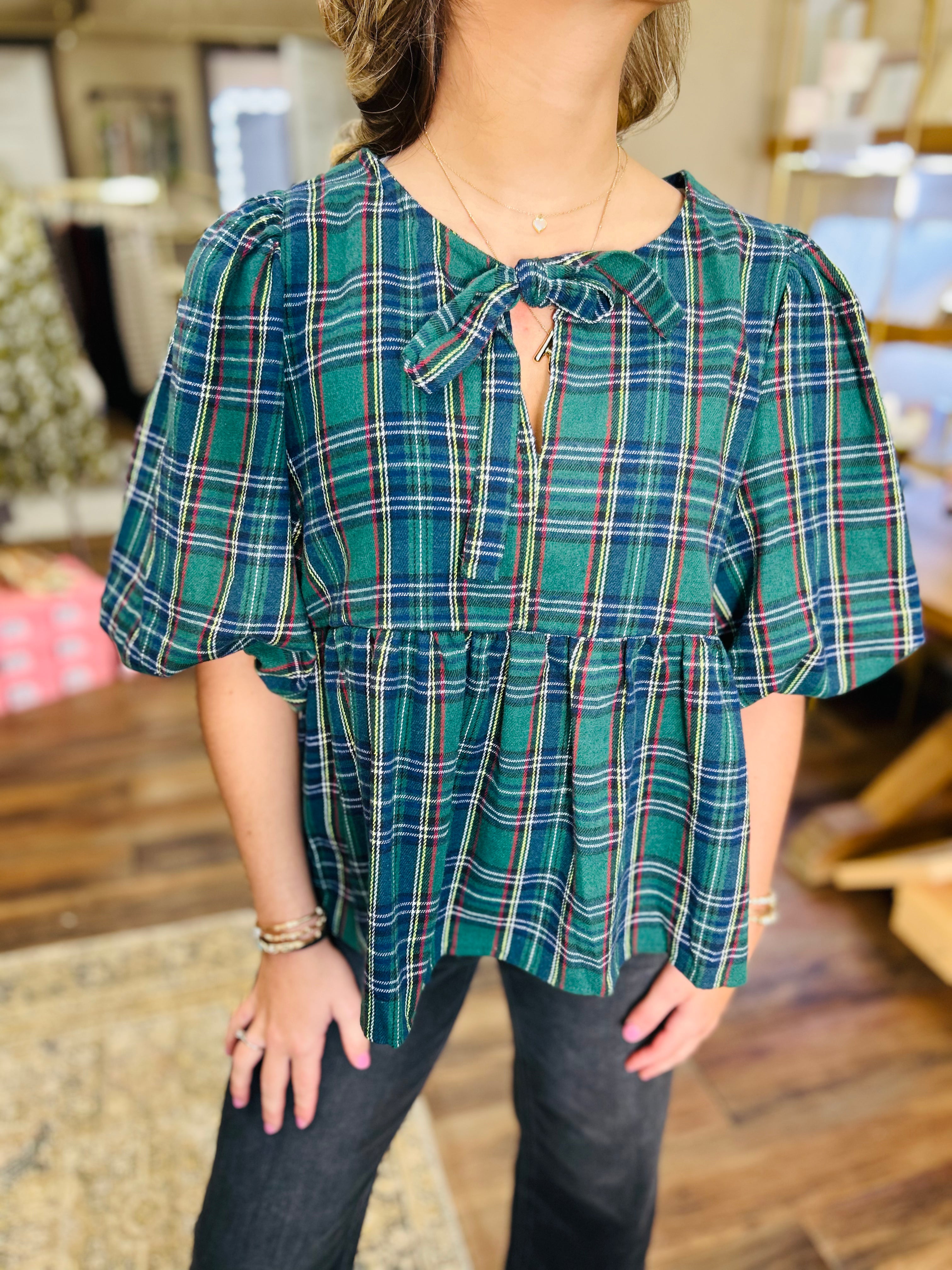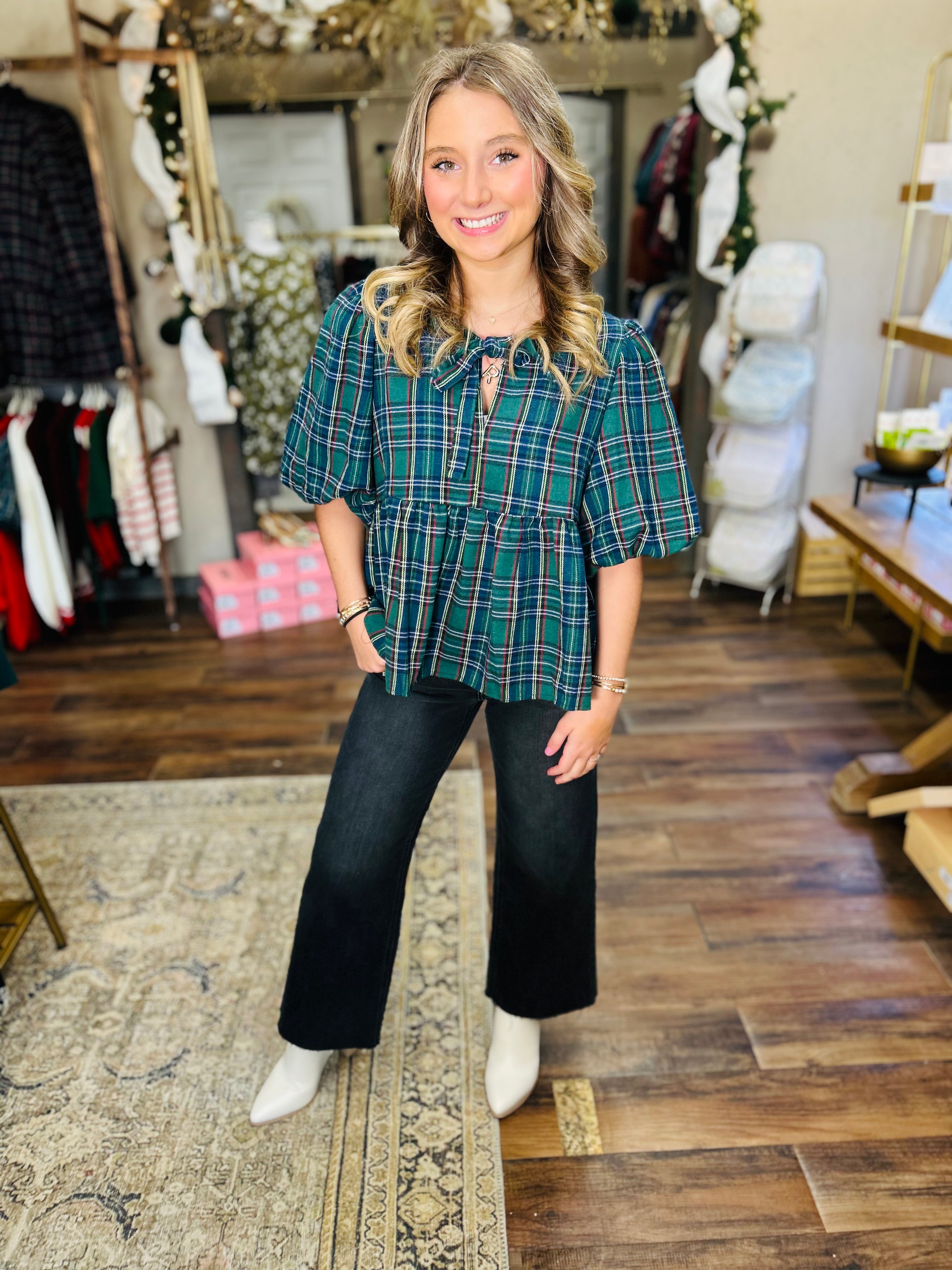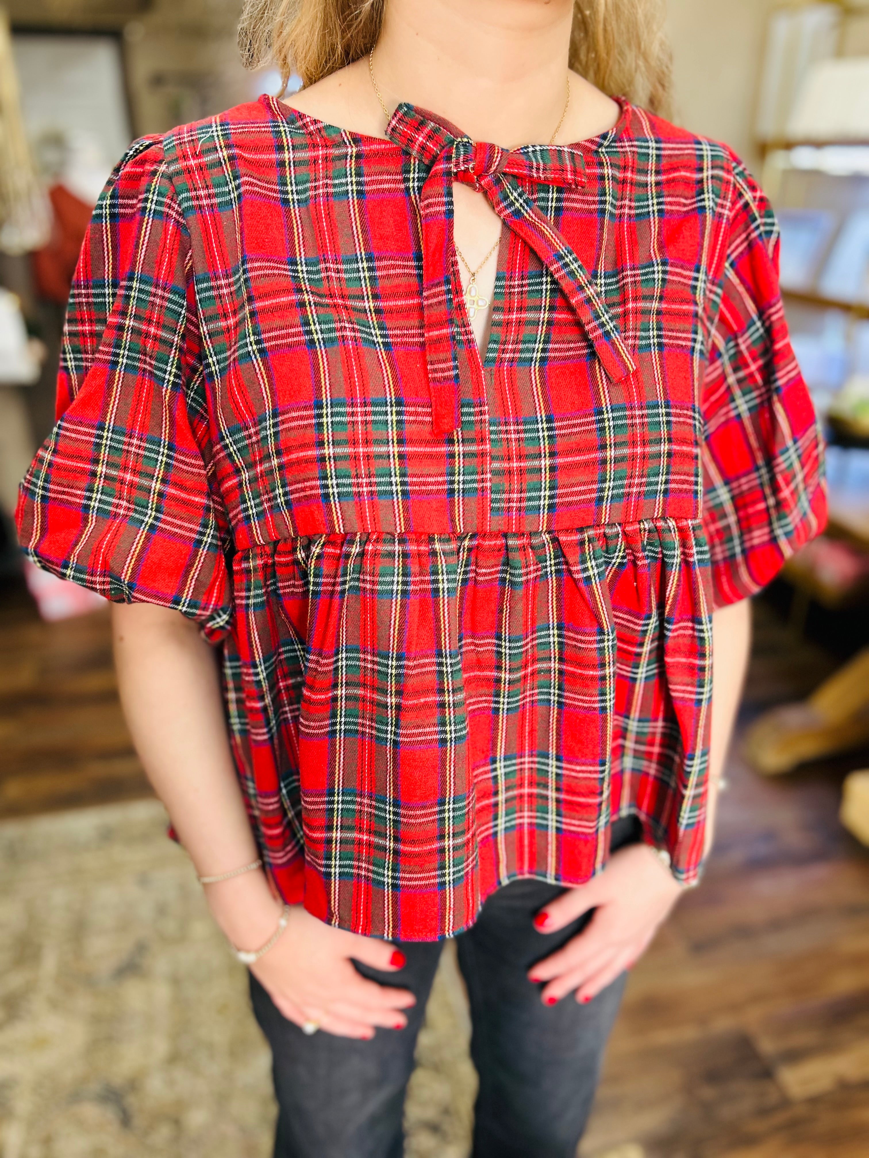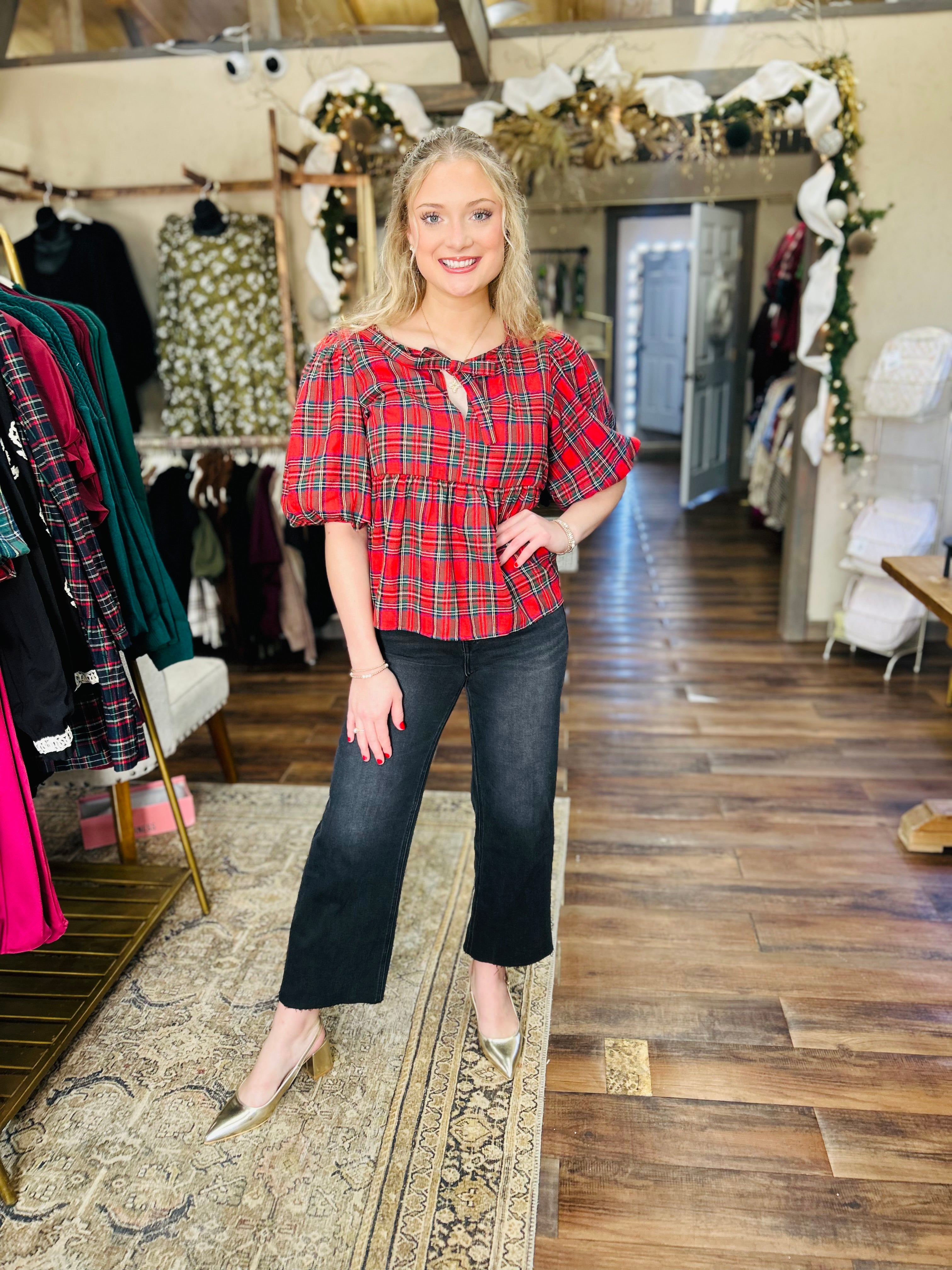 Celebrate the season in style with the JINGLE BELLE short sleeve top, featuring playful bubble sleeves and a cozy Christmas flannel pattern. Perfect for spreading holiday cheer with a fun, festive twist!