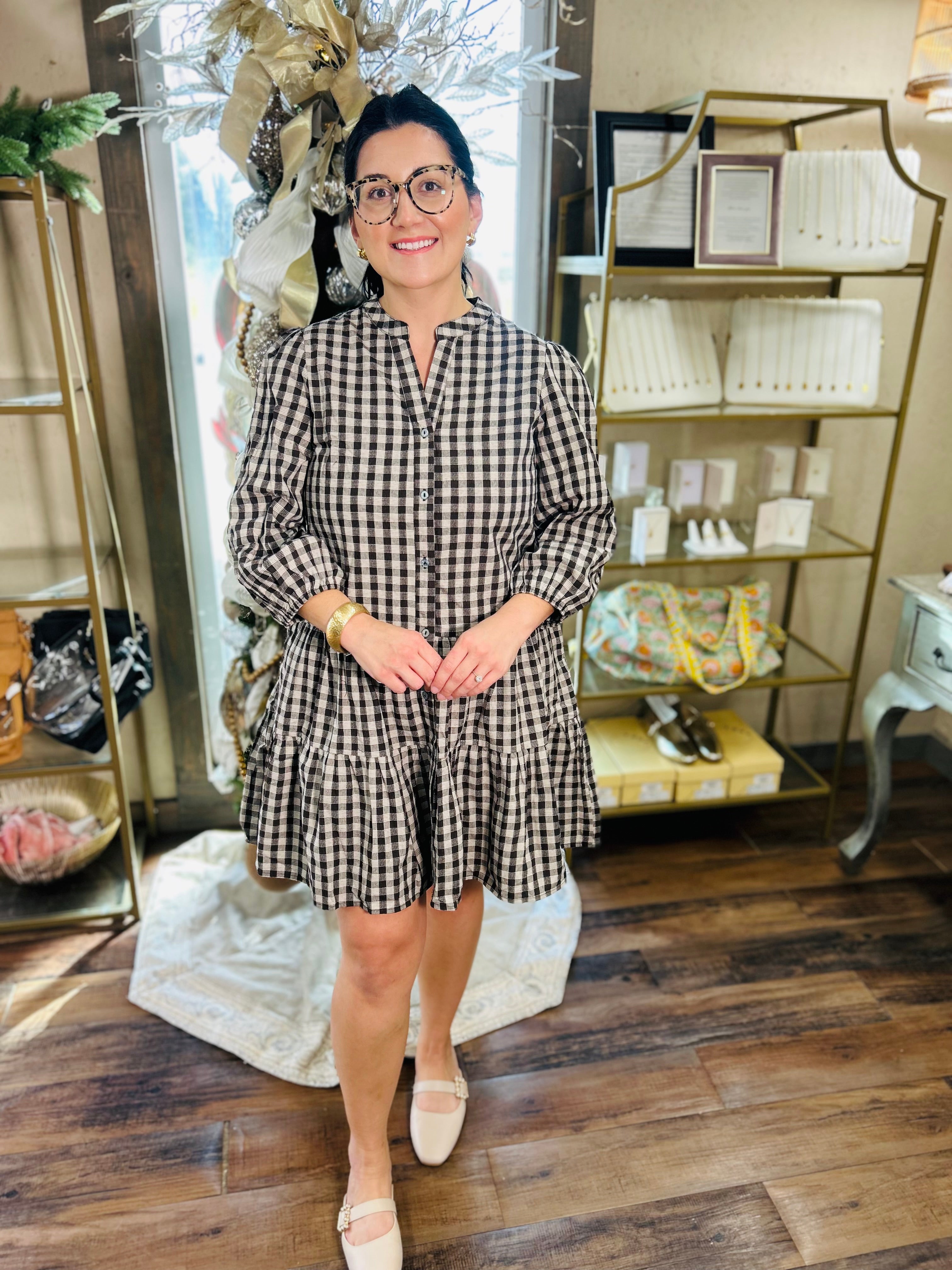Step into cozy charm with the MOCHA MEADOW dress. Featuring playful 3/4 sleeves and a flattering tiered silhouette, this brown plaid woven dress blends comfort with flirty style. Perfect for layering or wearing solo, it’s your go-to for effortless outings that turn heads. Embrace the season with a dress that’s as fun as your plans!