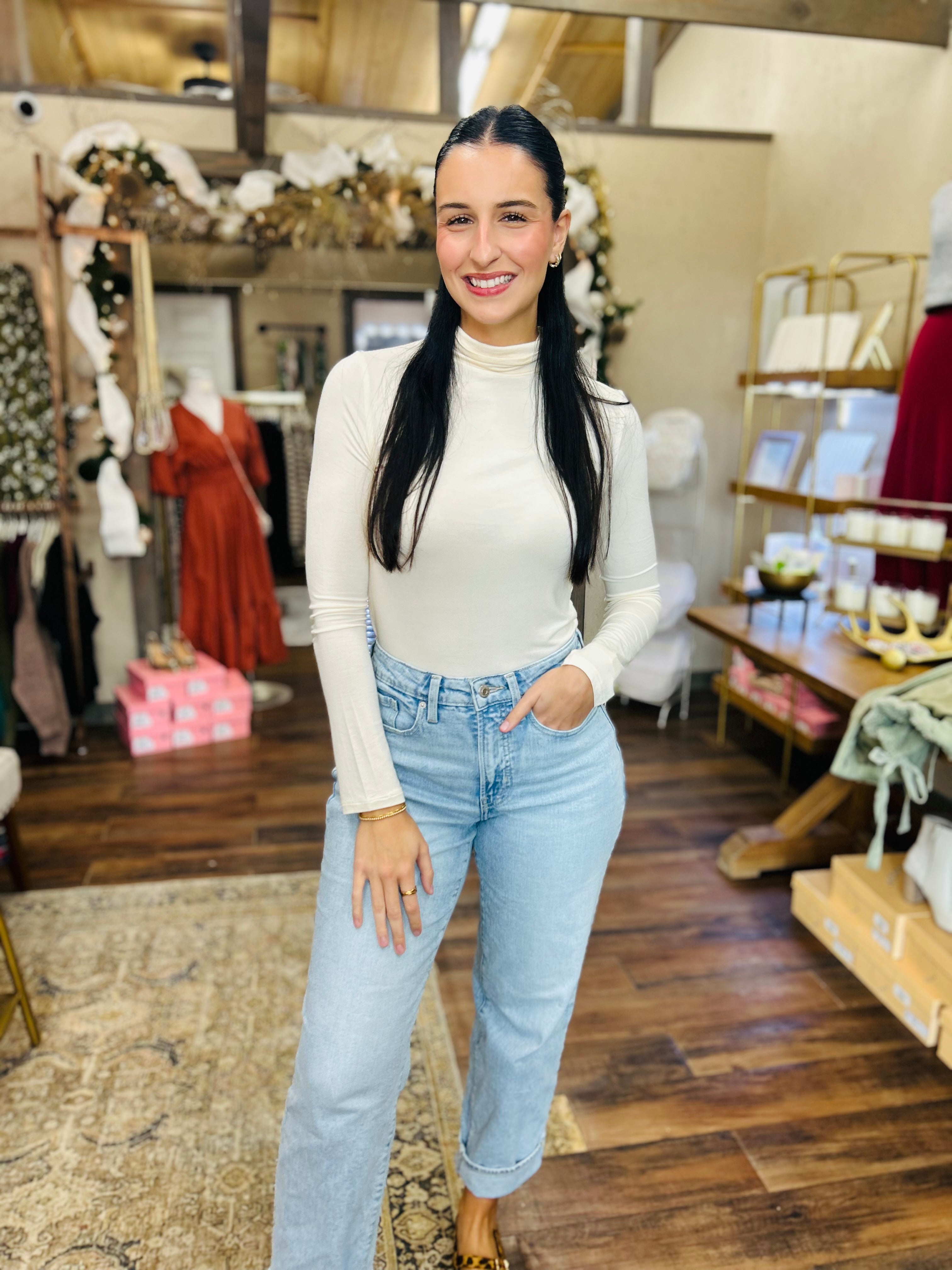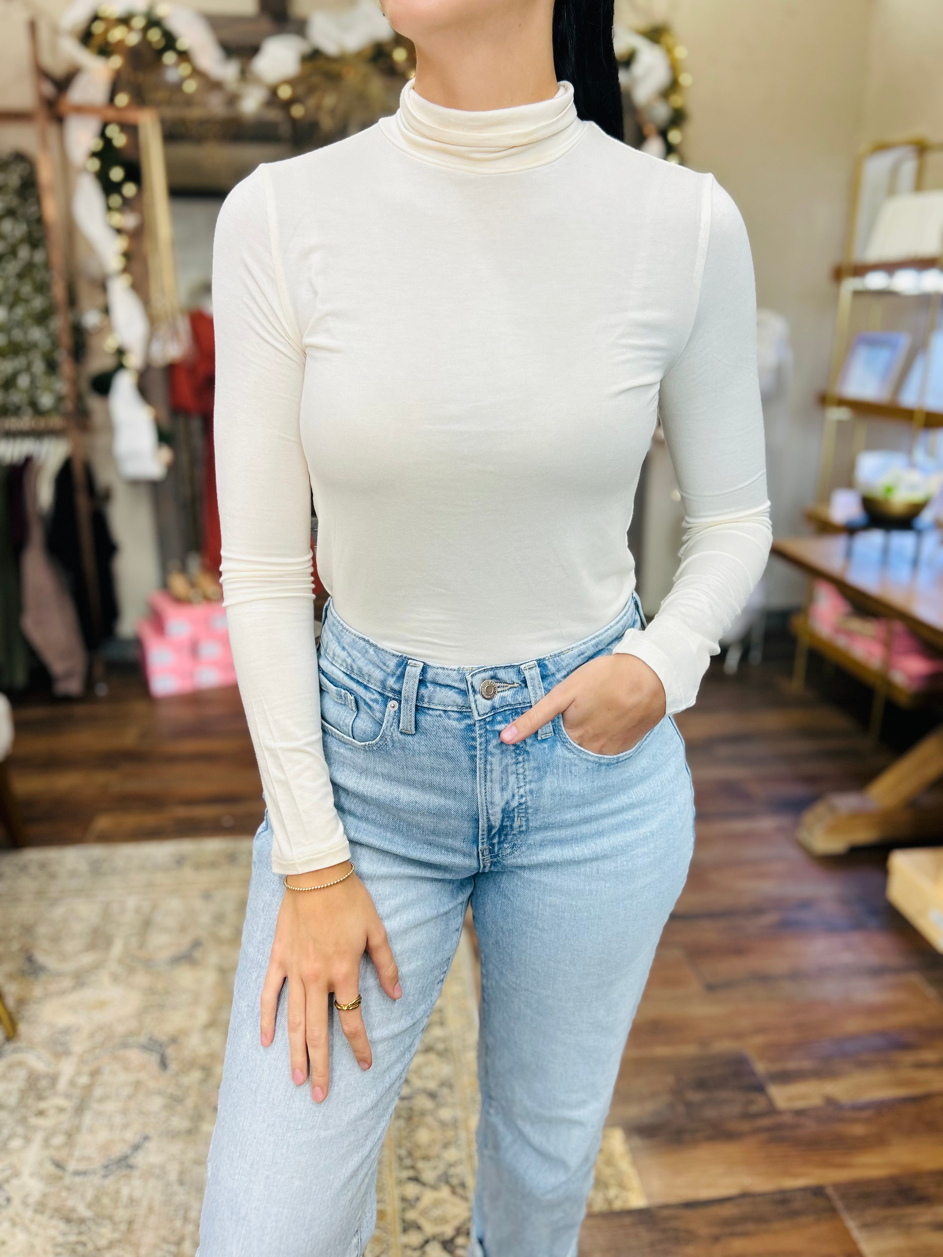 The "Sleek Layers" turtleneck top features a body-hugging fit that enhances the silhouette with a clean, minimal look. Made from a smooth, stretchy knit fabric, it offers a soft hand feel and easy movement without compromising style. Perfect for layering or wearing solo, it pairs effortlessly with high-waisted trousers or skirts for a refined everyday outfit.