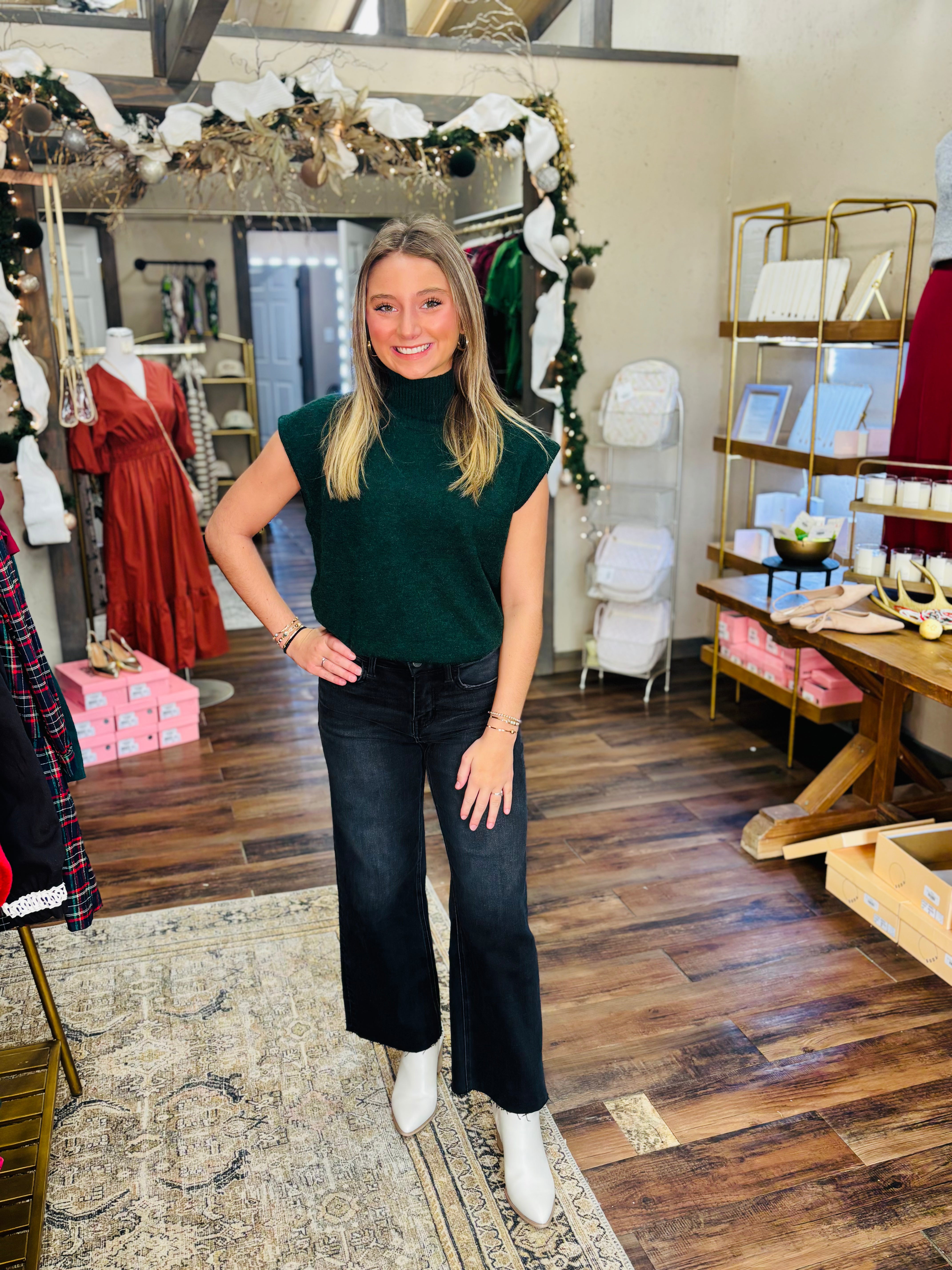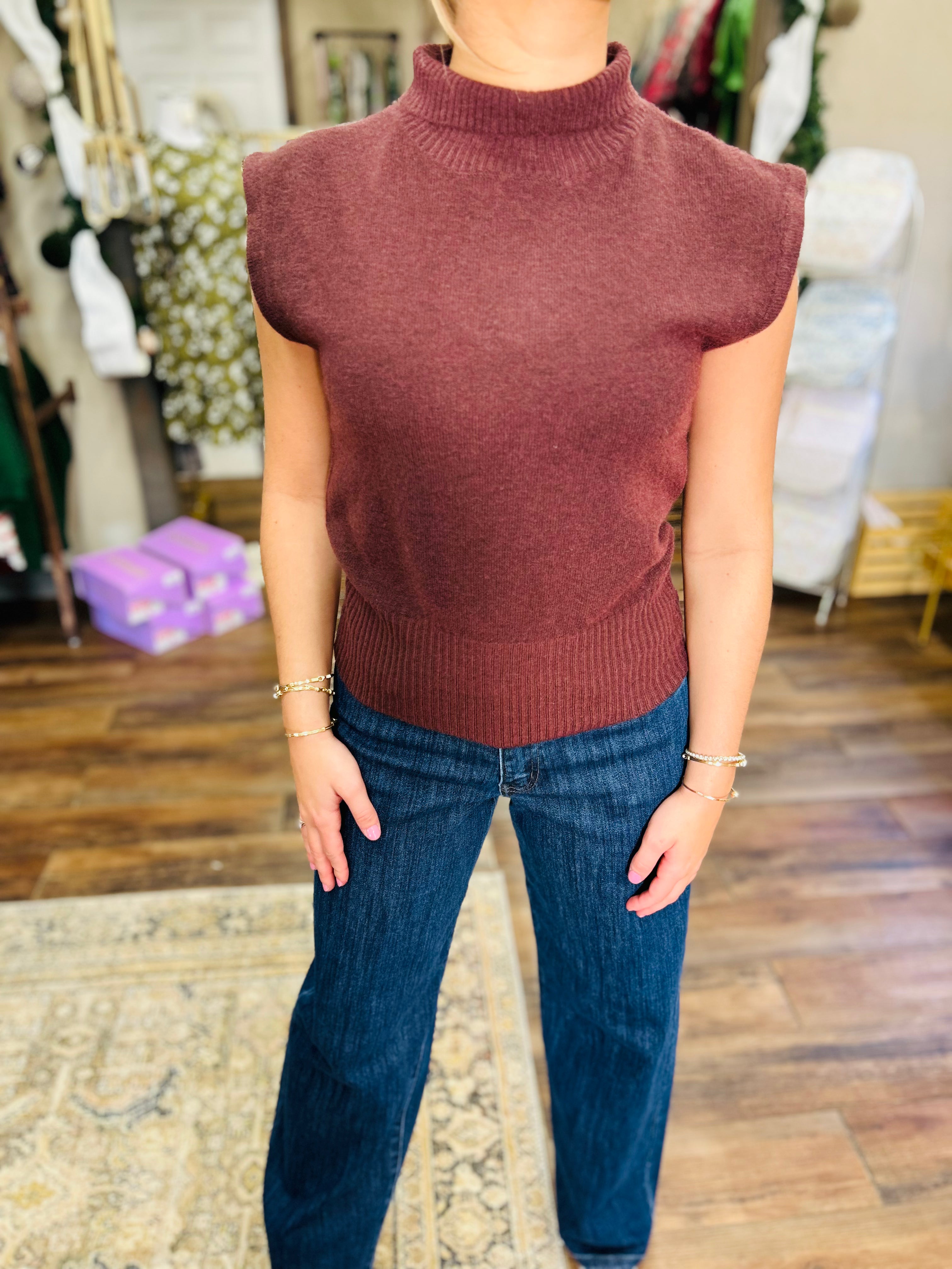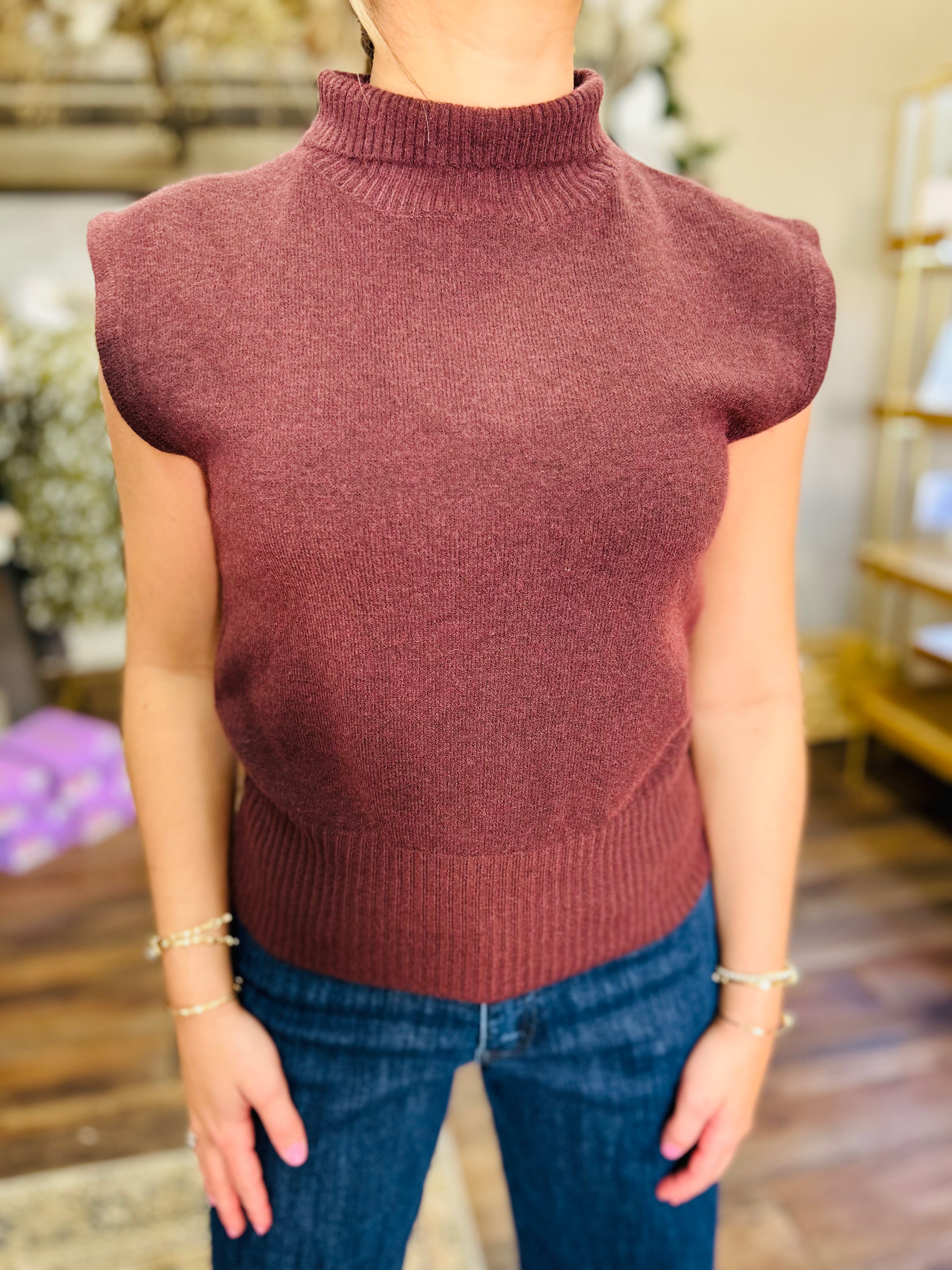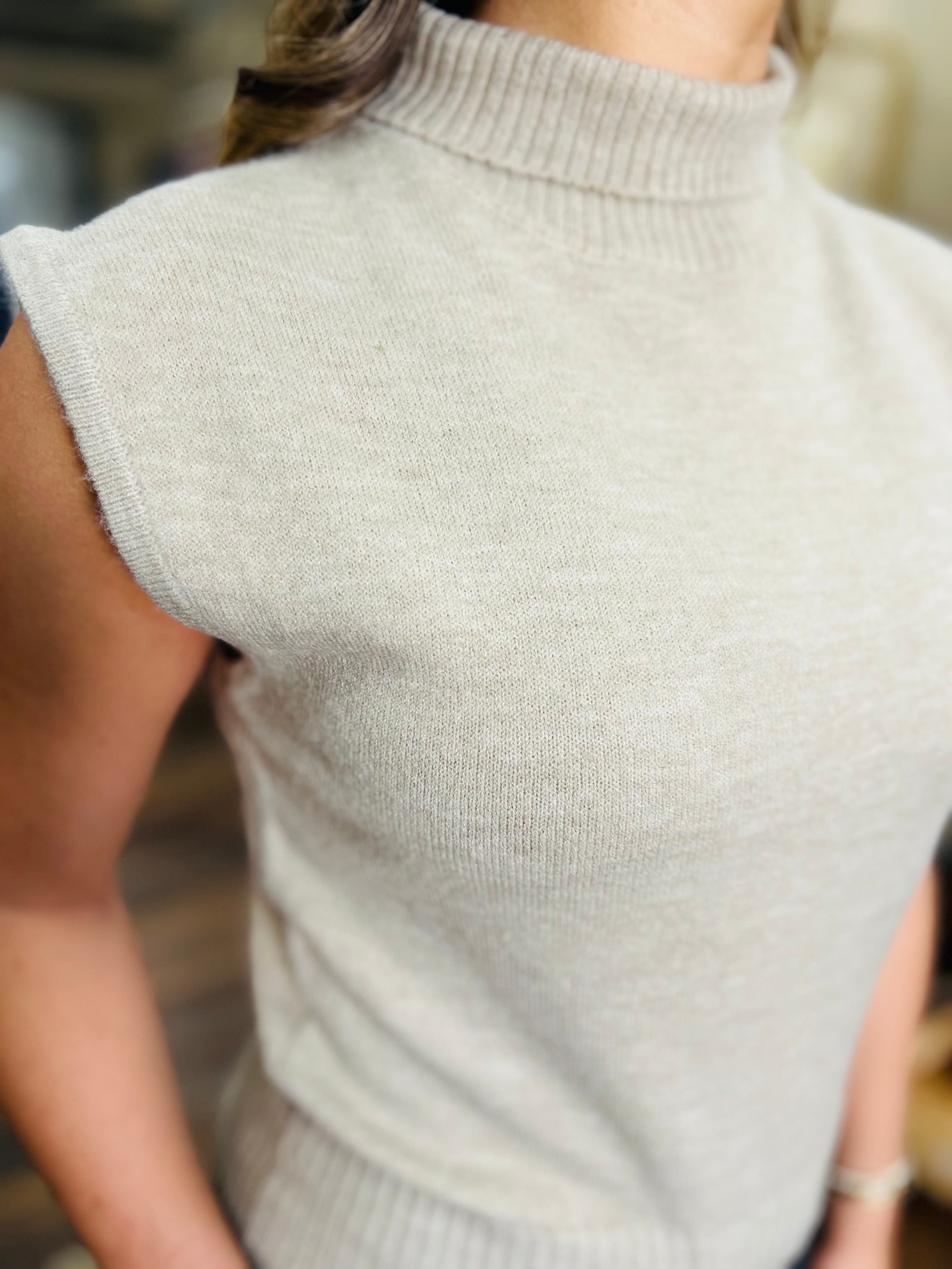 Embrace style with the "Sleeveless Sandy" knit top featuring a fitted high neck and slightly extended shoulders for a relaxed, comfortable fit. The ribbed hem hugs the body for a sleek silhouette. Perfect for layering or wearing alone, it pairs effortlessly with skirts or trousers. Its minimalist design adds subtle sophistication, ideal for casual outings.