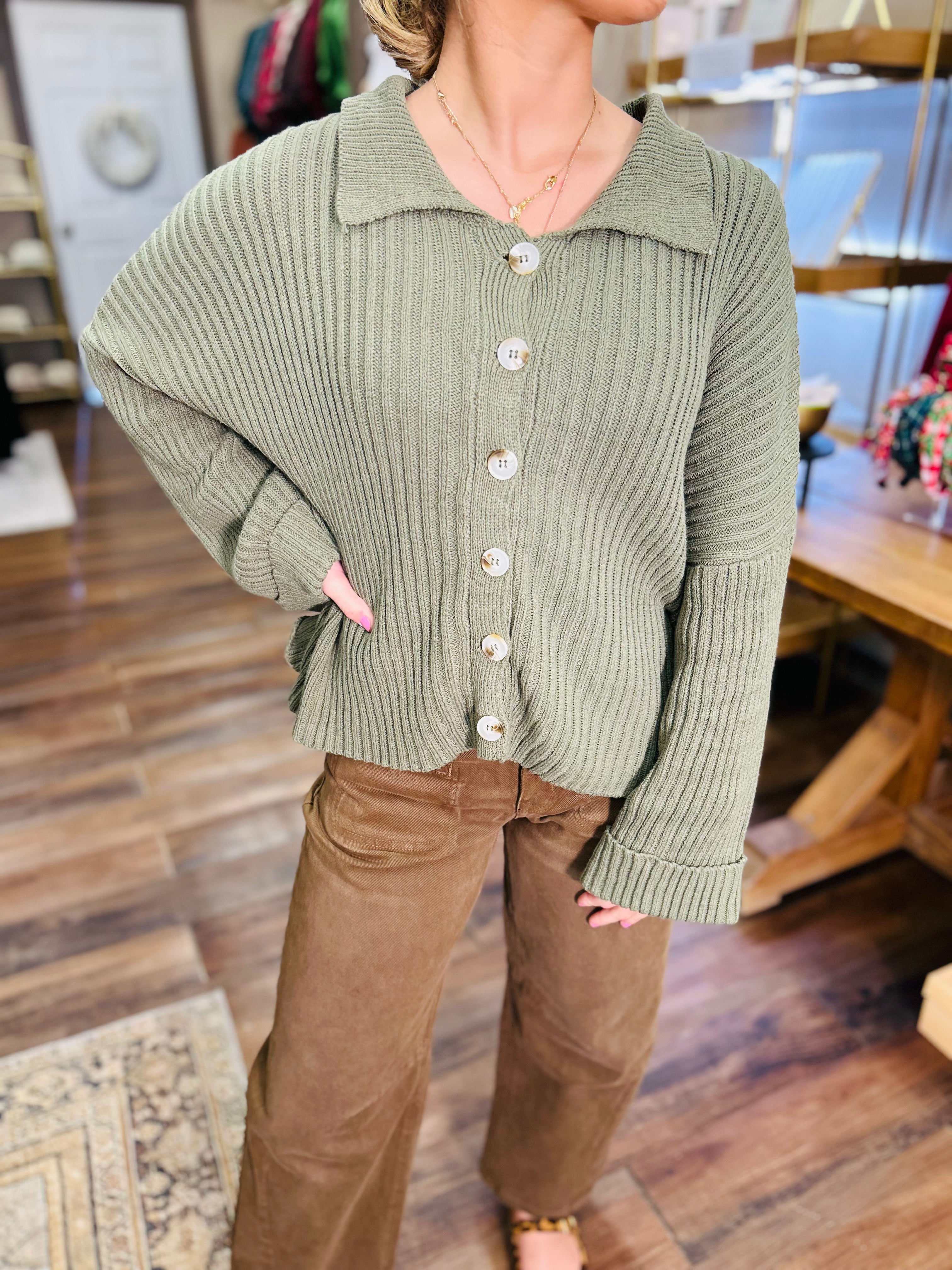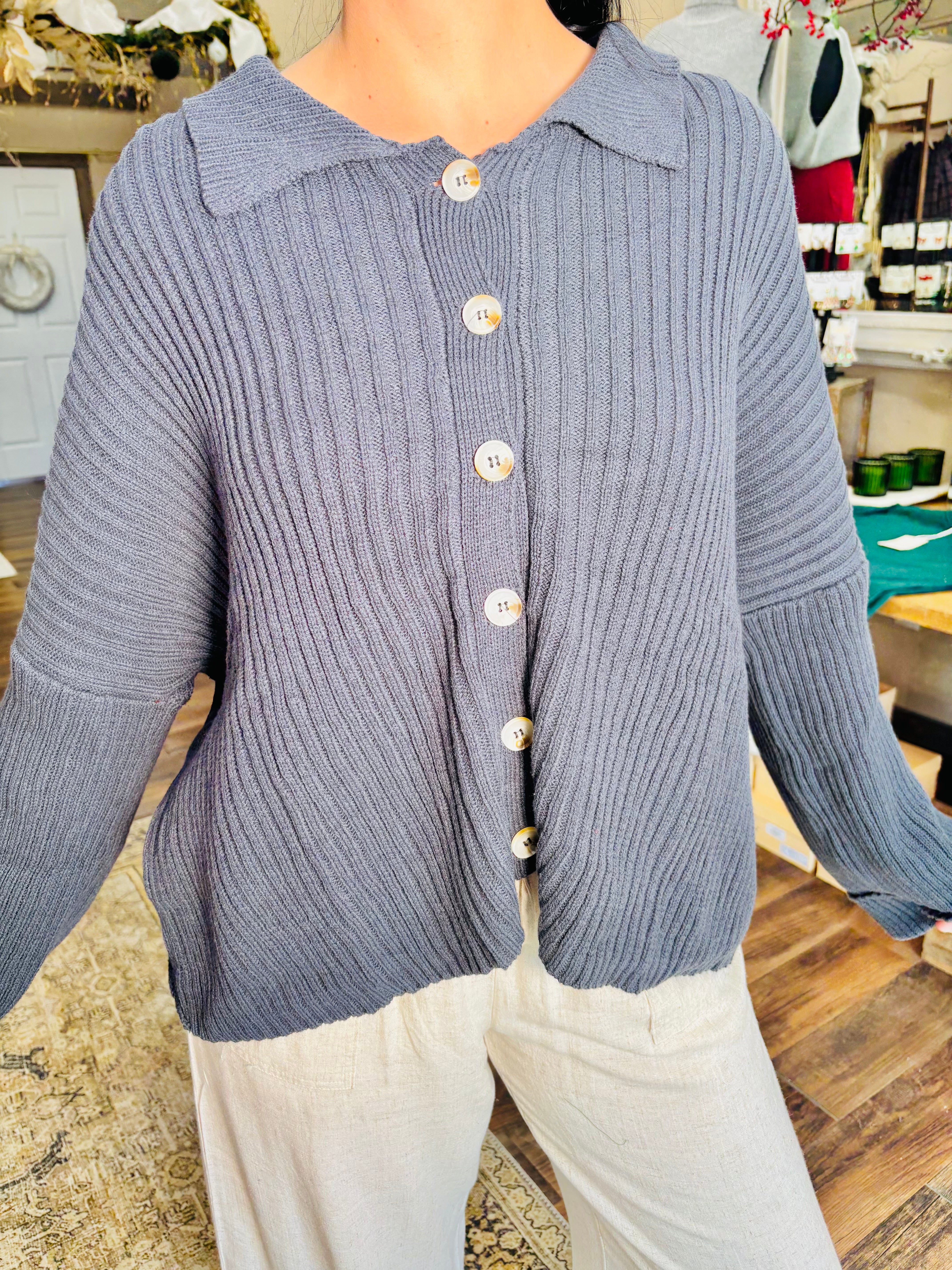 Cozy meets cool in the Wren Ribbed Sweater, featuring a classic collared button-down design with long sleeves and a flattering ribbed texture. Available in warm caramel, deep navy, and earthy olive, it’s the perfect playful layer to brighten up any outfit while keeping you snug all day long.